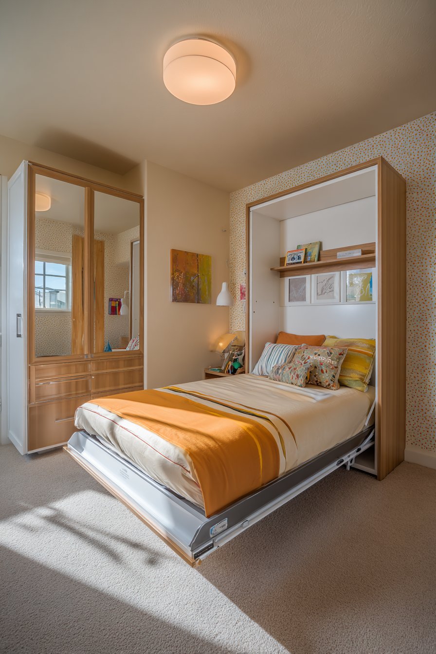 Murphy bed systems offer ultimate flexibility in compact spaces. The bed folds up to reveal play areas during daytime. When deployed, side storage compartments hold bedtime books. A small reading light integrates into the system. Warm cream walls create neutral foundations for design.