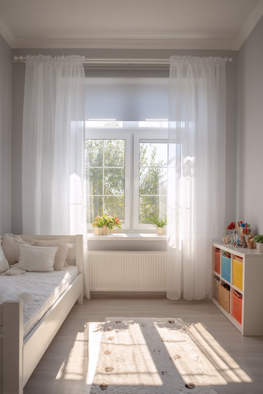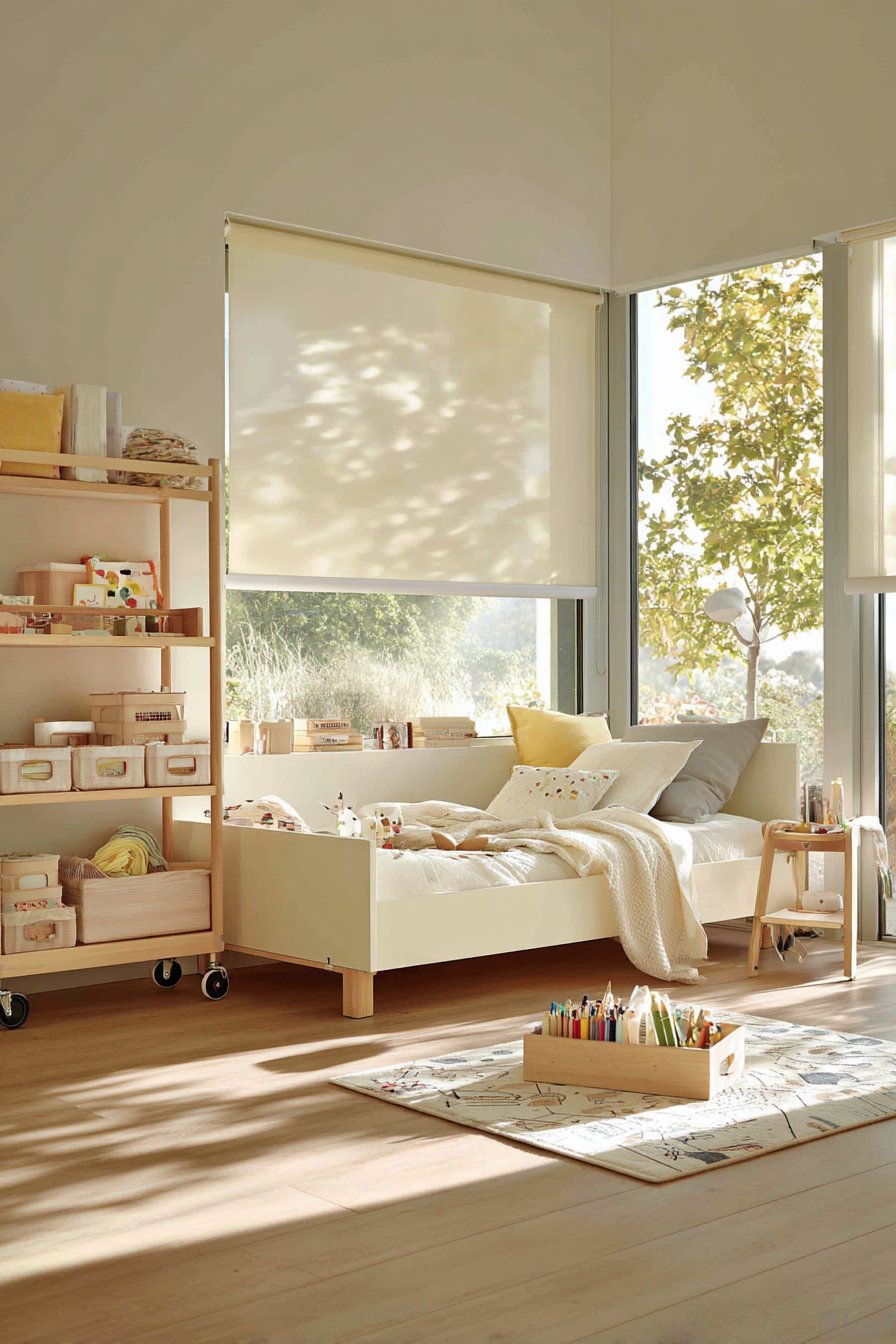 Low platform beds suit young children perfectly. The white-painted wood frame positions beneath windows. Natural light floods the sleeping area throughout the day. Sheer roller blinds in soft grey provide privacy. The blinds maintain brightness while offering light control.