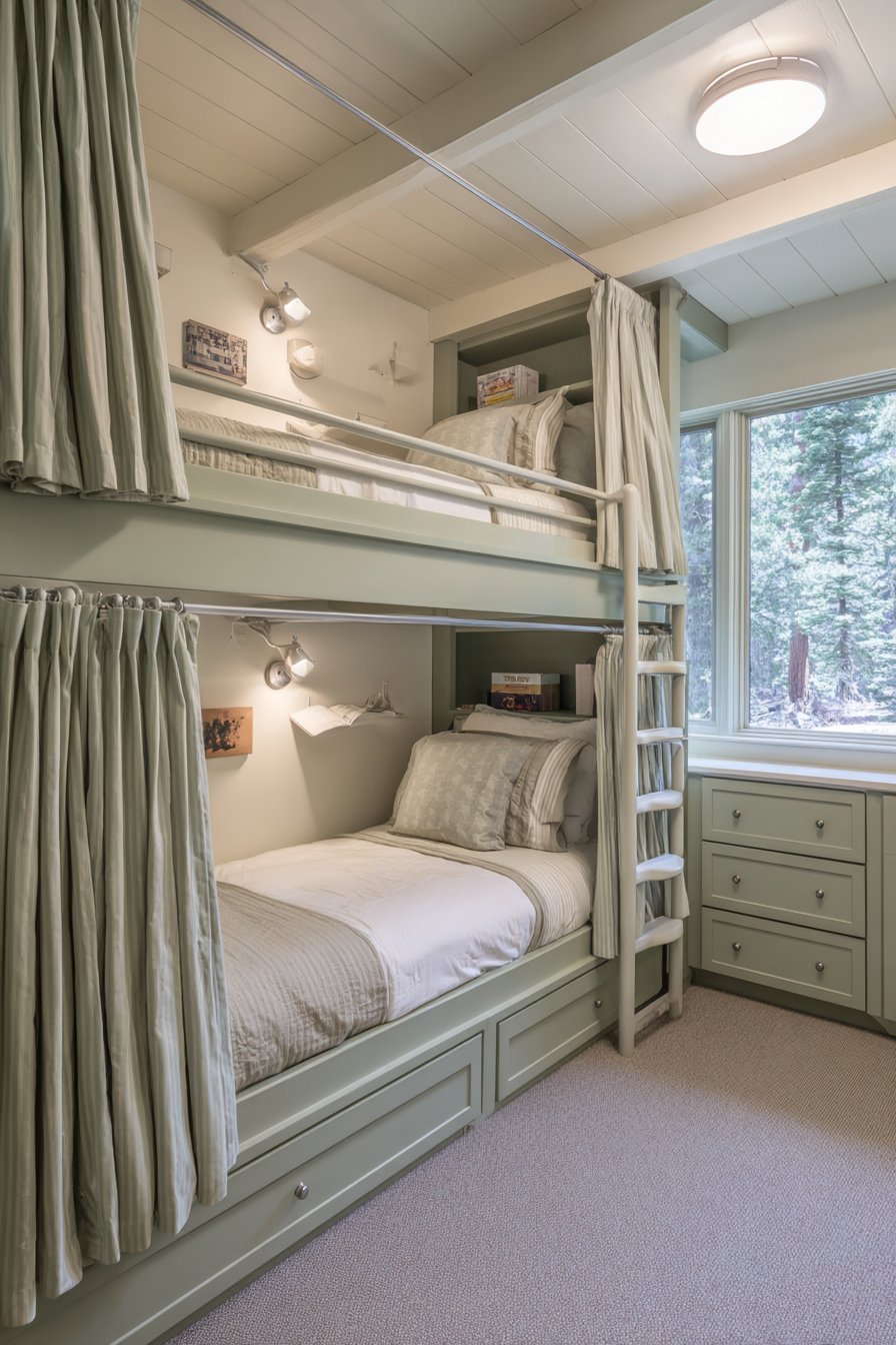 The curtain creates a cozy den feeling for younger children. Soft sage green walls keep the room feeling open. Simple white trim adds architectural detail. A narrow dresser fits between bunks and window. Cotton bedding in coordinating neutrals maintains visual calm.