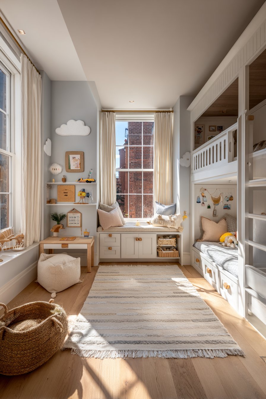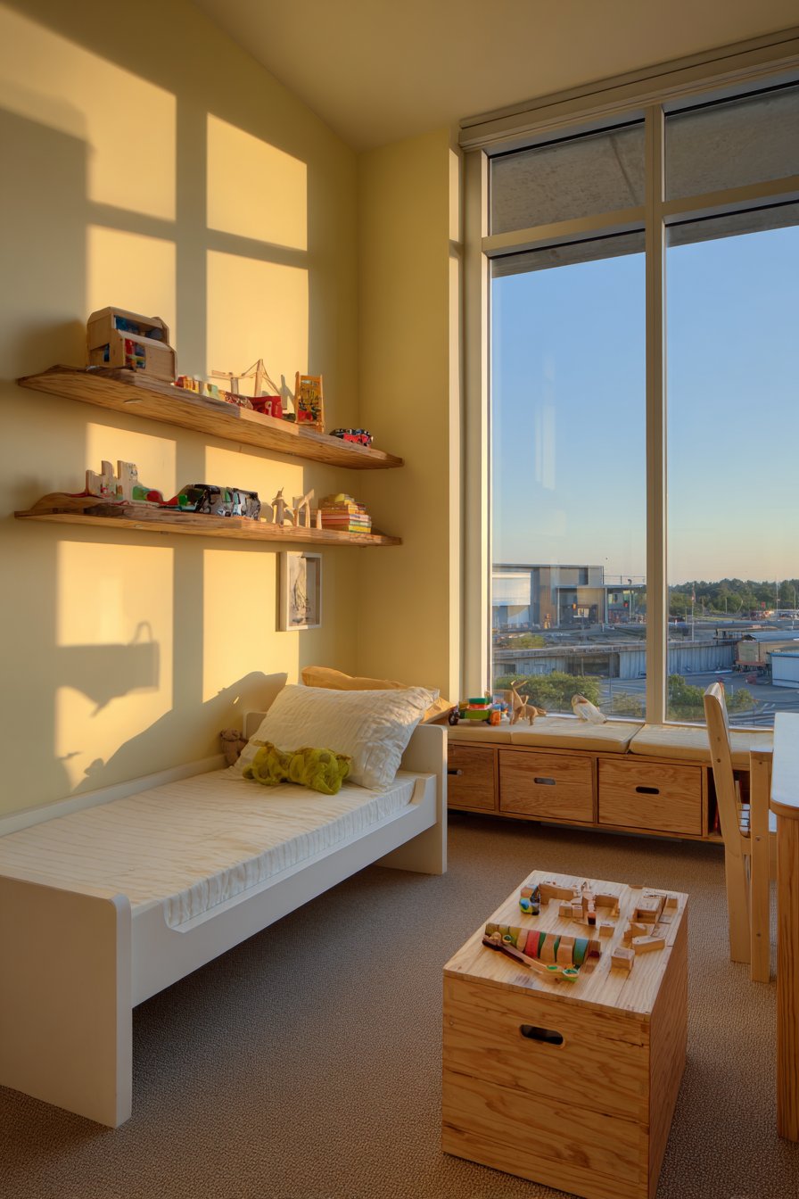 Afternoon natural light fills the uncluttered space beautifully. The thoughtful balance between storage and openness shows clearly. Minimalist approaches suit active children perfectly. Clear floors invite imaginative play and movement. The design prioritizes function over decoration successfully.