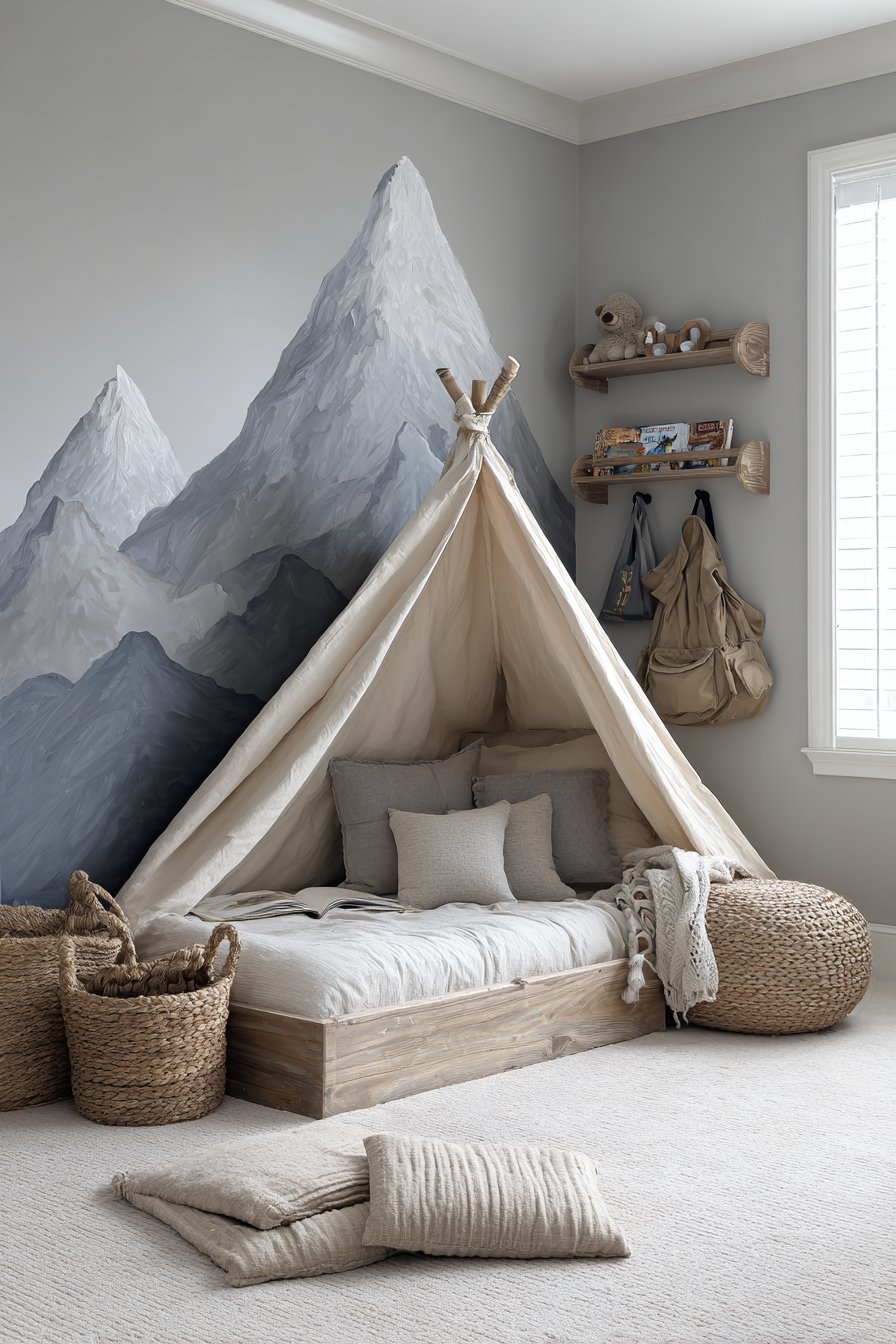 Soft grey walls provide neutral backgrounds throughout. One accent wall features hand-painted mountain murals. The muted tones maintain calming atmosphere. Hook rails at child height organize backpacks and jackets. Natural woven baskets store toys beneath beds.