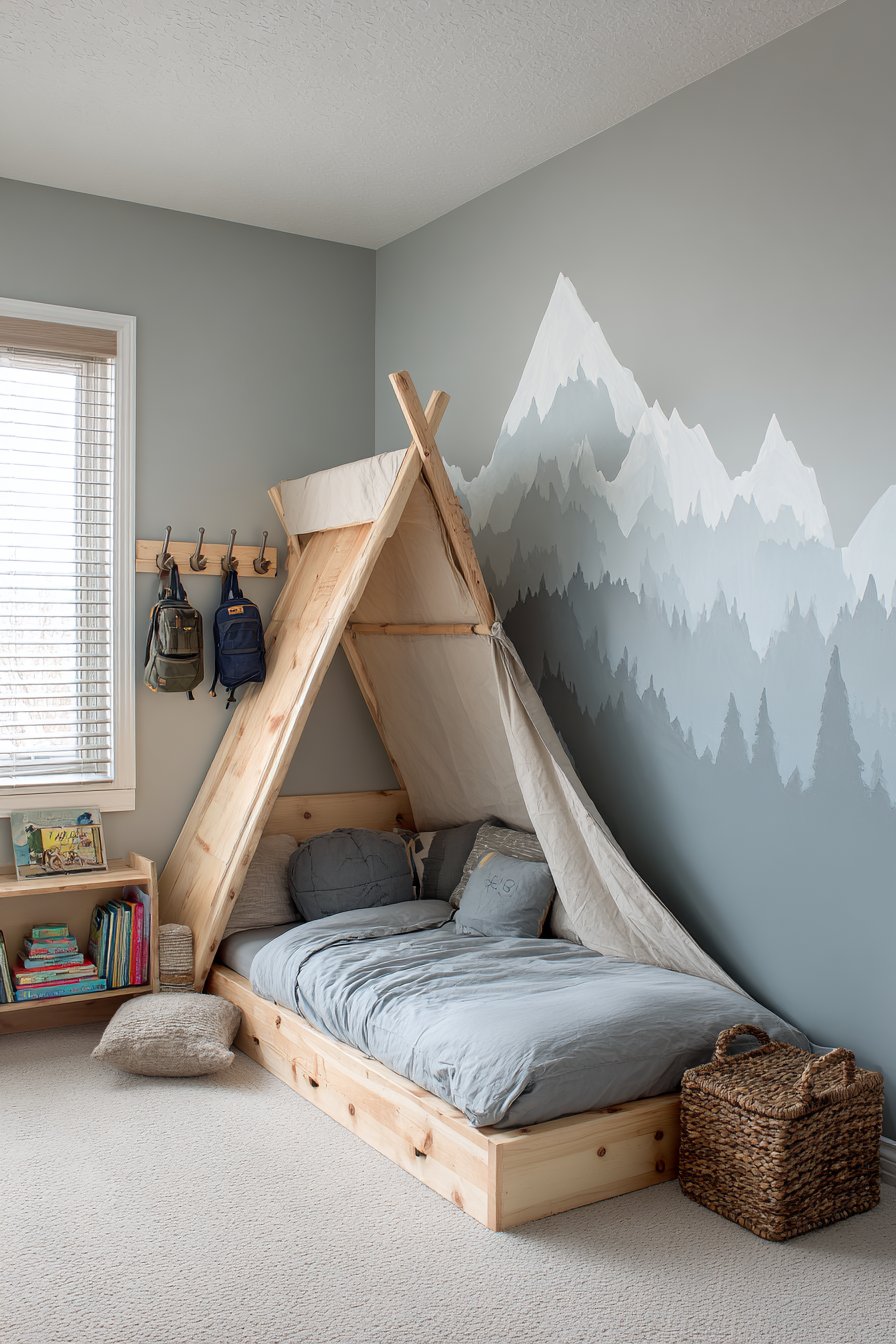 Simple elements create engaging spaces within tight dimensions. The tent canopy sparks imagination without permanent changes. Natural window light creates gentle shadows. The design proves adventure happens in small spaces. Thoughtful details transform ordinary rooms into special places.