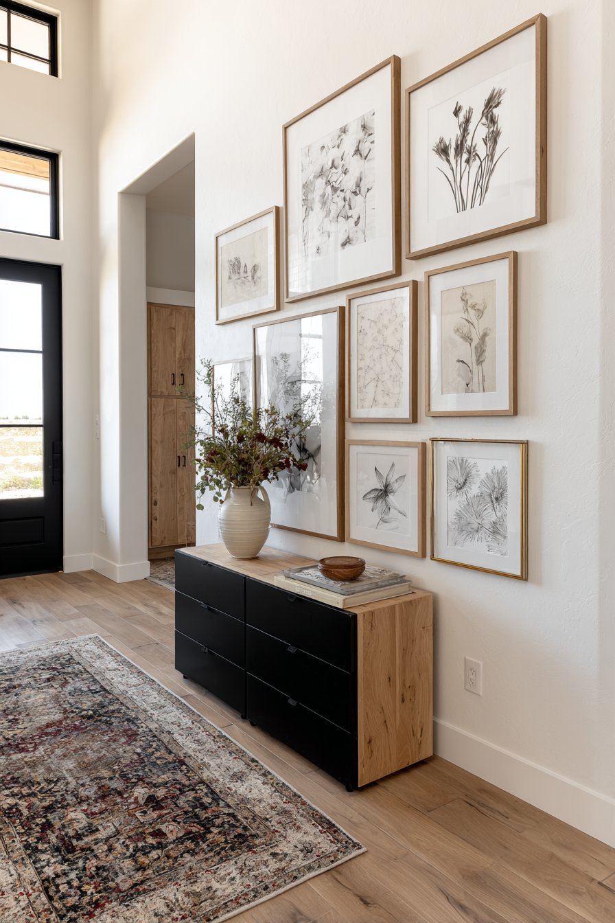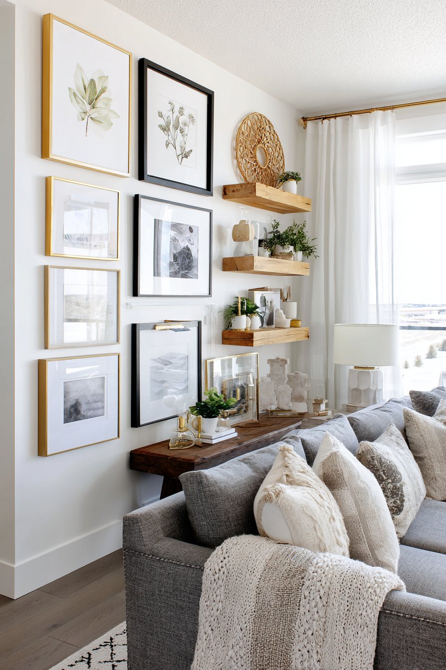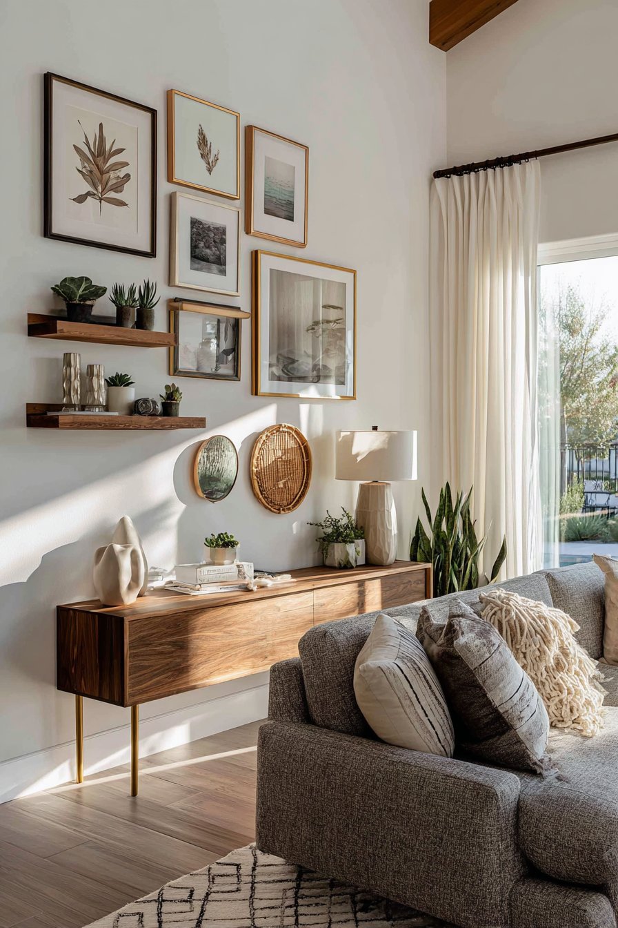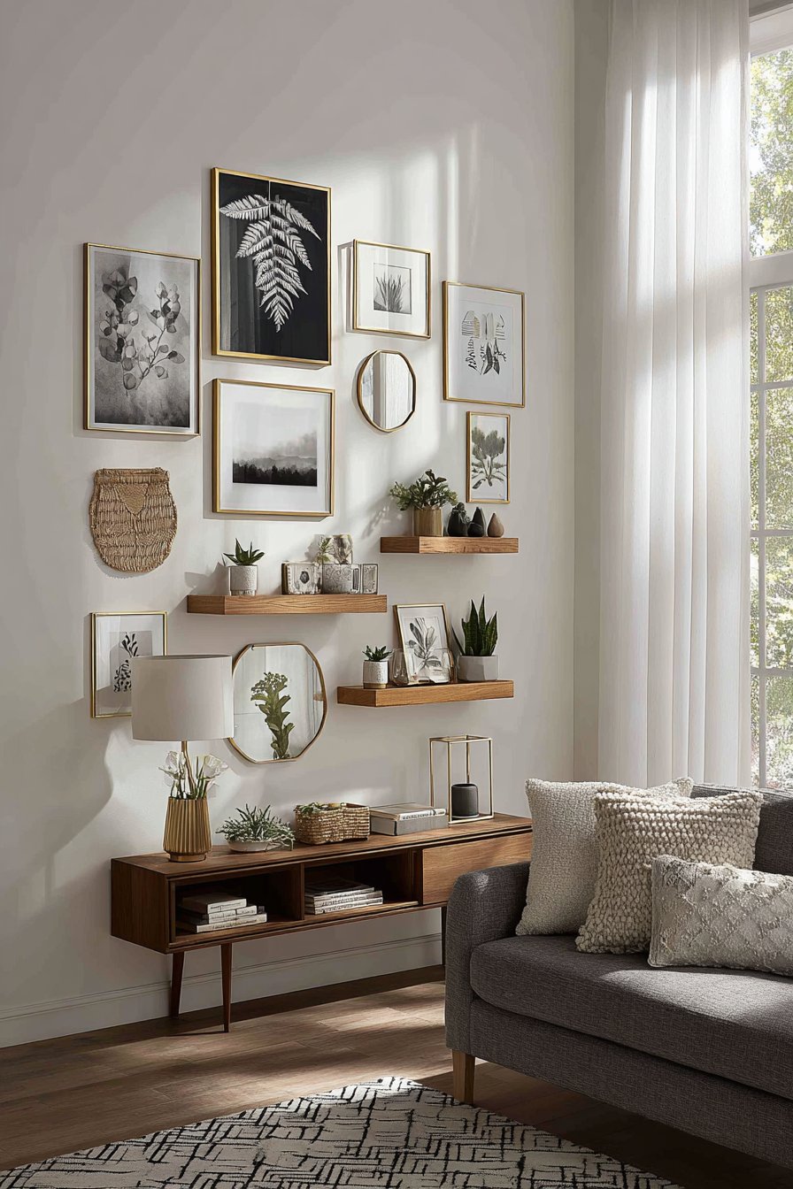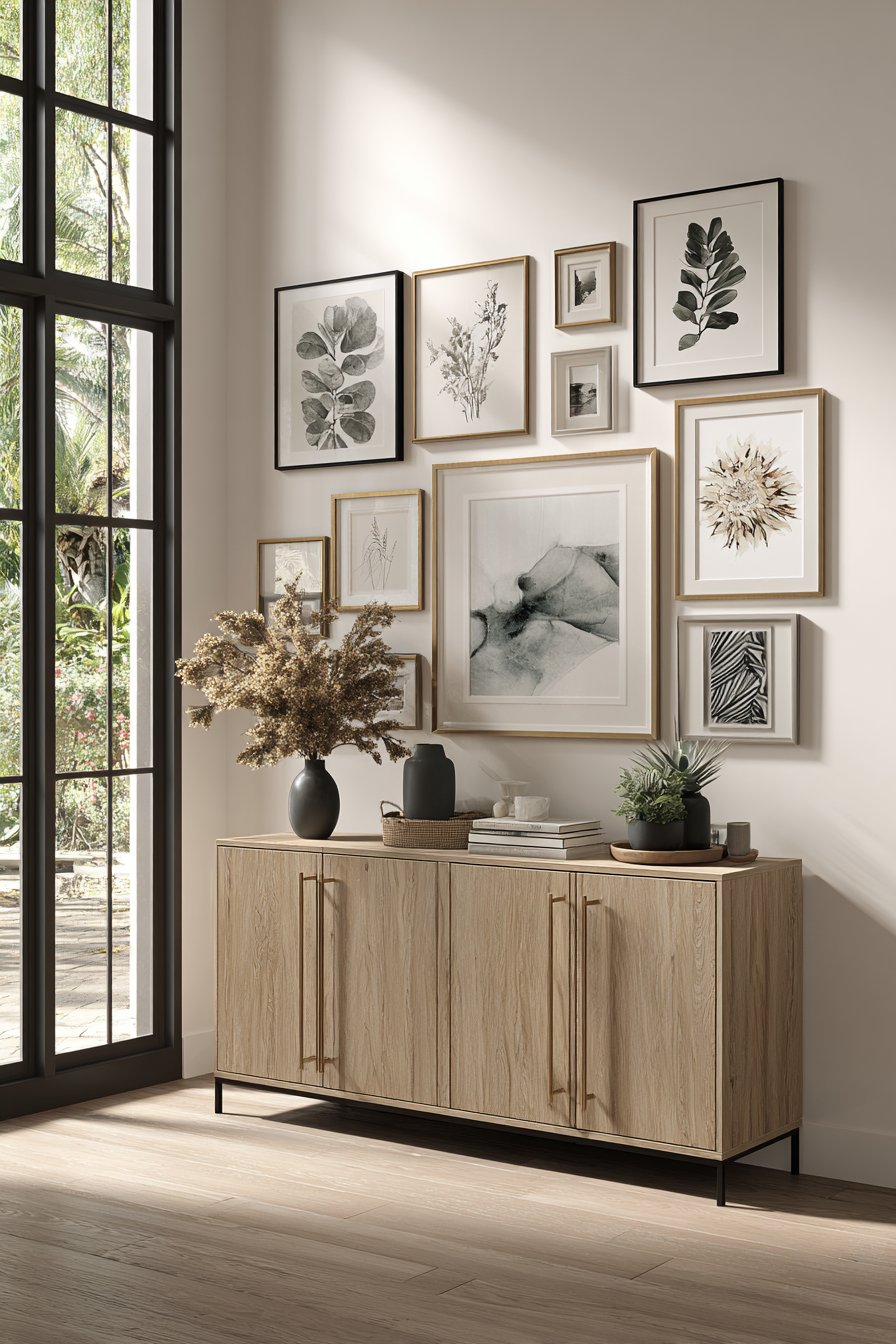 An eclectic gallery wall above a mid-century modern console creates instant sophistication. The arrangement features eight to ten pieces ranging from 5×7 to 11×14 inches. Mixed frame finishes include matte black, natural oak, and brushed brass. This variety creates visual rhythm without chaos.