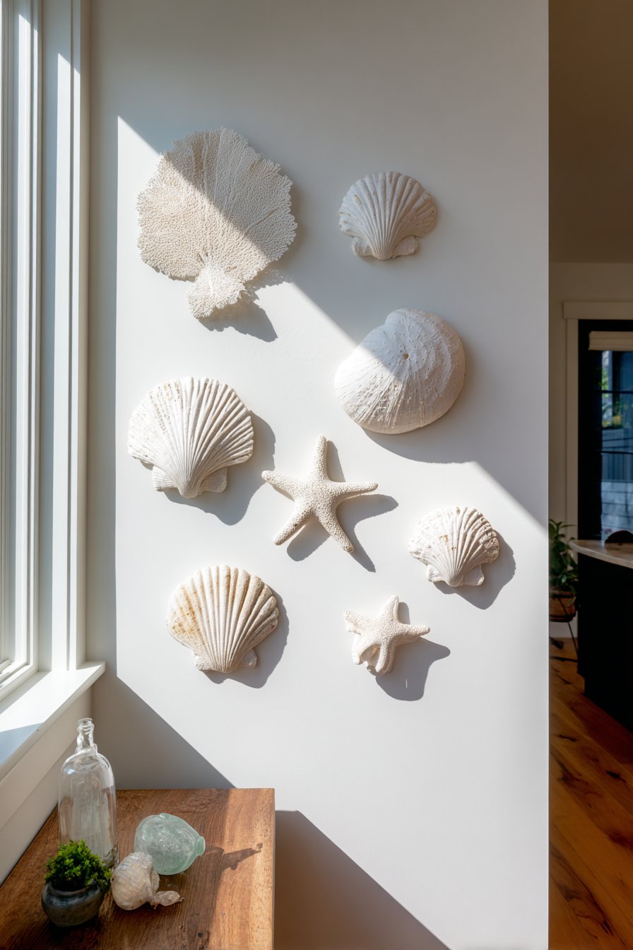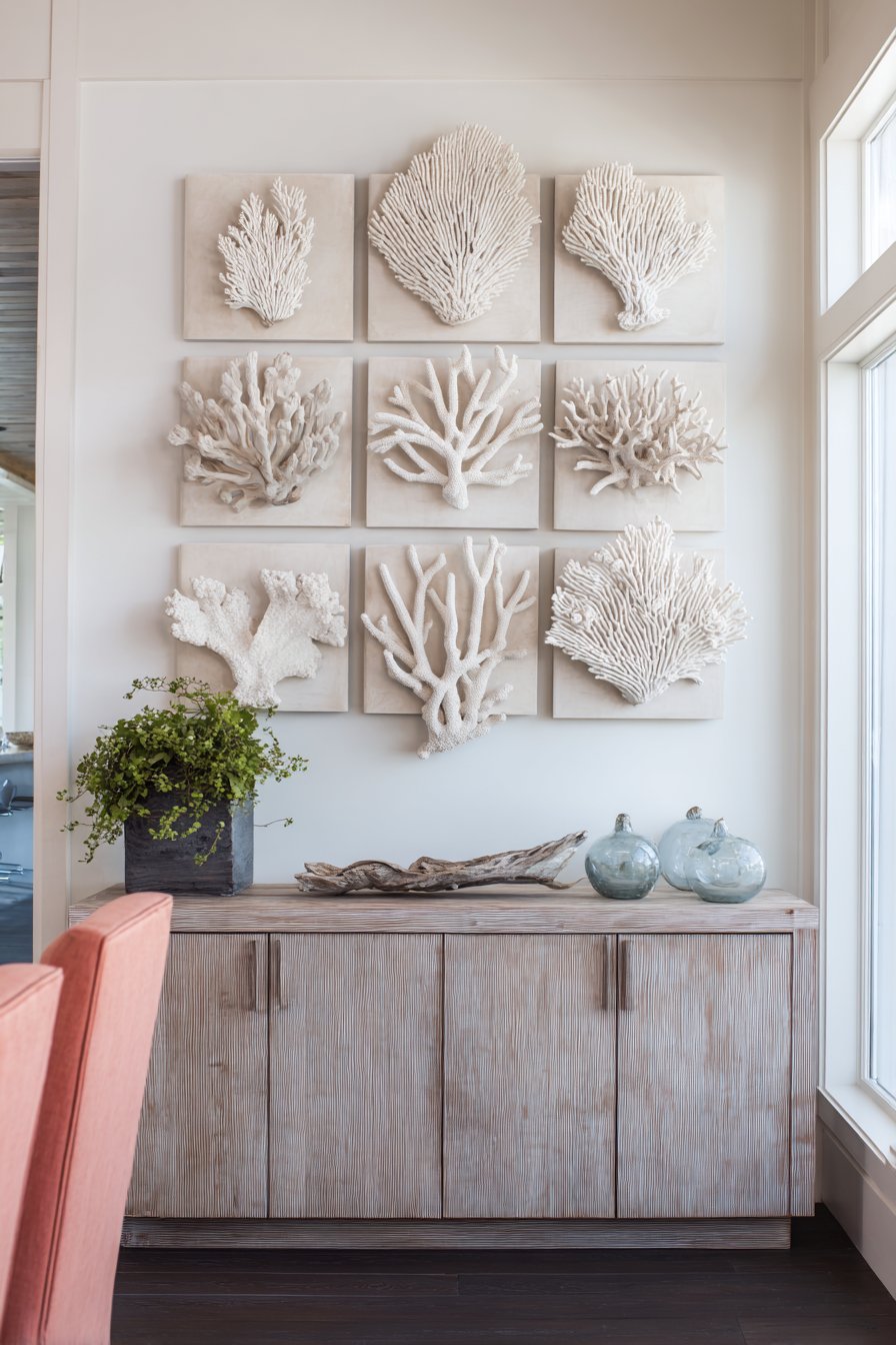 Natural daylight illuminates the dimensional quality of coral structures beautifully. Beach glass accessories on console create cohesive coastal vignette. This approach celebrates natural beauty without literal beach house clichés. The sophisticated restraint elevates coastal style beyond typical nautical themes.