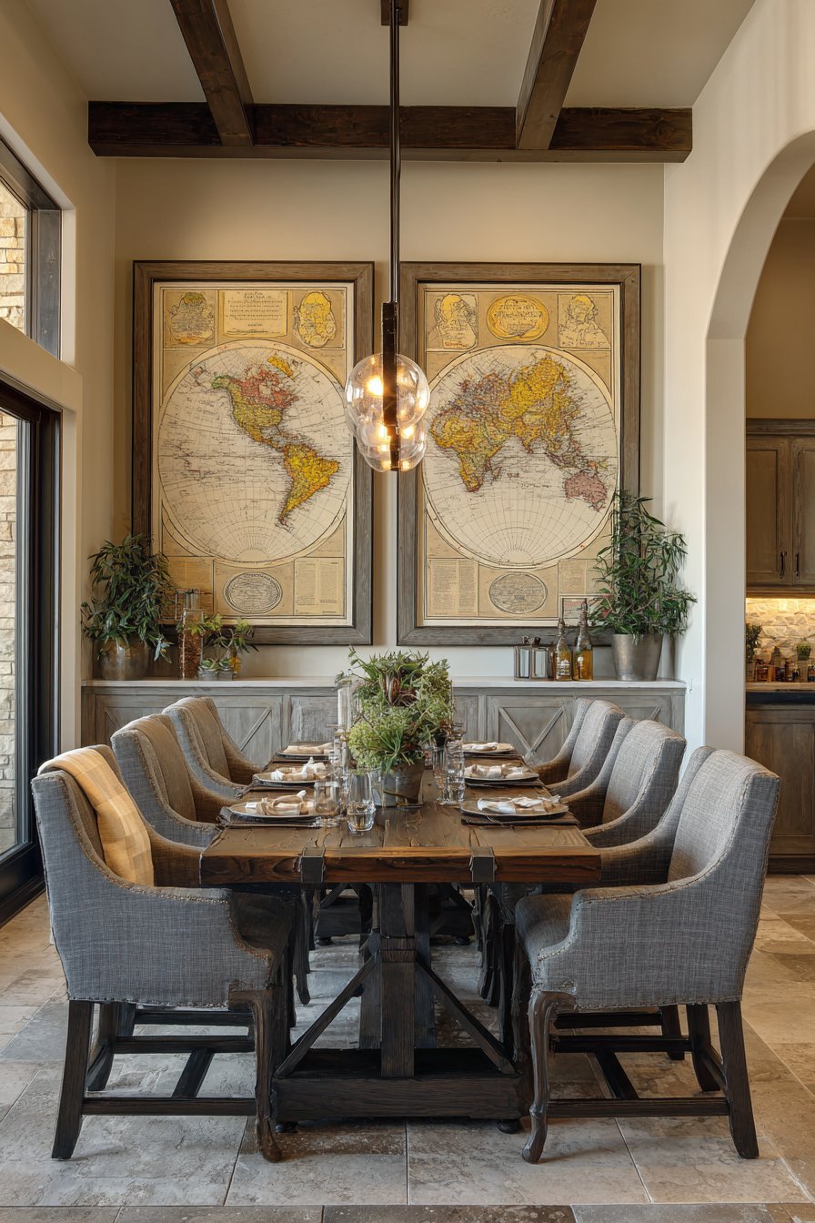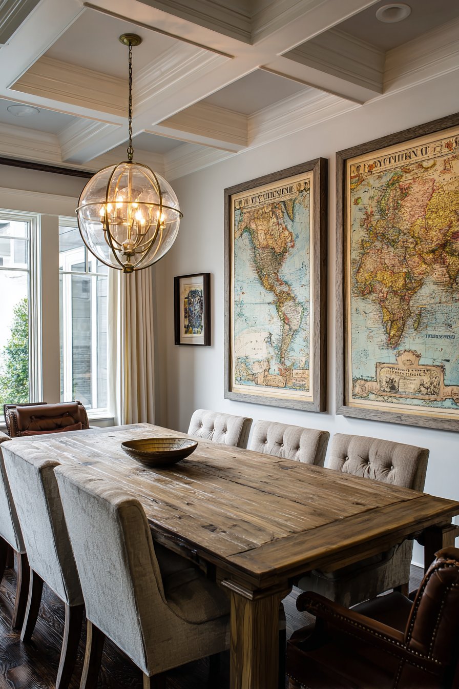 Warm overhead chandelier lighting creates subtle highlights on glass and frames. The symmetrical placement brings formal balance to the dining space. The vintage maps add intellectual interest and conversation-starting points. The distressed frames complement both traditional and contemporary furnishings.