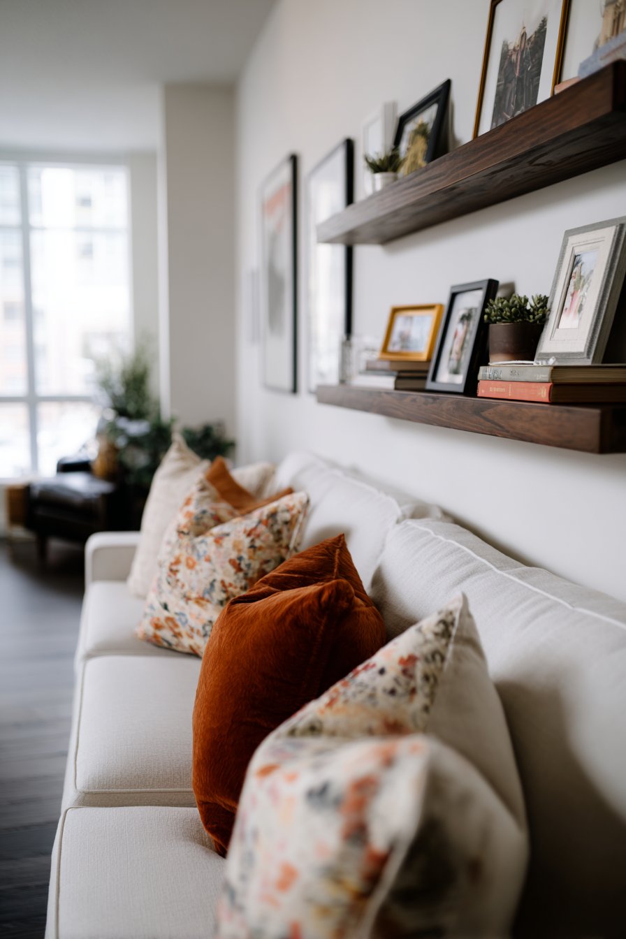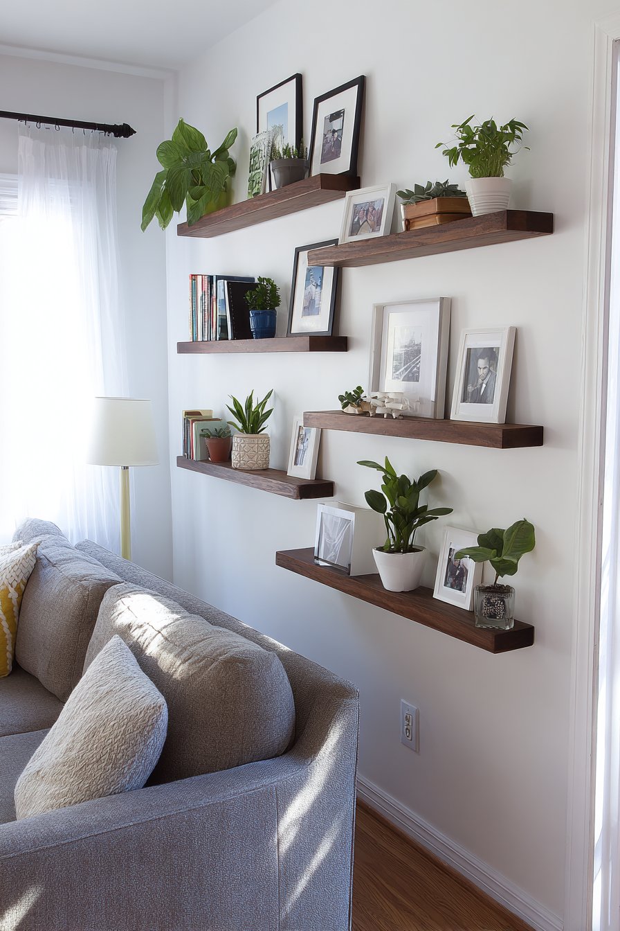 A small apartment living room features floating ledge shelf in walnut. The shelf measures 30 inches long and 4 inches deep. Styled with rotating display of small framed photos in various sizes. Small potted plants and miniature art books complete the flexible arrangement.