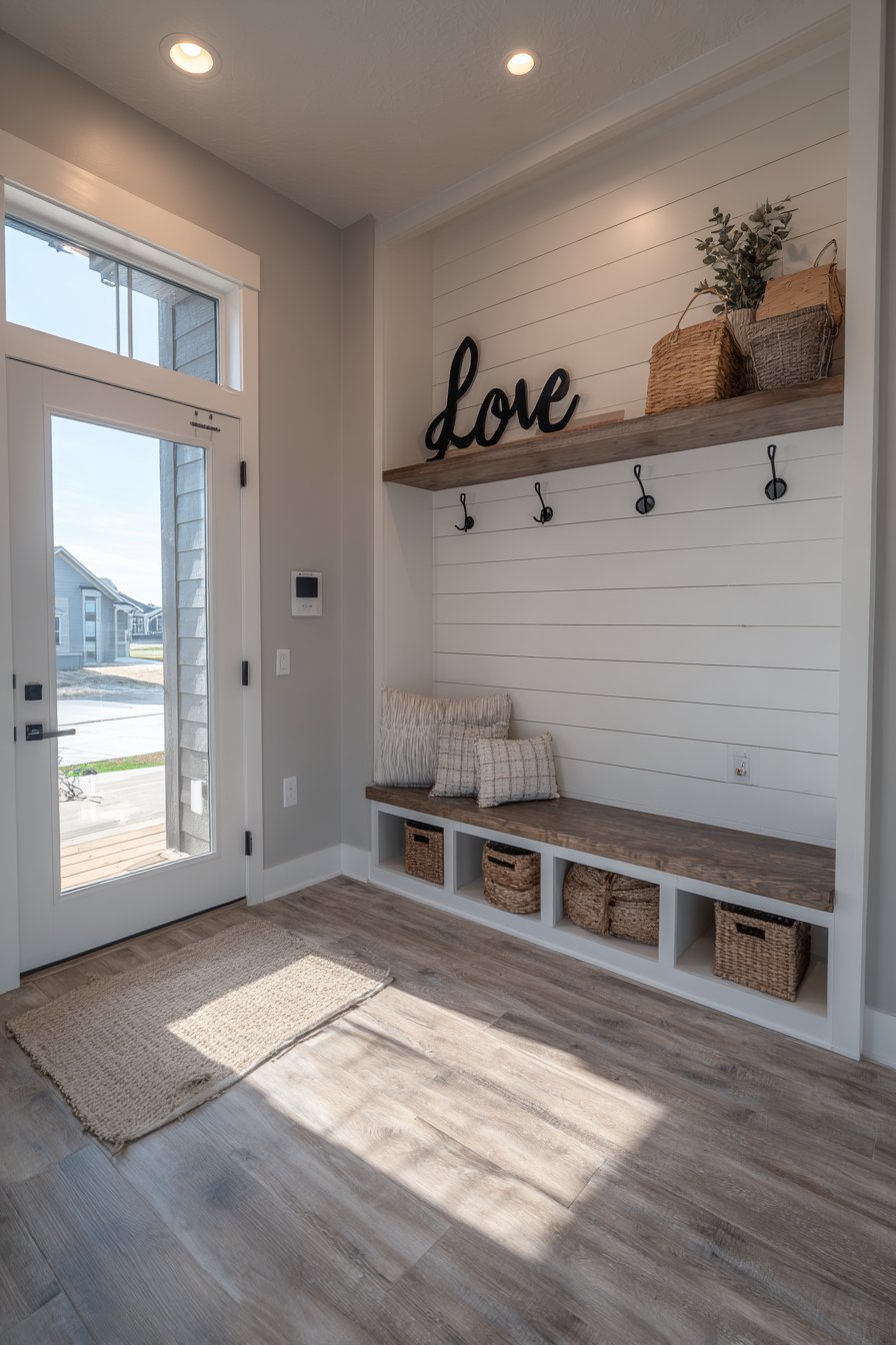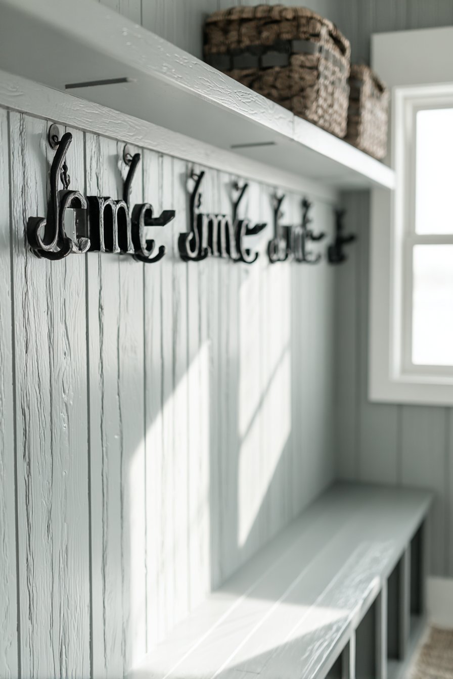 A modern farmhouse mudroom features individual metal letter hooks spelling family name. Each letter measures 5 inches tall in matte black finish. Horizontal line mounting above bench provides functional hanging space. Soft gray shiplap walls add texture behind the letters.
