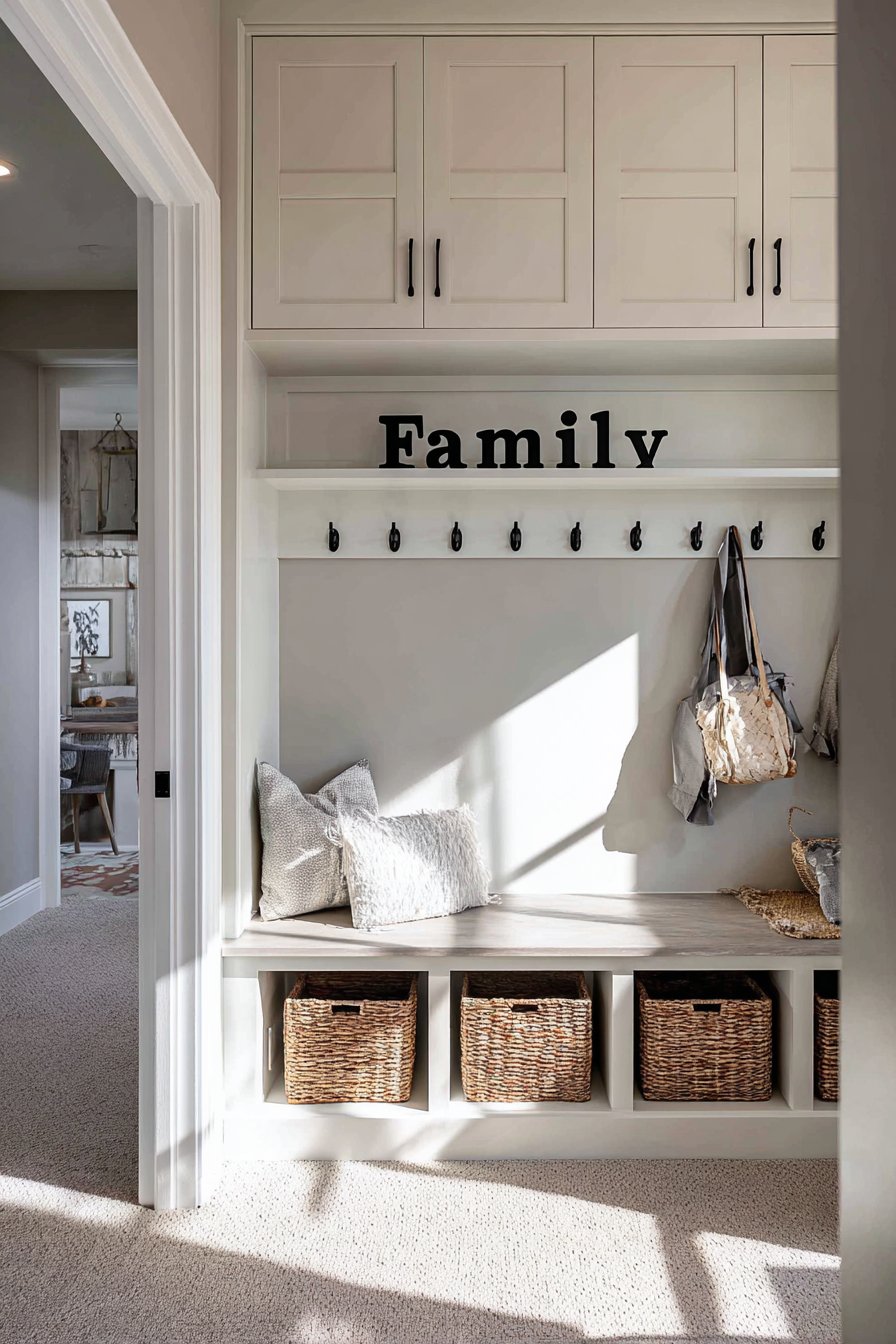 The letter hooks serve both decorative and functional purposes beautifully. They provide hanging space for keys and small lightweight bags. Natural light from nearby door creates shadows emphasizing three-dimensional forms. The personalization adds unique character to utilitarian space.