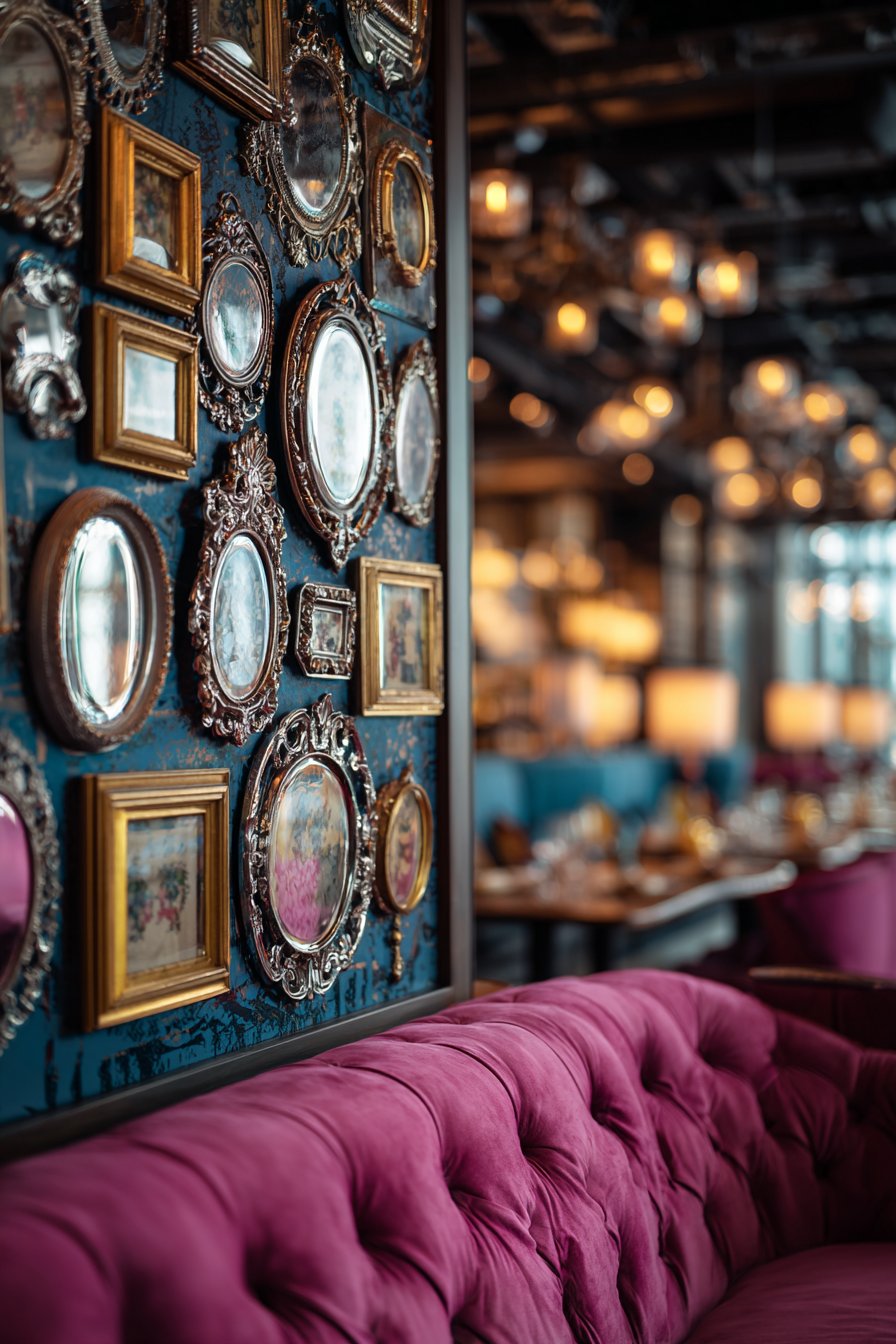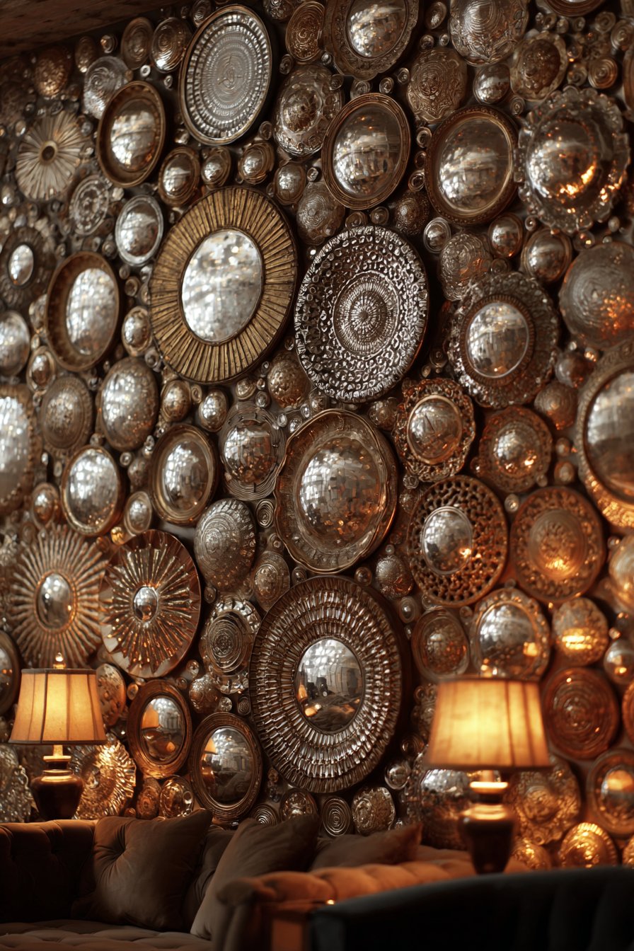 Jewel-toned velvet furniture provides sumptuous backdrop for metallic collection. Ambient table lamp lighting creates glints and reflections across varied surfaces. The collected-over-time aesthetic celebrates abundance and personality. Each mirror adds individual character while contributing to cohesive whole.