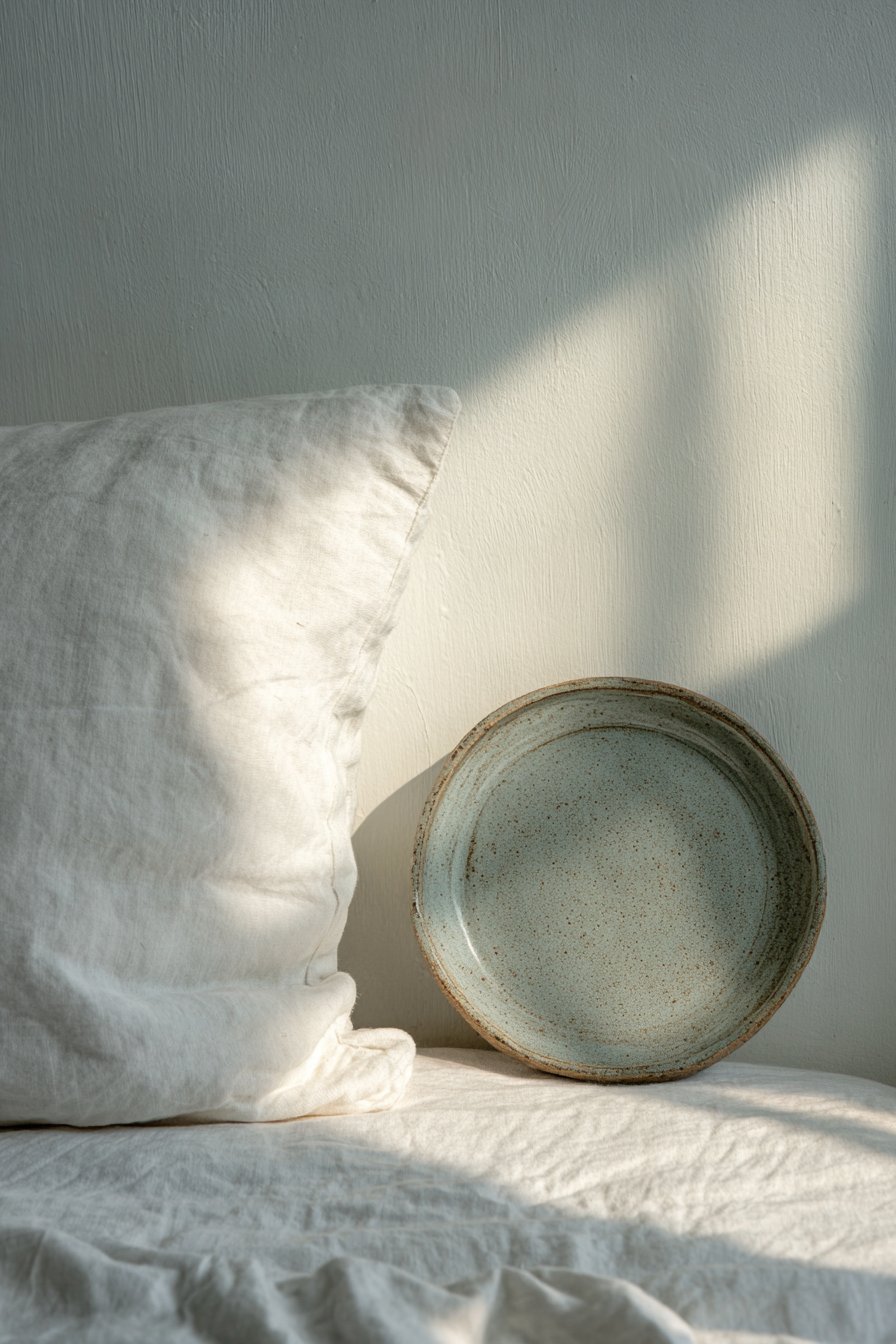 A Japandi-style bedroom features single ceramic wall plate measuring 9 inches diameter. Minimalist abstract glaze in muted blue-gray tones creates subtle beauty. Plain off-white wall mounting beside bed embodies intentional simplicity. The handmade ceramic shows subtle glaze variations and organic imperfections.