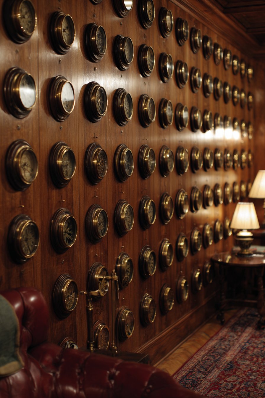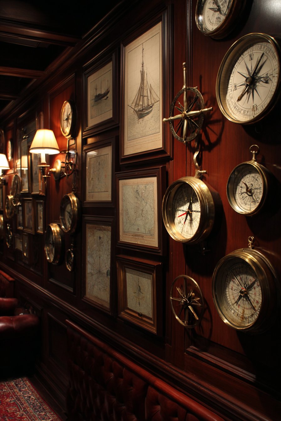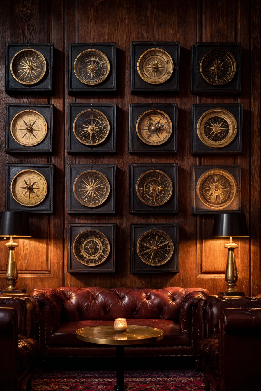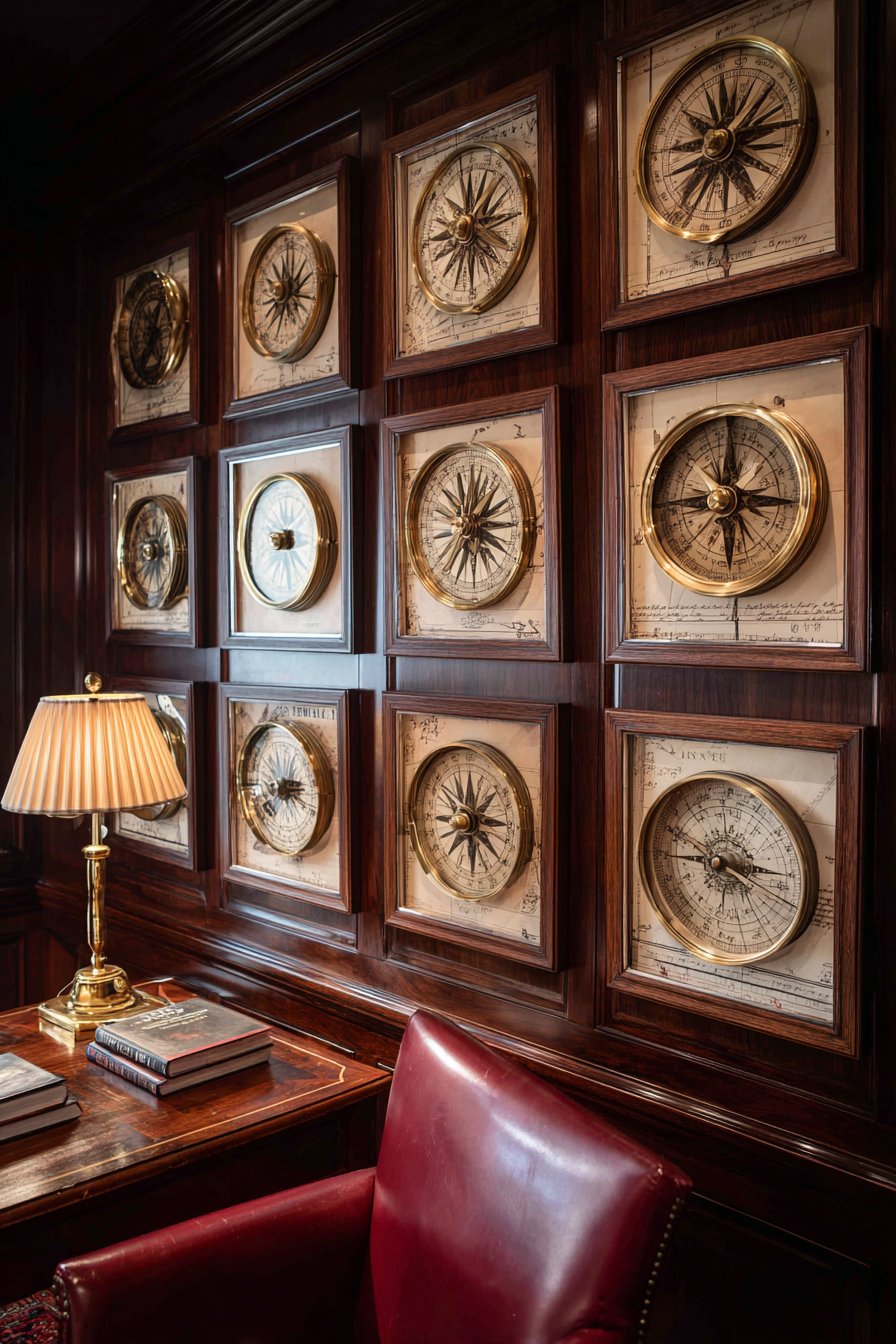A traditional study displays antique brass compasses and nautical instruments. Pieces measure 4 to 8 inches mounted on dark mahogany plaques. Formal grid pattern arrangement adds scholarly sophistication. Rich leather furniture and Persian rugs complement vintage nautical theme.