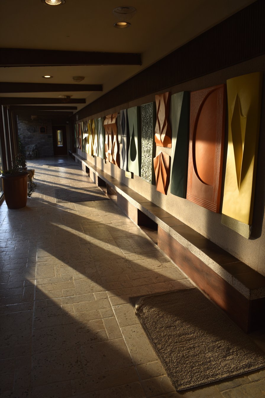 Dimensional relief patterns add tactile interest to each sculpture. Natural hallway end window light creates dramatic shadow play. The sculptural quality elevates hallway from passage to gallery space. The warm earth tones complement mid-century wood furniture perfectly.