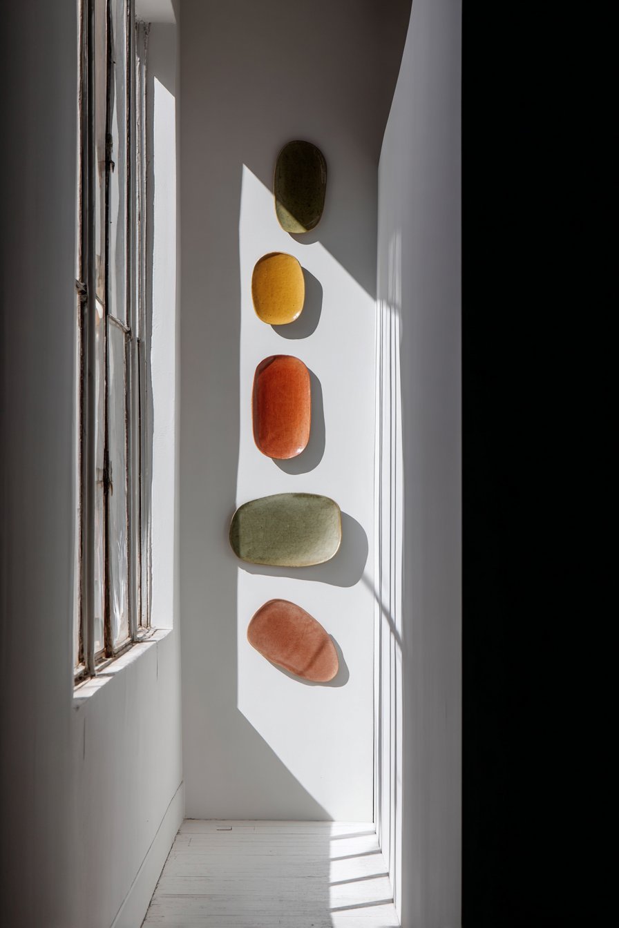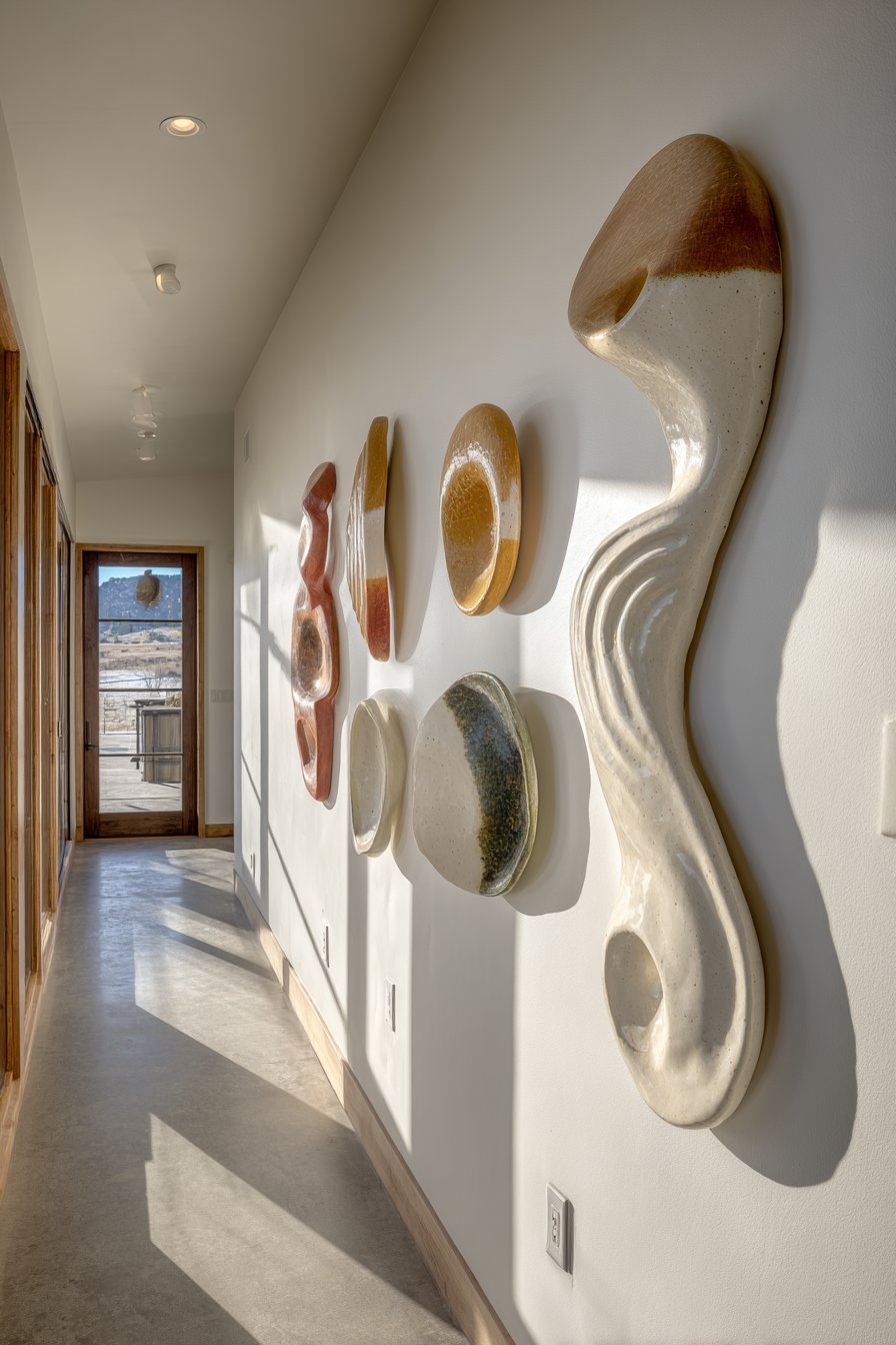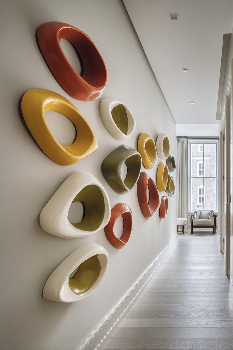 A mid-century modern hallway features six abstract ceramic wall sculptures. Each piece measures 6×8 inches with organic shapes. Matte glazes in mustard, terracotta, and olive tones create warm palette. Horizontal line arrangement creates rhythm along narrow corridor.