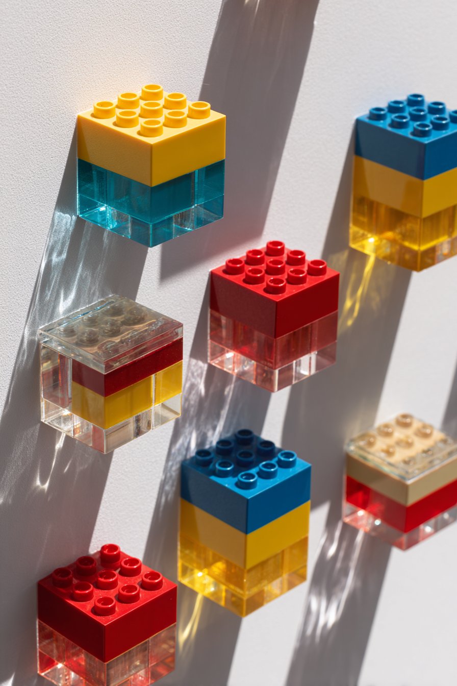 A children’s playroom showcases floating acrylic box frames measuring 8×8 inches. Each displays colorful LEGO or building block creations. Playful scattered pattern arrangement celebrates child’s creativity. Bright white walls allow colorful constructions to stand out vividly.