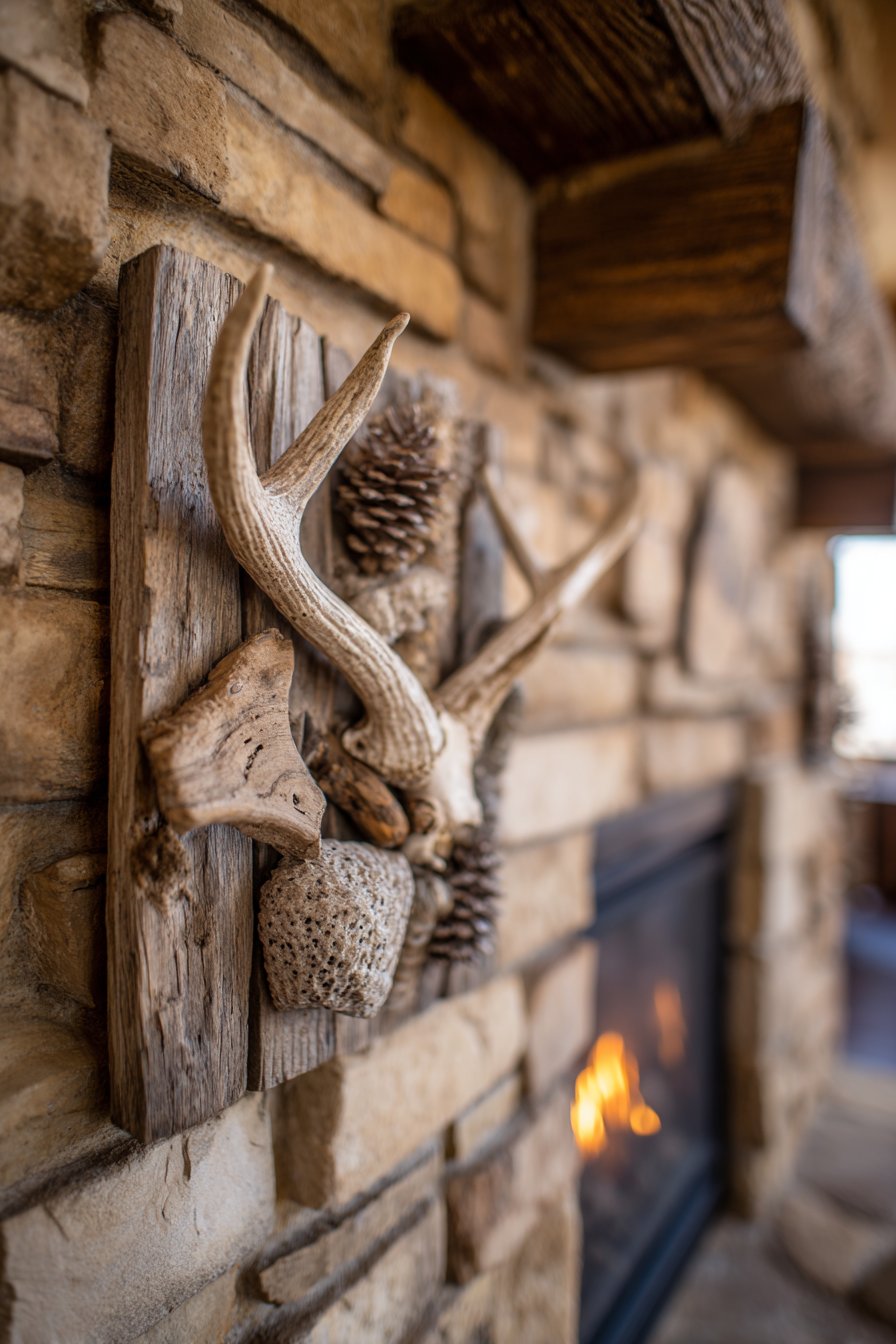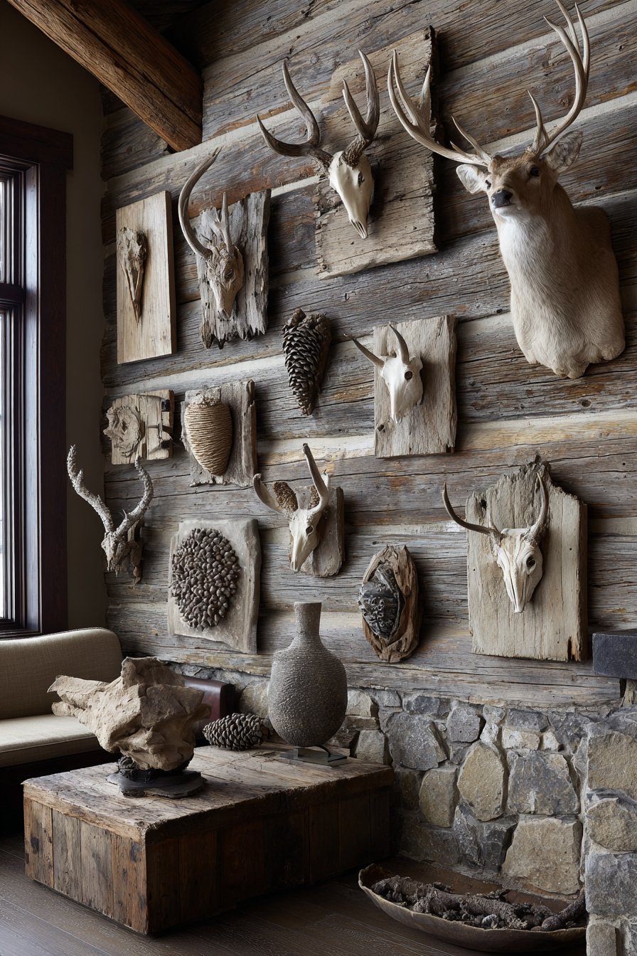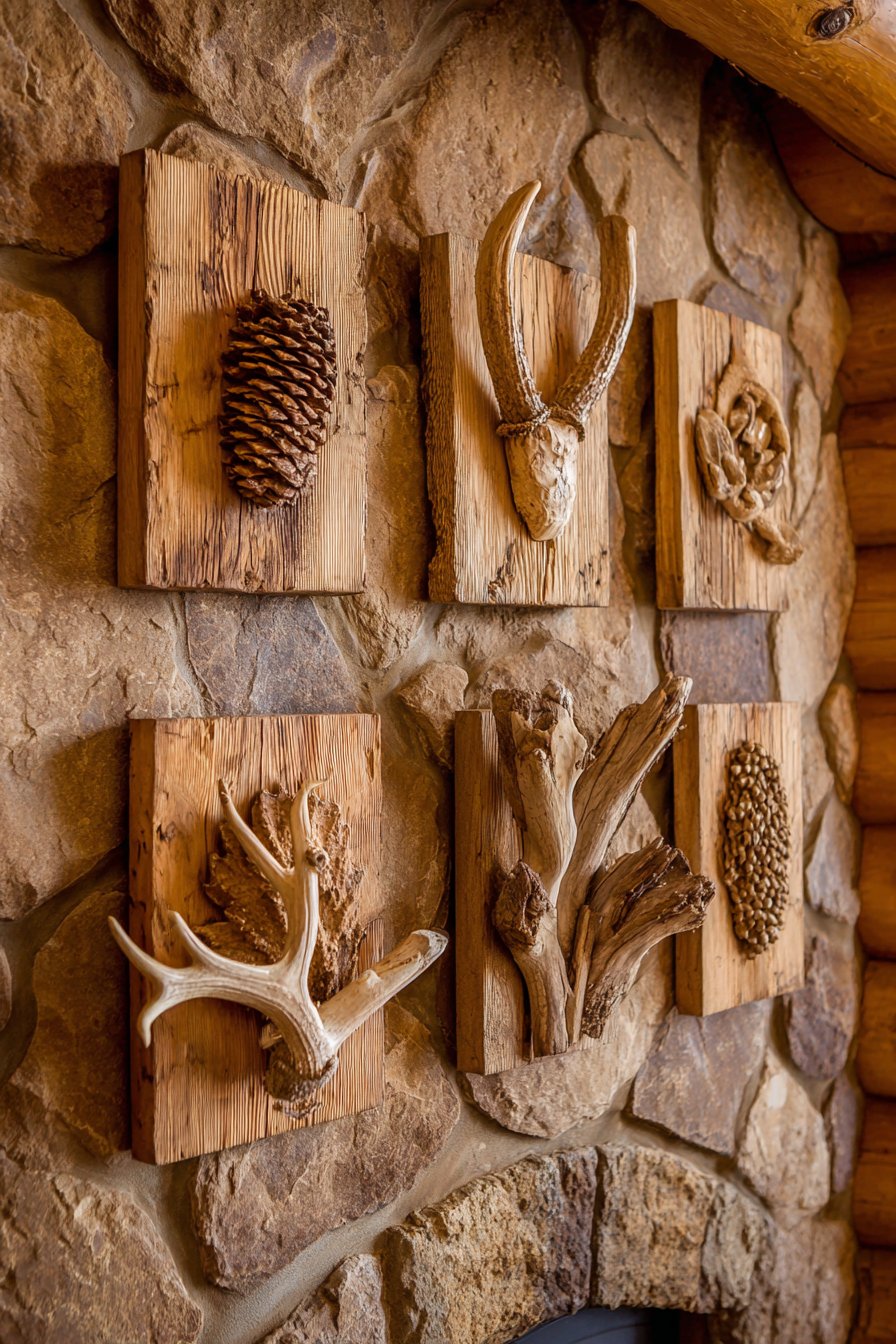 A rustic cabin living room features found natural objects individually mounted. Antlers, pine cones, and driftwood pieces mount on reclaimed wood backing. Boards measure 6×10 to 8×12 inches in varied sizes. Organic arrangement on log wall celebrates natural textures.