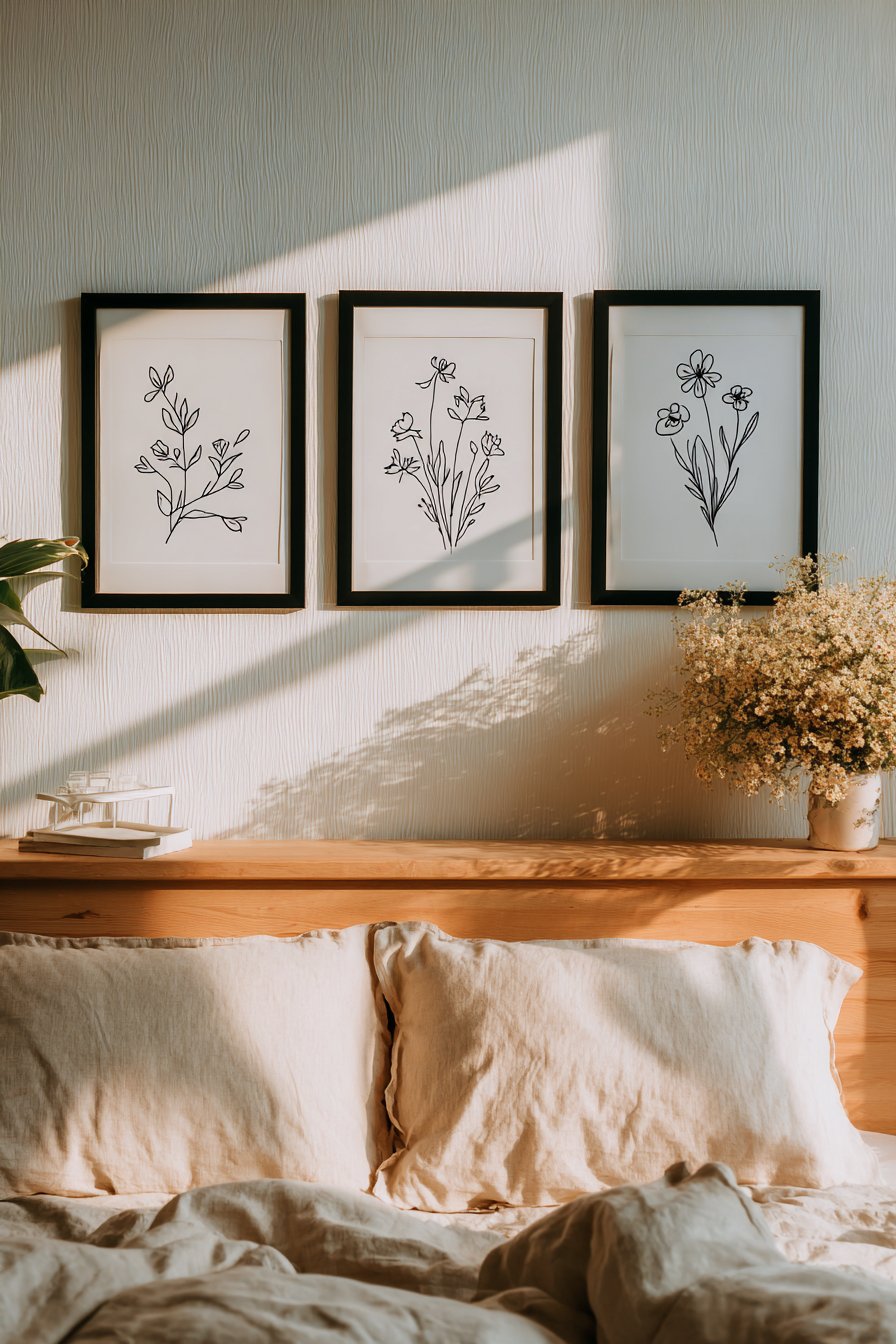 A minimalist bedroom features three matching 8×10 inch black frames with simple line drawings. The horizontal arrangement maintains perfect 4-inch spacing between each frame. This creates clean, intentional visual flow. The soft white textured wall provides ideal backdrop for the stark black frames.