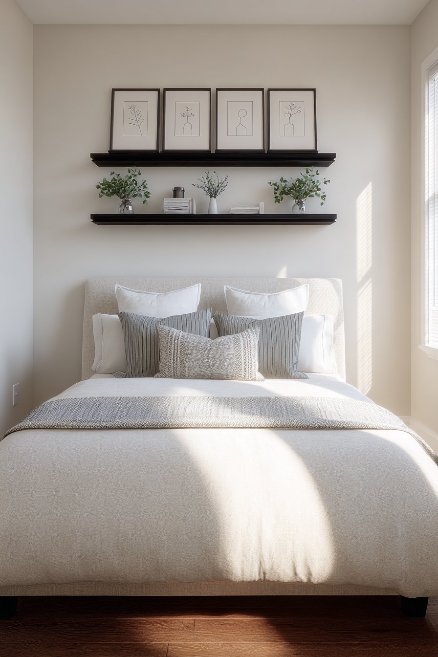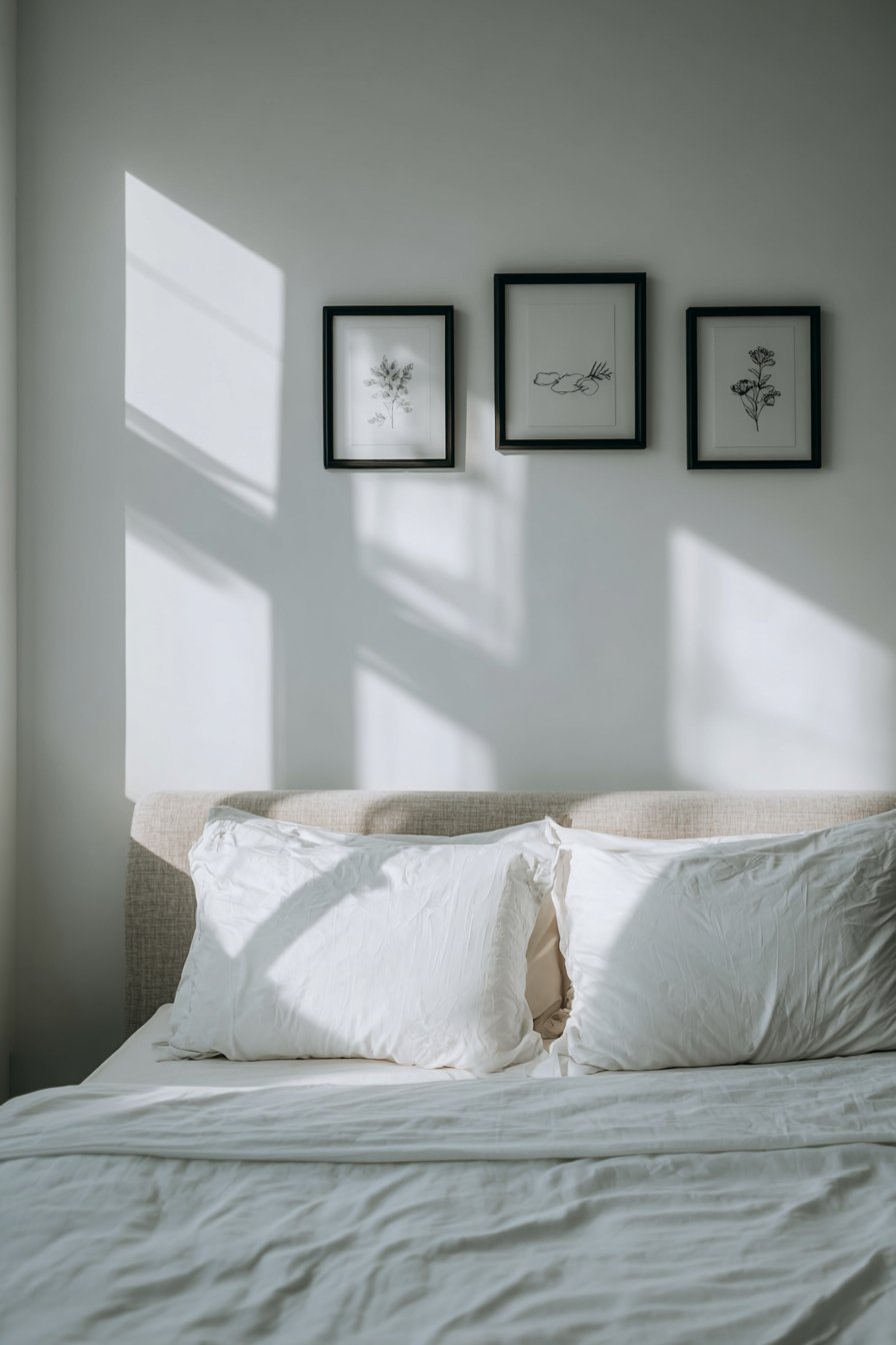 Morning light creates subtle shadows that emphasize the arrangement’s geometry. The shadows add dimension without cluttering the serene atmosphere. A natural linen upholstered bed below completes the calming composition. This design proves that less truly becomes more with thoughtful curation.