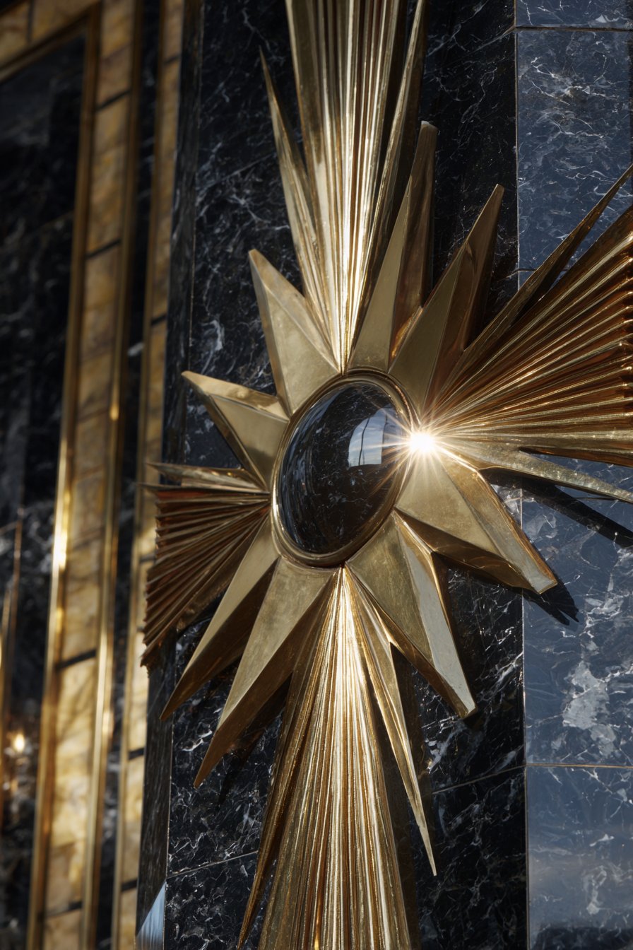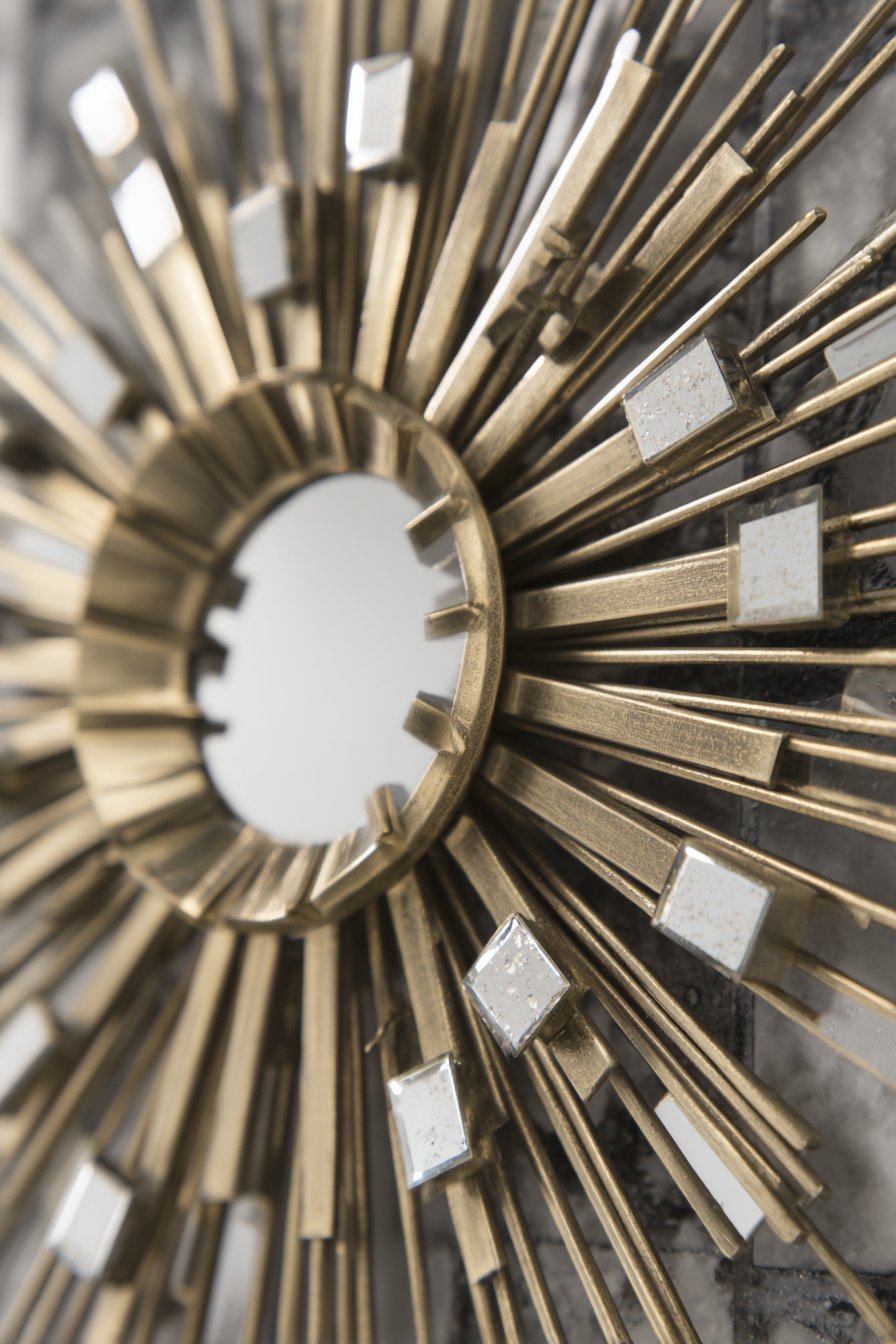 An Art Deco powder room features geometric brass and mirror wall sculpture. The piece measures 12 inches diameter with sunburst rays radiating outward. Central beveled mirror reflects light and creates focal point. Black and white marble tile and brass fixtures echo metallic accent.