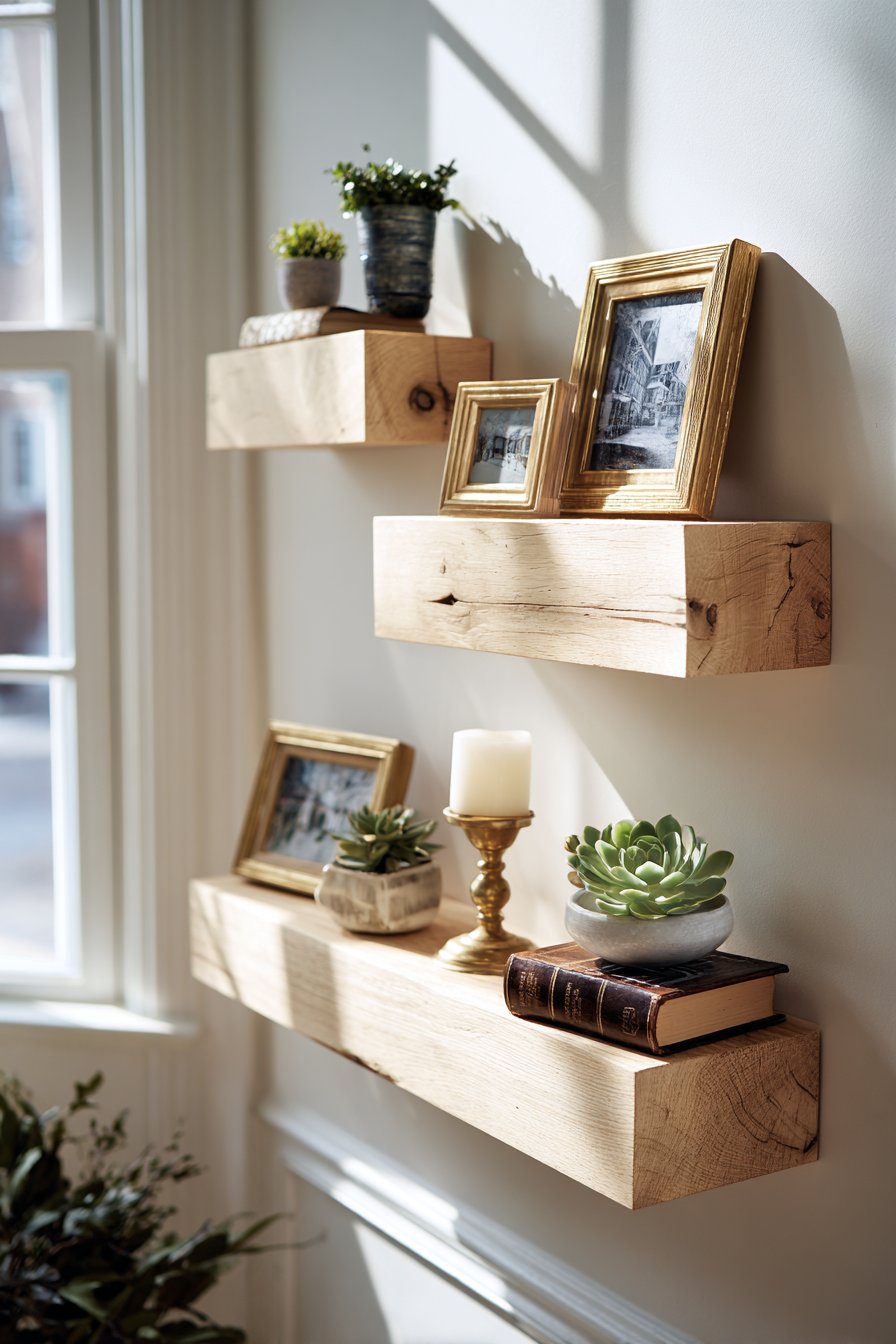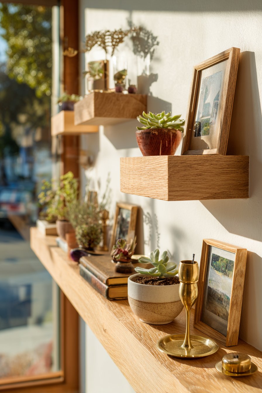 Small decorative objects including brass candlesticks and vintage books complete the curation. The natural wood grain adds organic warmth to the arrangement. Each shelf becomes its own micro-gallery of carefully chosen treasures. The vertical stagger creates visual movement along the wall.