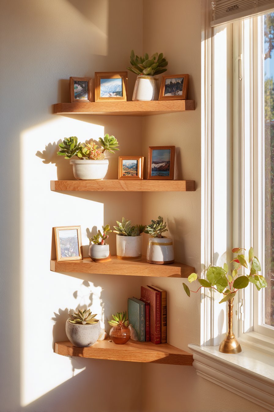 A cozy reading nook corner showcases floating wooden shelves in white oak. Each shelf measures 18 inches long and is arranged in a staggered pattern. The shelves display small potted succulents in ceramic planters. Miniature framed photographs in 4×6 gold frames add personal touches.