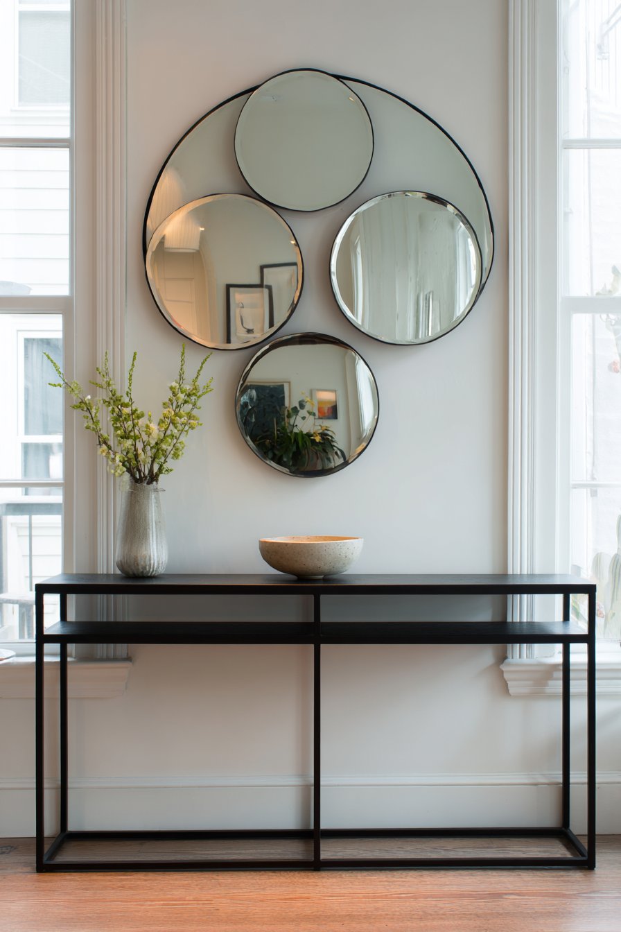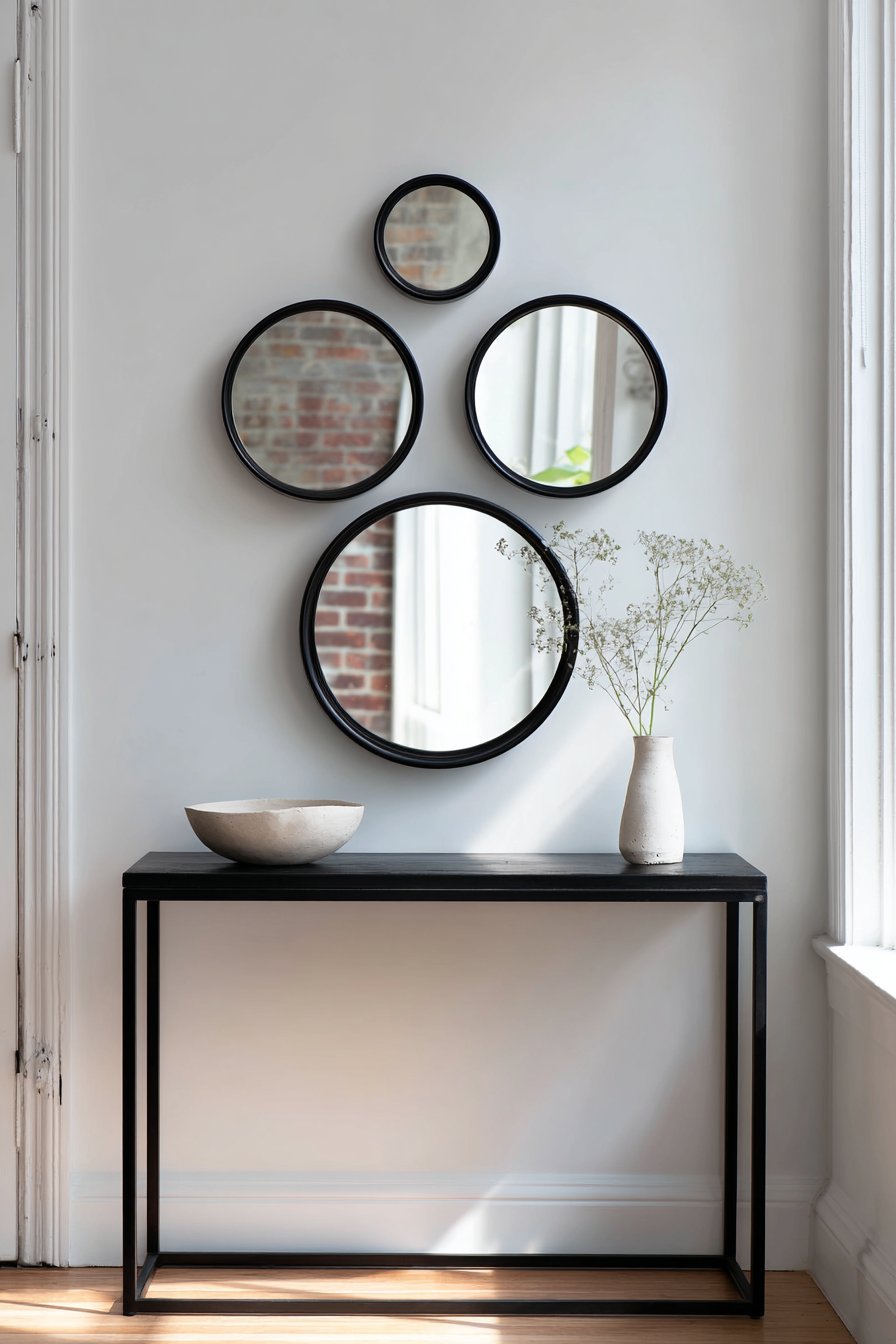 The mirrors serve both decorative and practical purposes in the entryway. They allow quick appearance checks while creating illusion of expanded space. The graduated sizing creates pleasing rhythm and proportion. This simple solution delivers significant impact in compact areas.