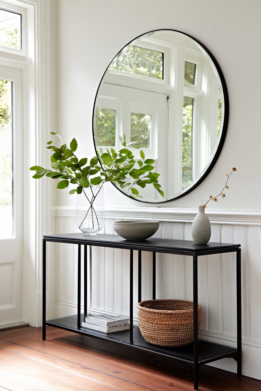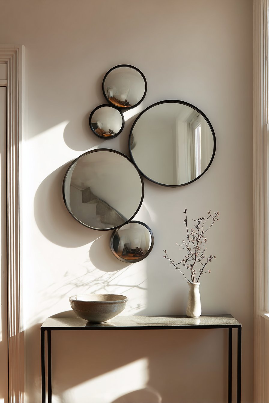 A modern entryway features three round convex mirrors in graduated sizes. The diameters measure 8, 10, and 12 inches with thin black metal frames. Vertical mounting with 6-inch spacing creates an elongated focal point. This arrangement works beautifully in narrow wall spaces.