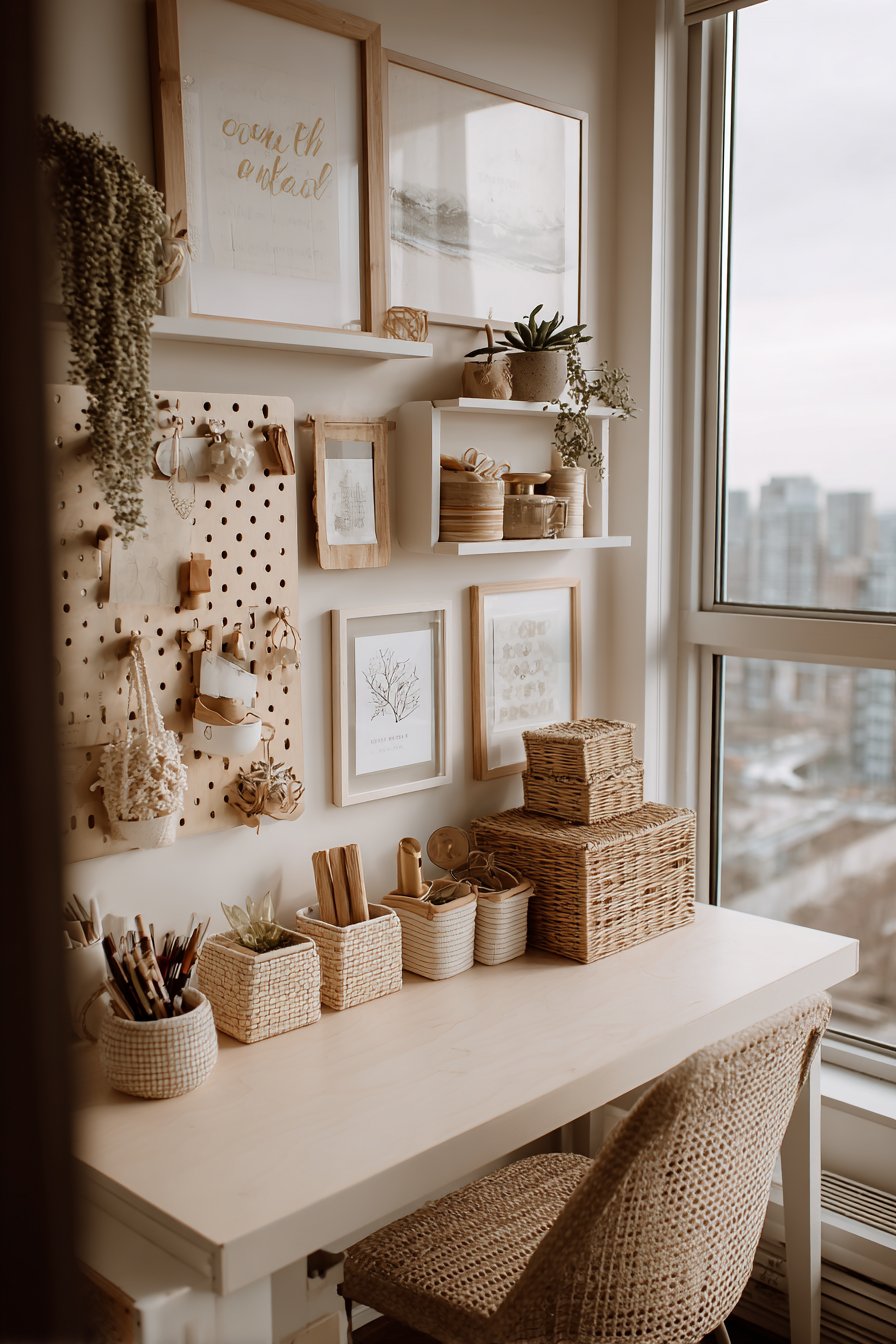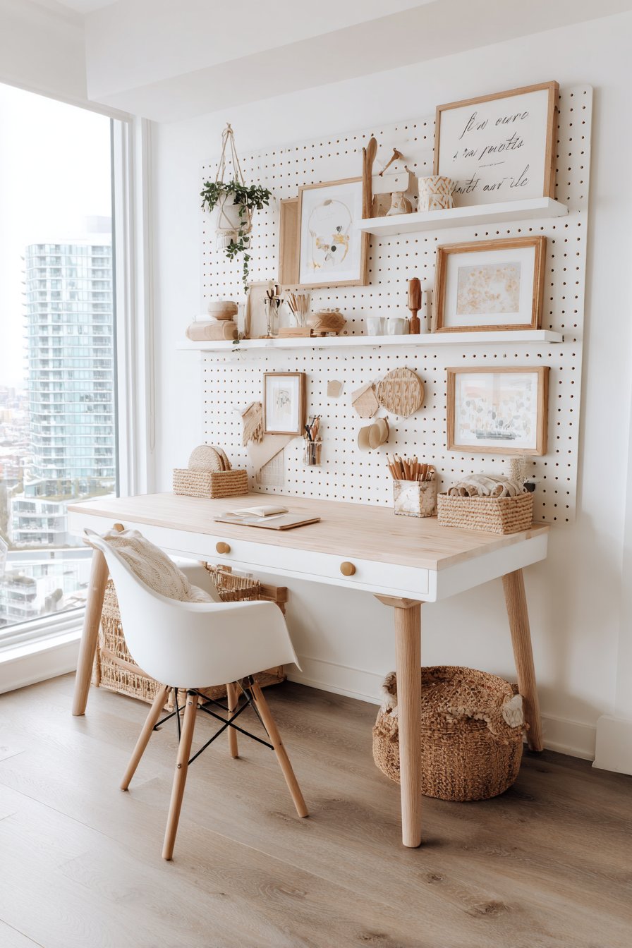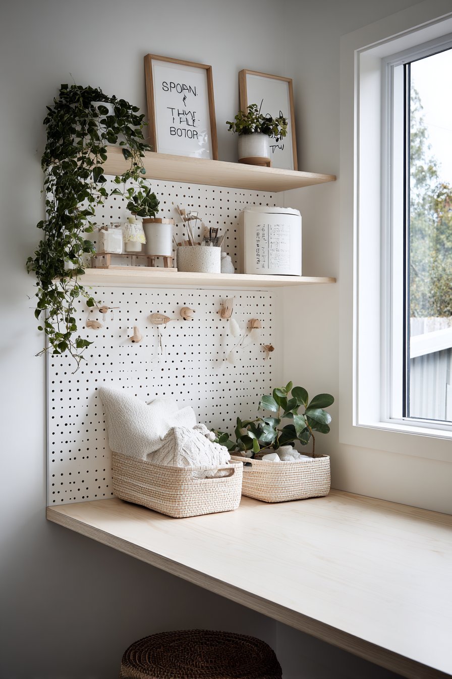 A Scandinavian-style home office features natural birch pegboard measuring 24×30 inches. The pegboard mounts above a minimalist desk creating an organized display. Wooden dowel hooks hold hanging plants in small macramé holders. Mounted shelves display 5×7 framed inspirational prints.