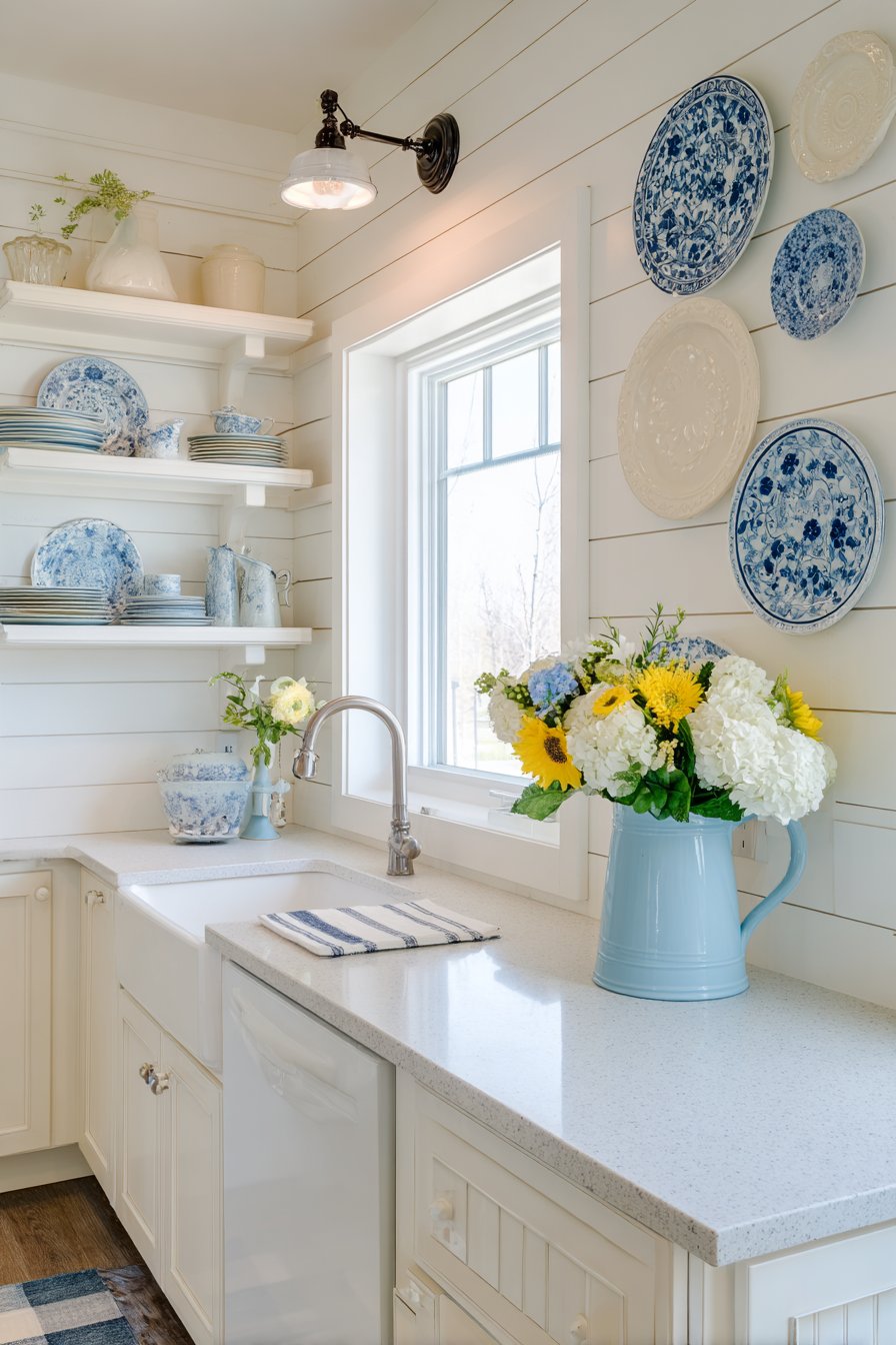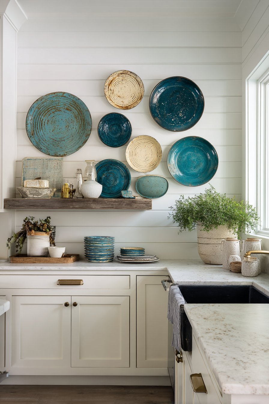 A farmhouse kitchen showcases vintage enamelware plates in cream and blue tones. Plate sizes range from 6 to 9 inches in diameter. The organic cluster arrangement feels casual and collected. White shiplap walls provide perfect backdrop for the color palette.