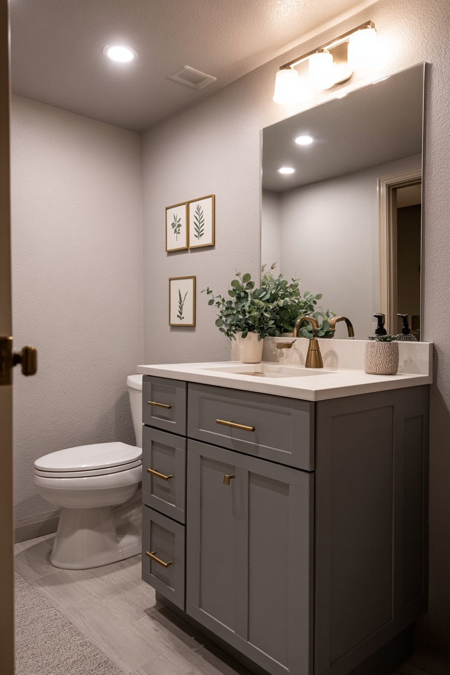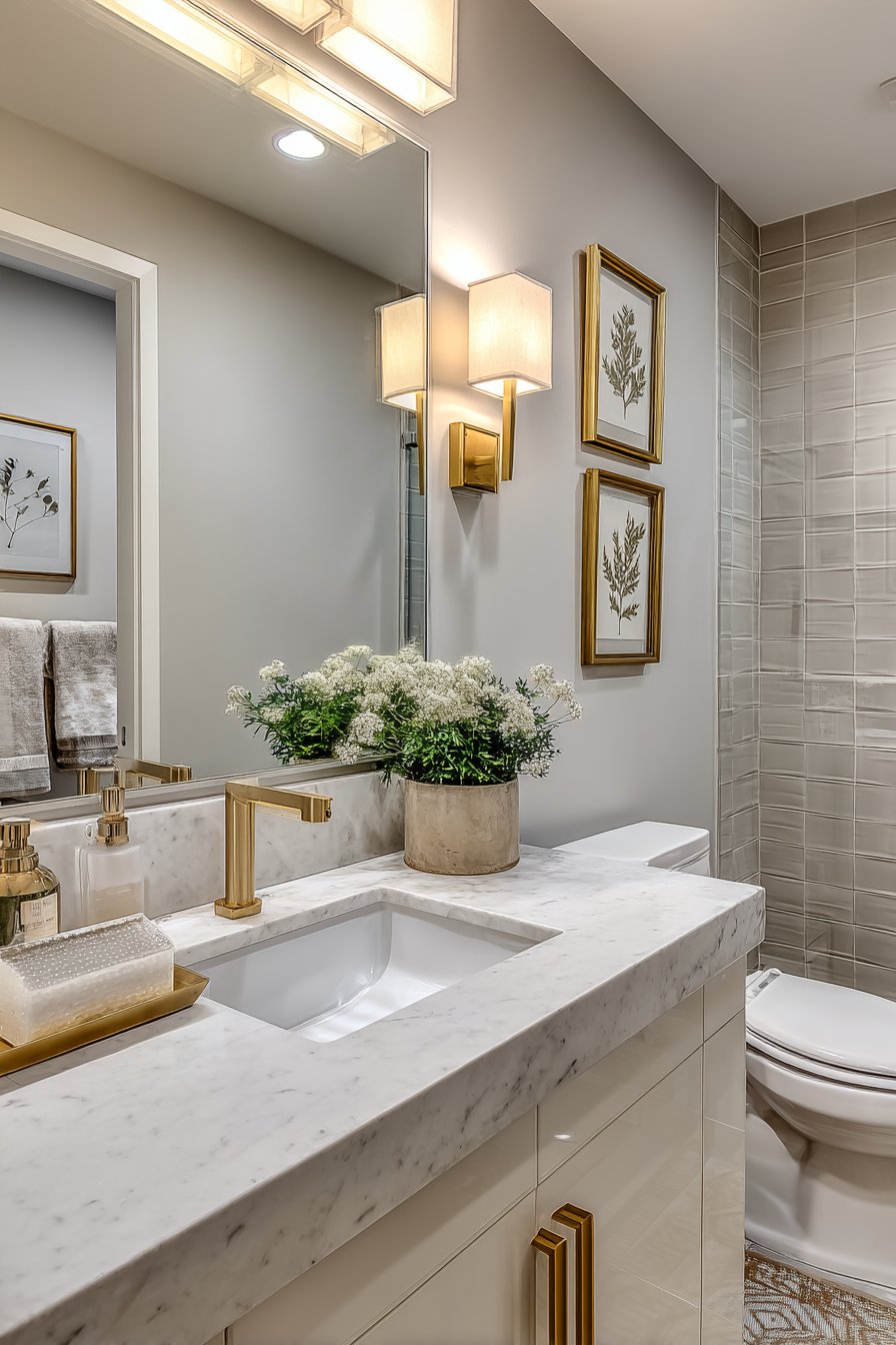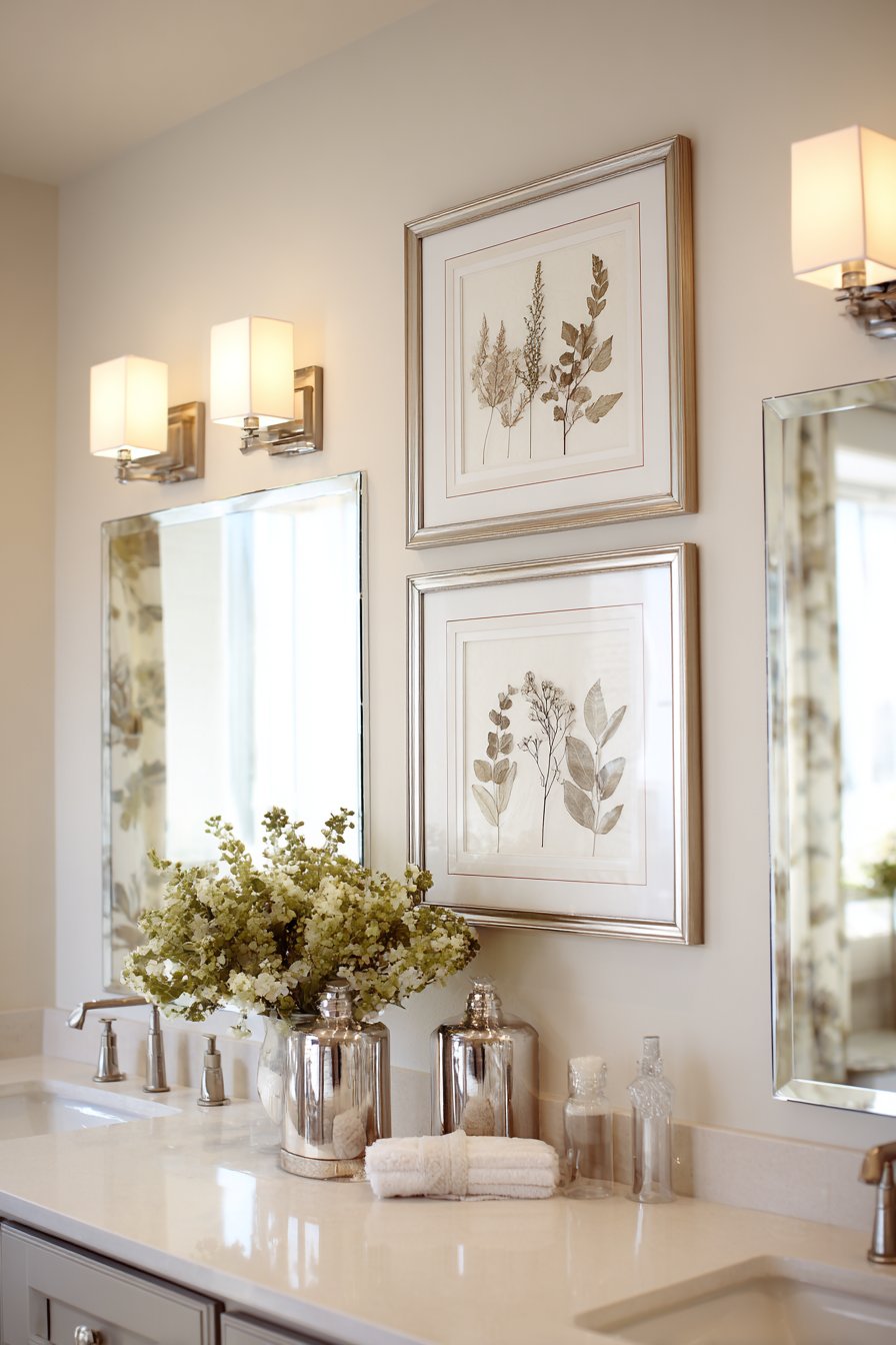 A contemporary bathroom features three framed pressed botanicals under glass. Each frame measures 5×7 inches with slim gold frames. The tight vertical cluster arrangement sits beside the vanity mirror. This placement adds organic elegance without competing with functional elements.