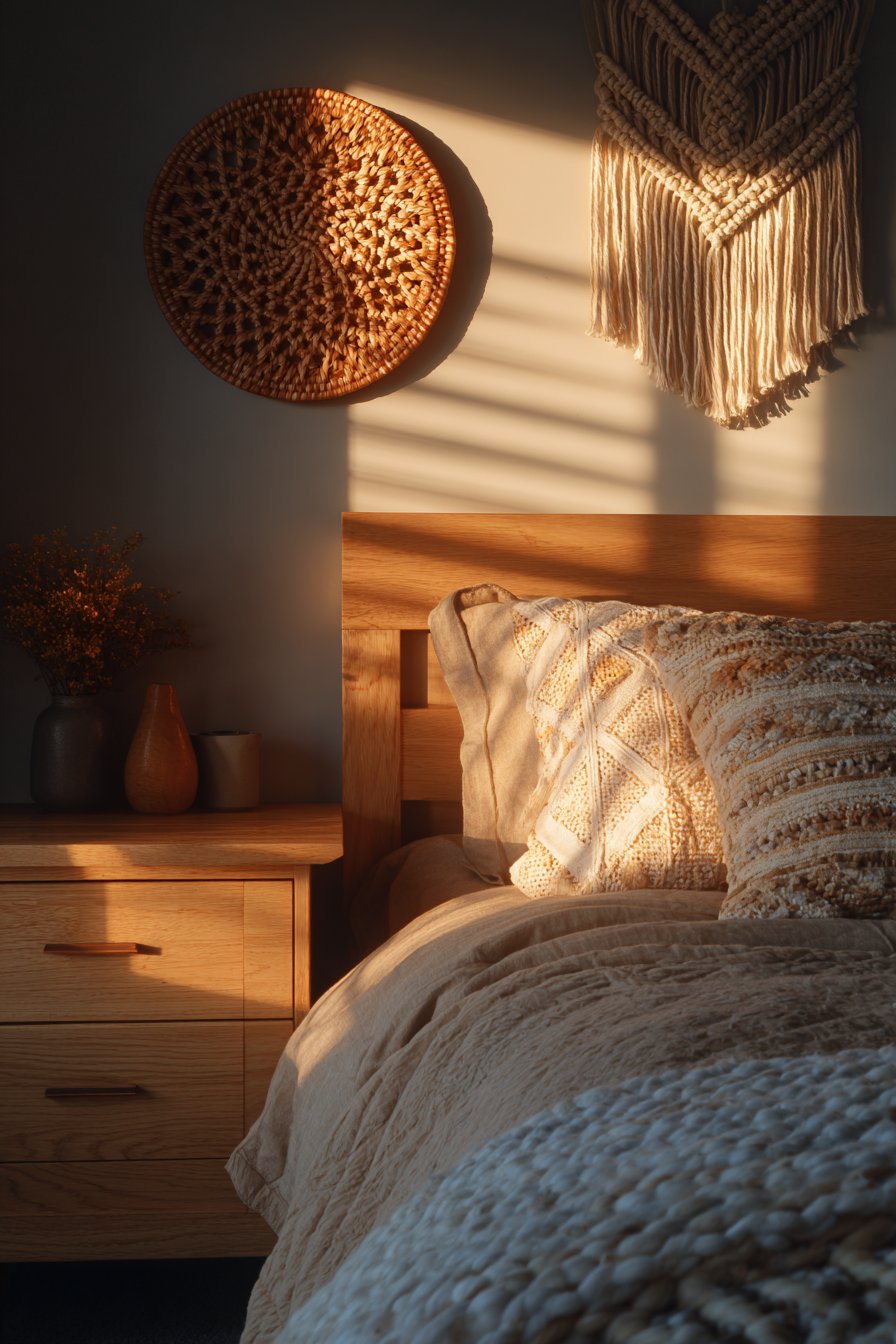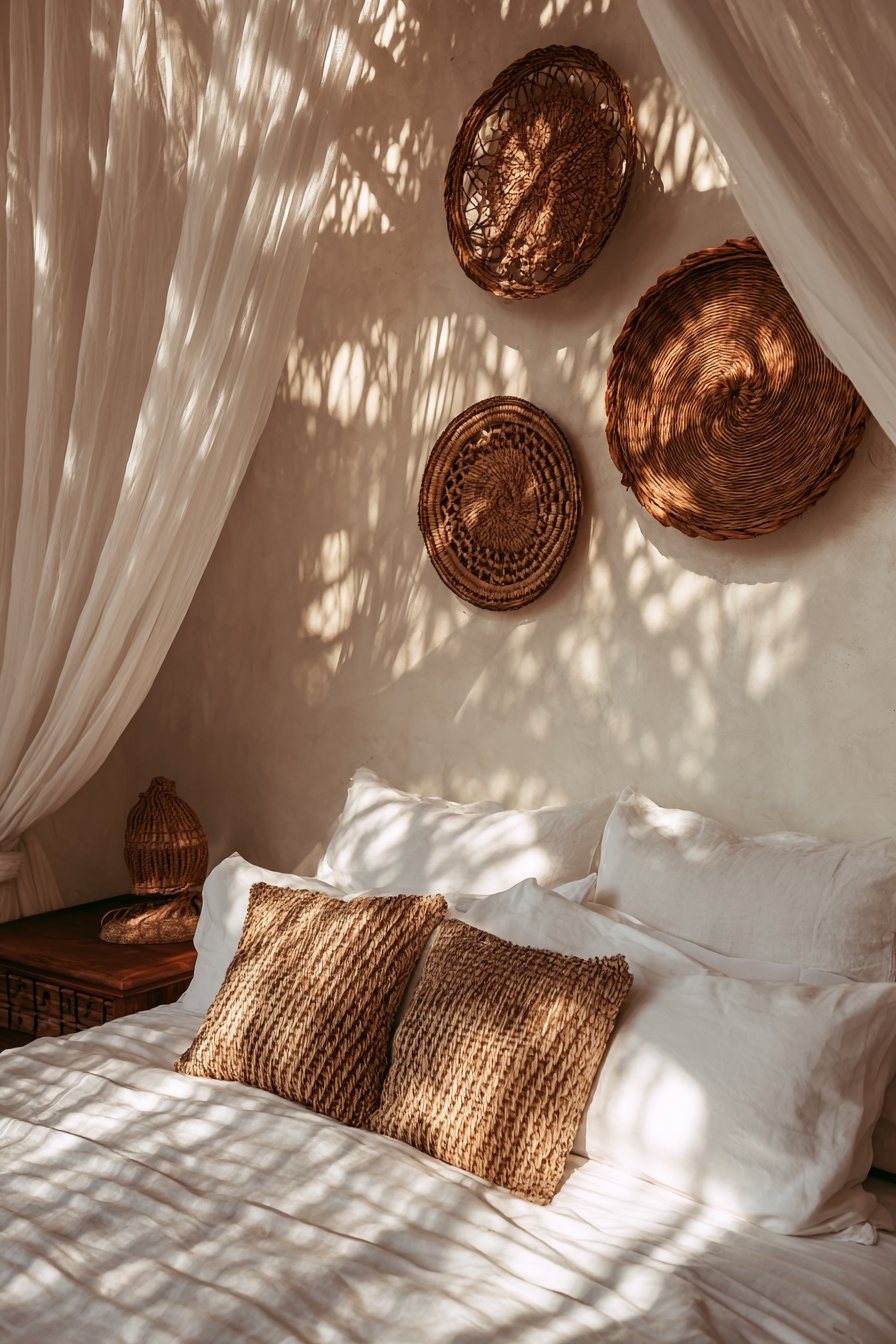 Golden hour sunlight streaming through gauze curtains creates beautiful shadow patterns. The light highlights intricate weaving patterns and textile details. The handcrafted quality brings artisanal authenticity to the space. Natural fiber materials reinforce the bohemian aesthetic perfectly.