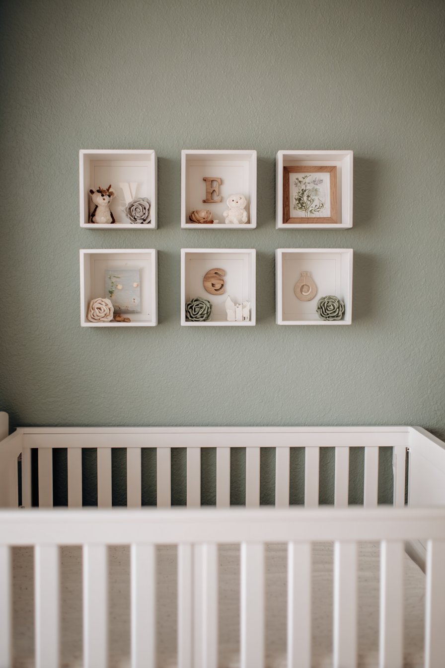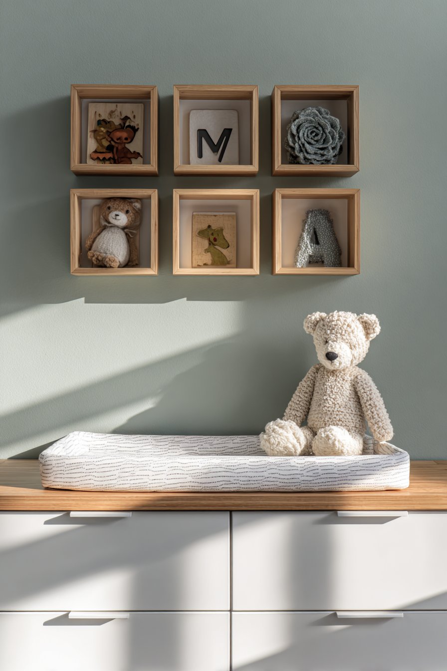 Soft pastel sage green walls complement the natural wood frames beautifully. Gentle ambient lighting from nearby window creates soft shadows within boxes. The dimensional quality adds playful sophistication appropriate for nursery. The grid arrangement maintains order while celebrating childhood whimsy.