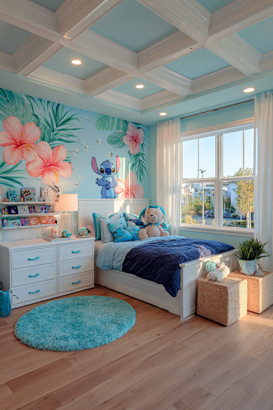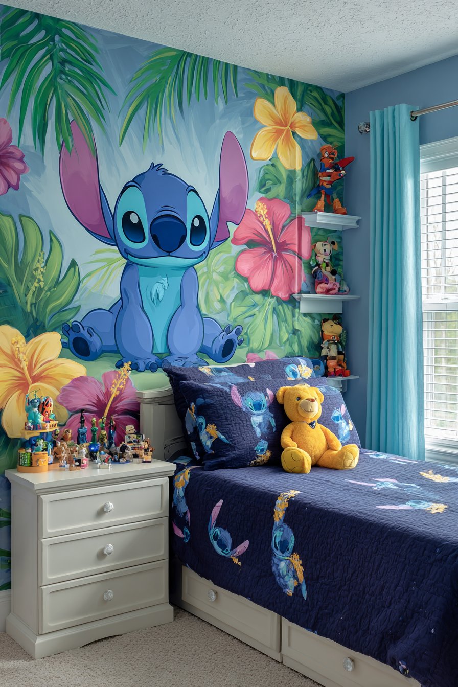 A vibrant hand-painted Stitch mural transforms an accent wall into a stunning focal point. The iconic blue character appears against tropical Hawaiian backgrounds. Hibiscus flowers and palm leaves add an authentic island atmosphere. The mural creates immediate visual impact when entering the room.