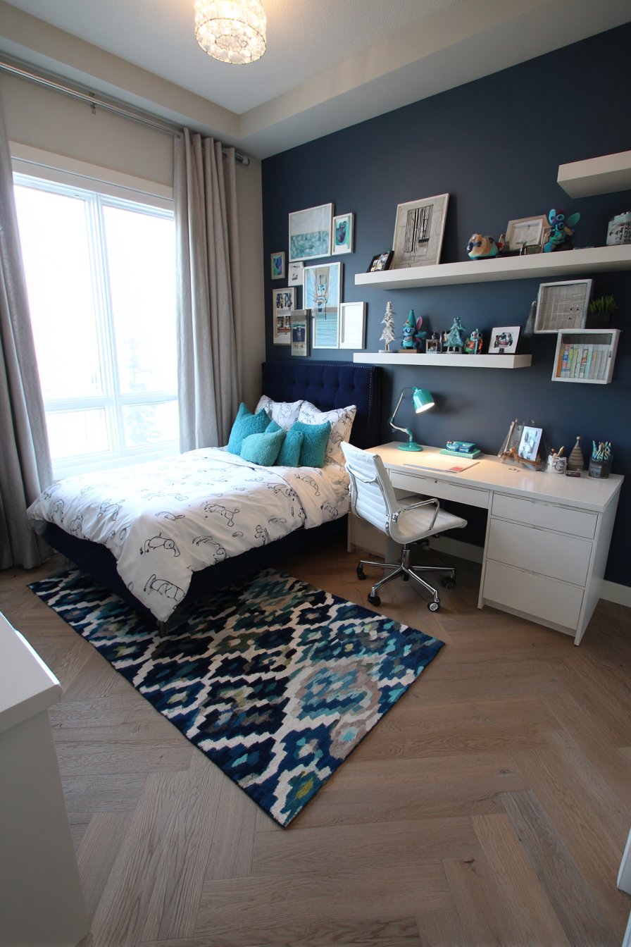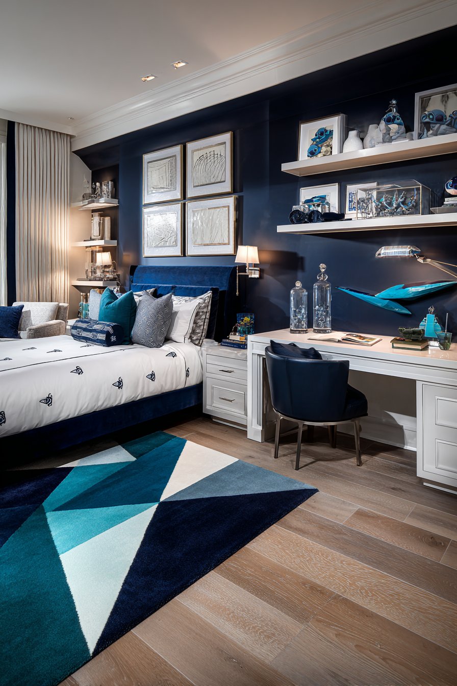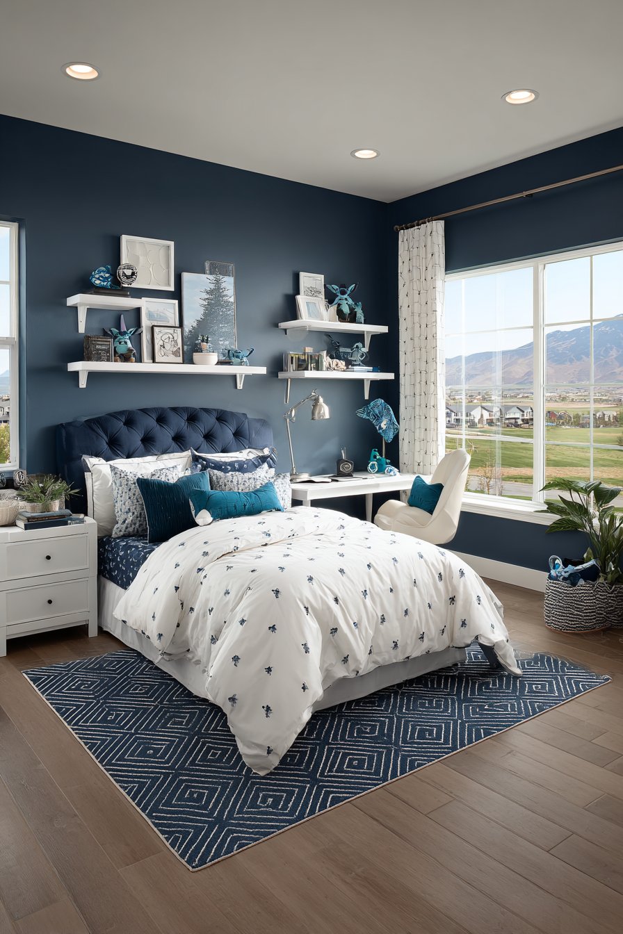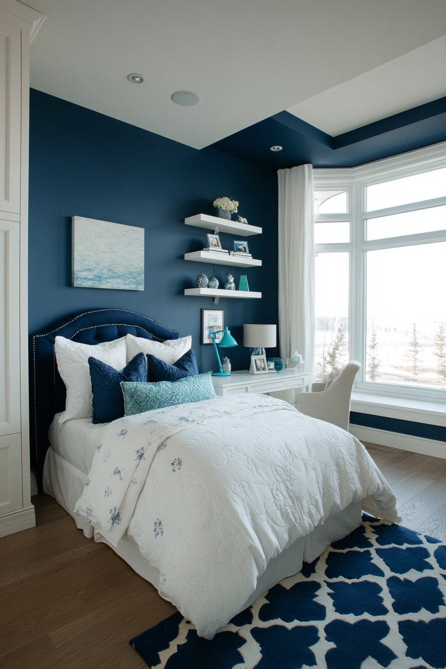 Navy blue walls create mature design foundation. White furniture provides crisp, clean contrast. Turquoise accents add strategic color pops. The palette feels refined rather than juvenile. This sophisticated approach extends theme longevity significantly.
