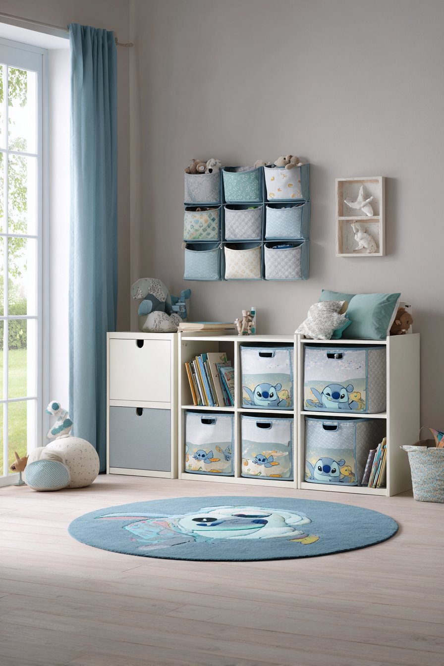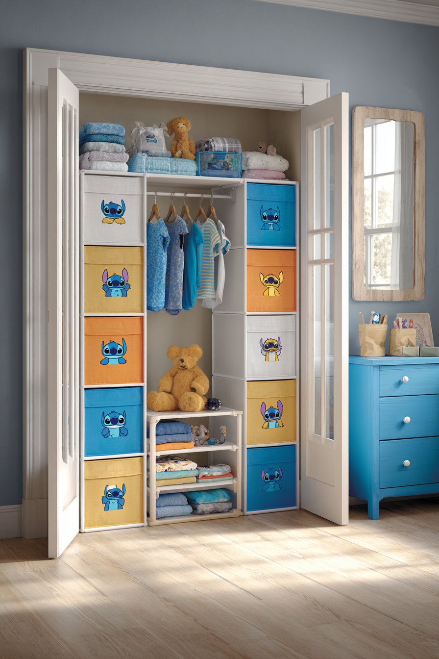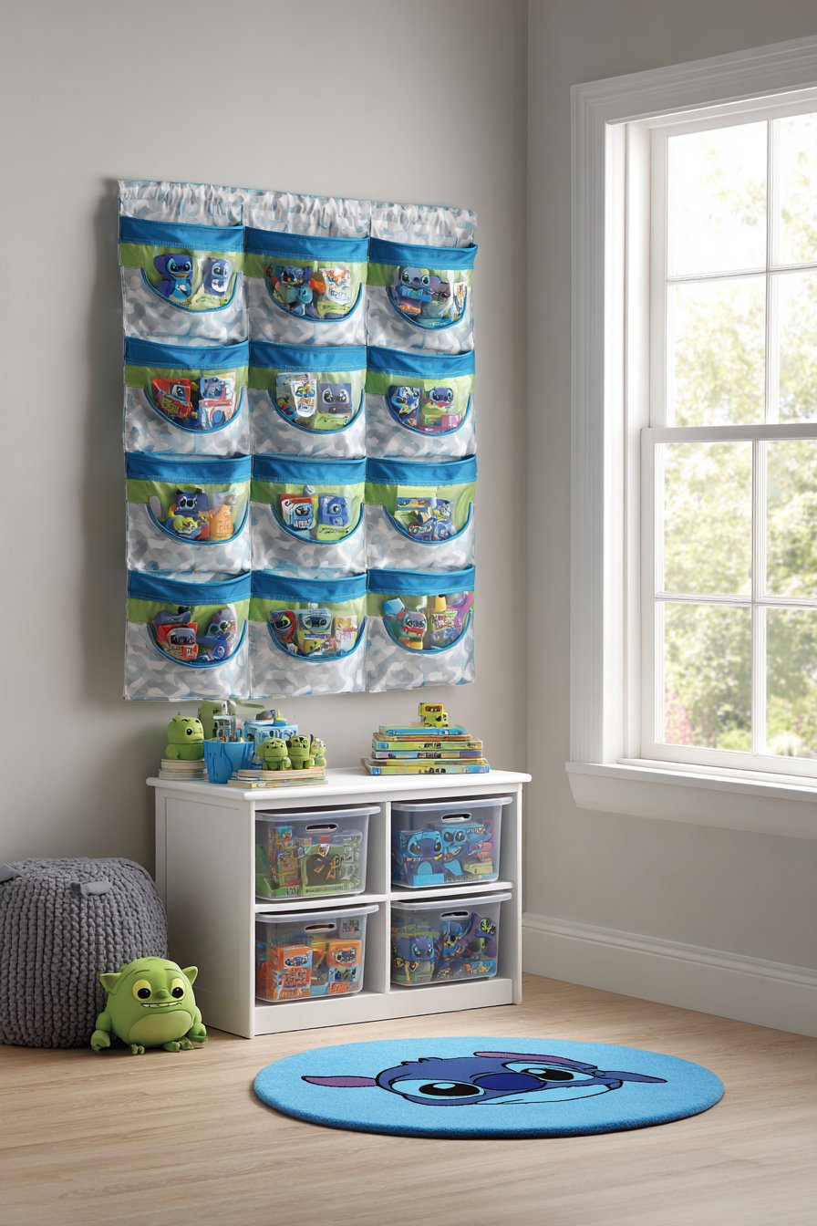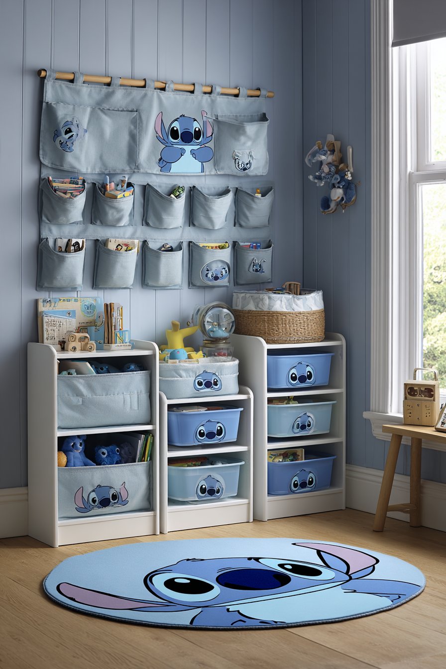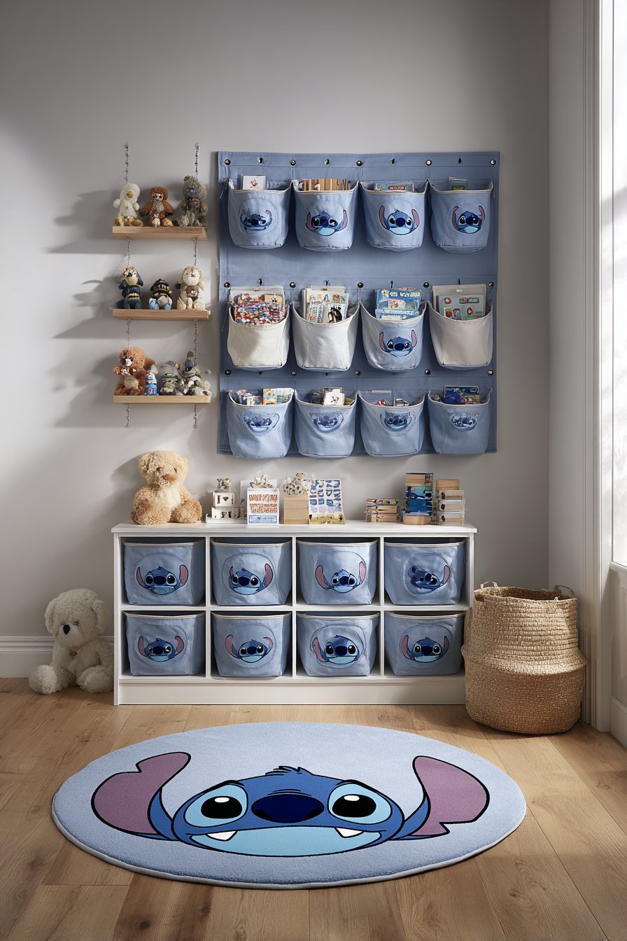 Clear plastic storage bins feature Stitch character labels. The white storage unit includes blue fabric drawers with character prints. Above hangs a fabric wall organizer with Stitch pockets. Small toys and books tuck into designated spaces. Everything maintains assigned homes for easy cleanup.