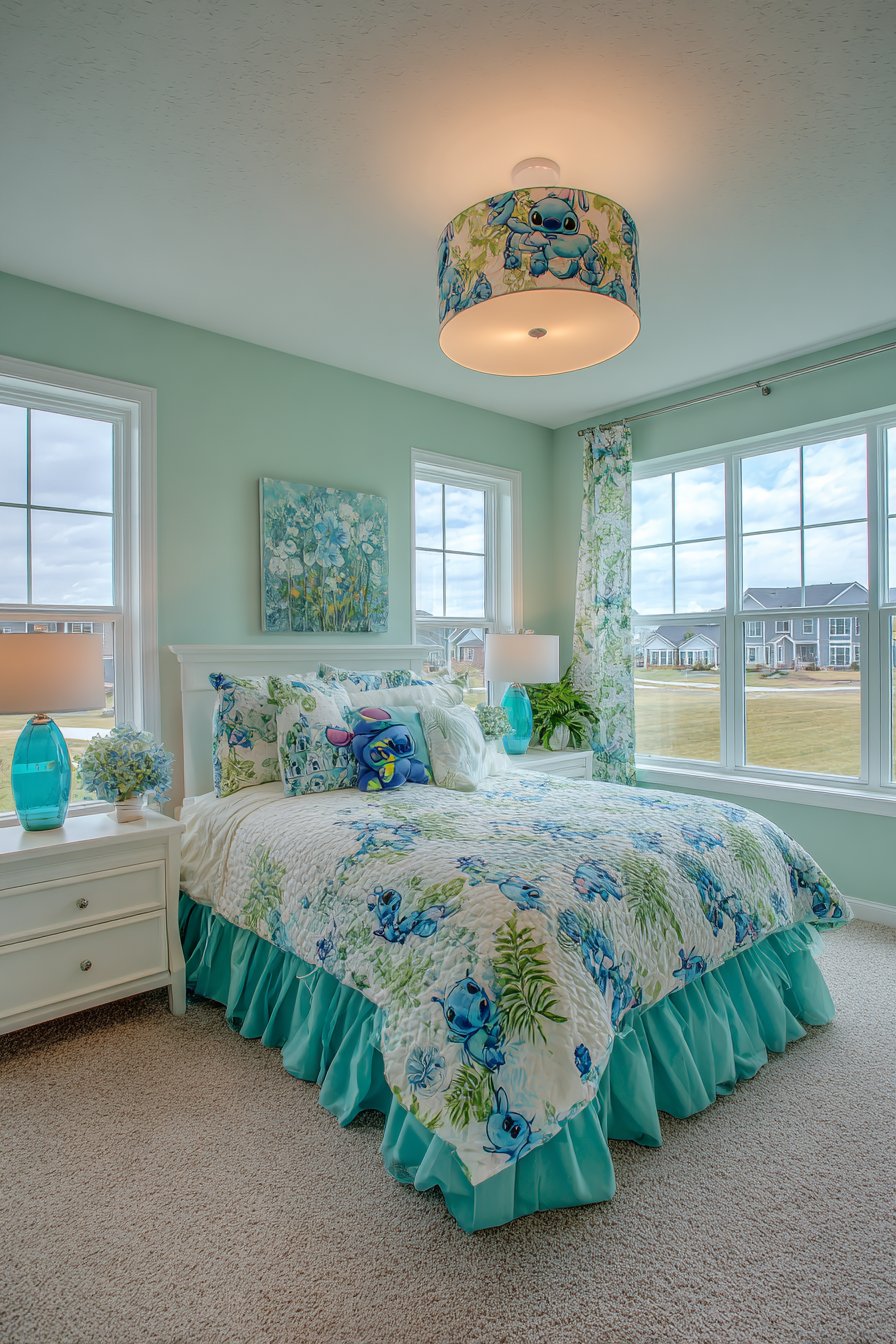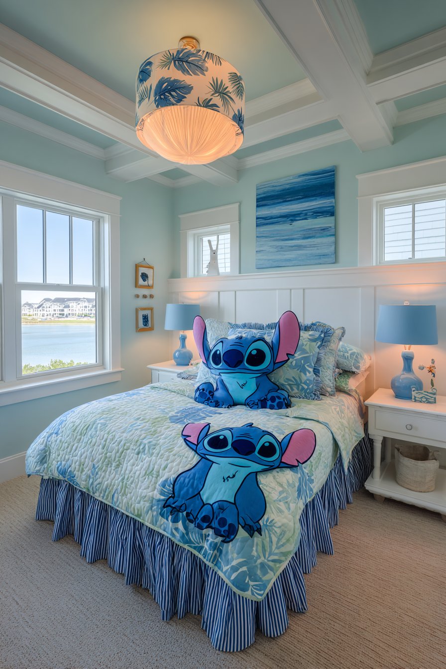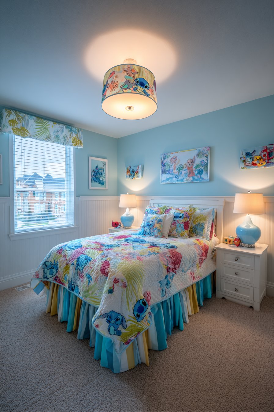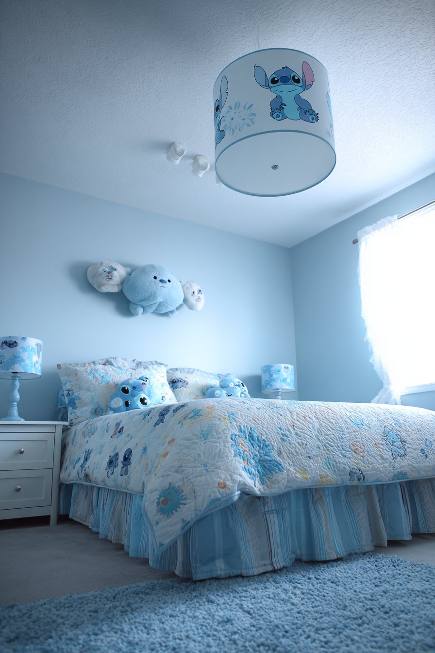 A Stitch-themed ceiling light fixture commands attention overhead. The lampshade displays character graphics and tropical patterns. Blue and white colors coordinate with overall palette. Below, a custom bed skirt features ruffled layers. Alternating blue tones create dimensional texture.