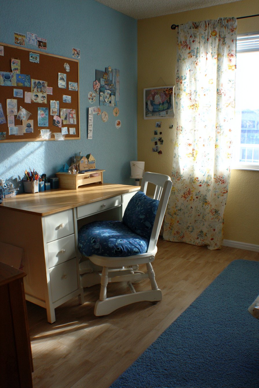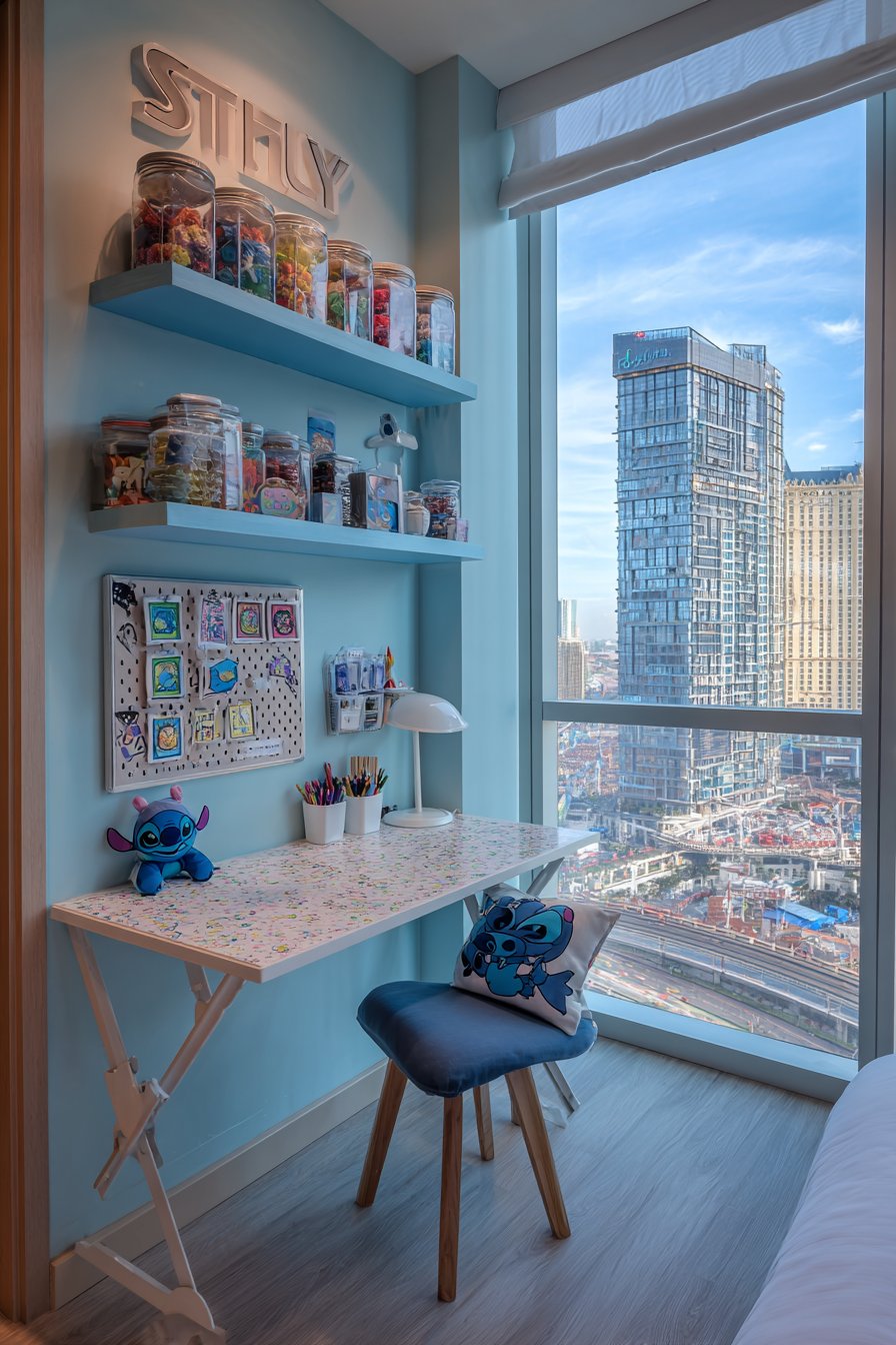 The nearby desk area features child-sized white furniture. A Stitch-themed organizer holds art supplies neatly. The corkboard above displays children’s artwork proudly. Stitch stickers personalize the display board. The blue-cushioned chair includes small Stitch patterns throughout.