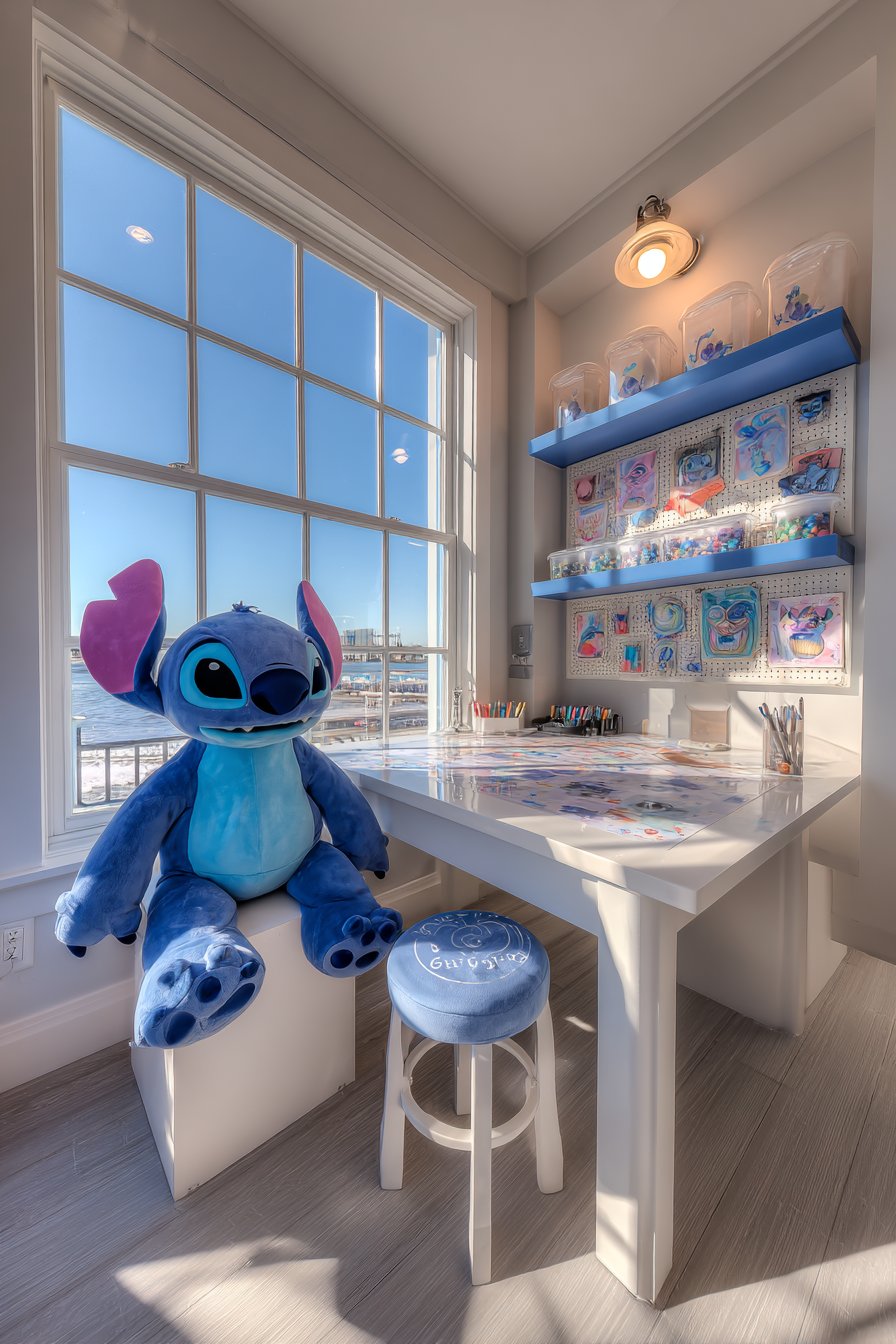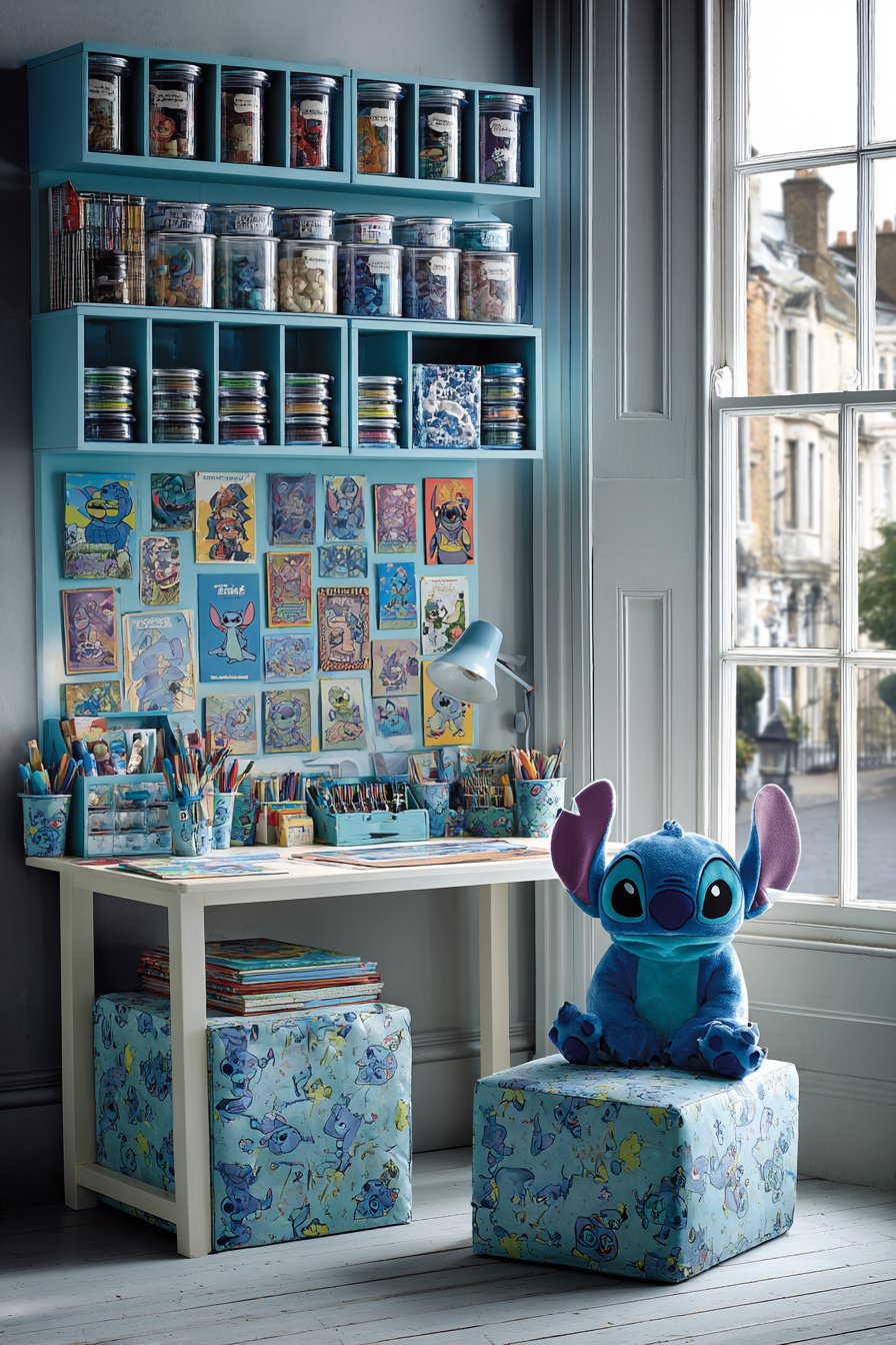 A white craft table features washable plastic covering. Stitch patterns decorate the protective surface. Wall-mounted blue shelving holds art supplies accessibly. Clear containers with Stitch labels organize materials systematically. A bulletin board displays children’s Stitch-inspired artwork.