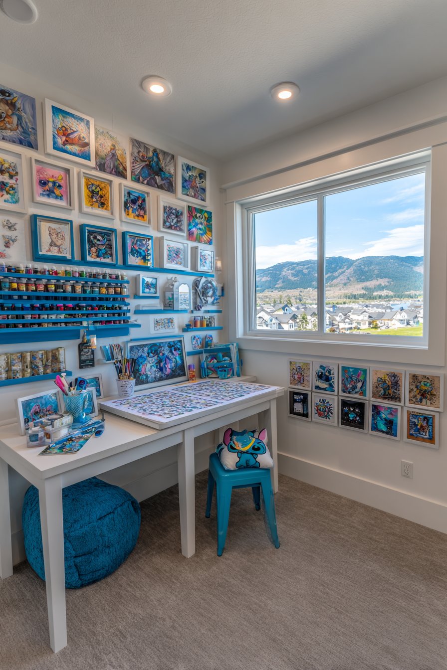 Colorful frames showcase the displayed pieces proudly. Protective vinyl flooring withstands inevitable spills and messes. A small blue stool with Stitch cushion provides comfortable seating. Natural light from large windows illuminates the creative workspace. This prevents eye strain during detailed activities.