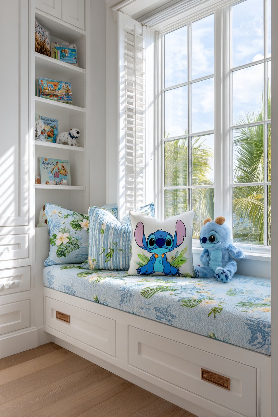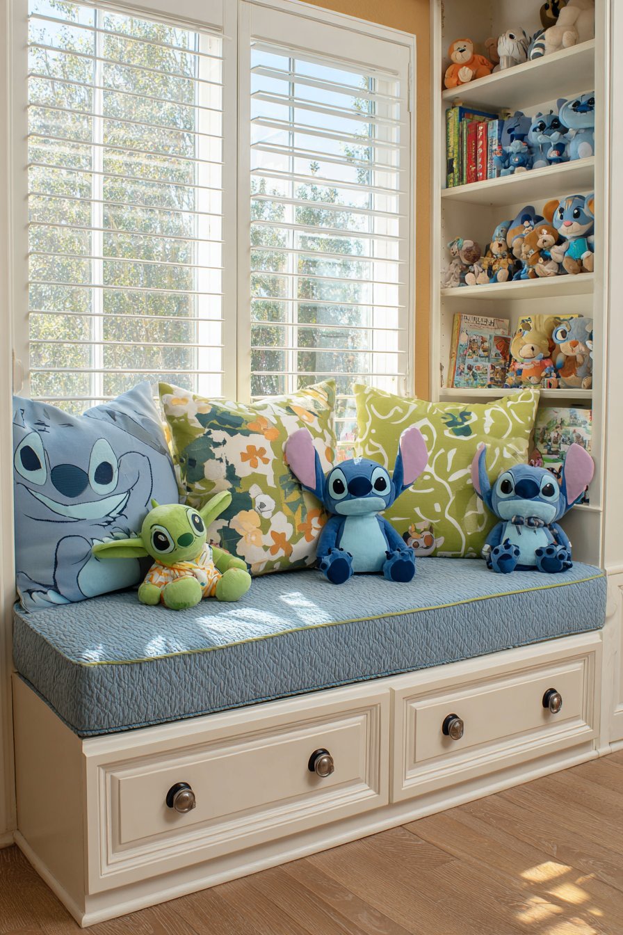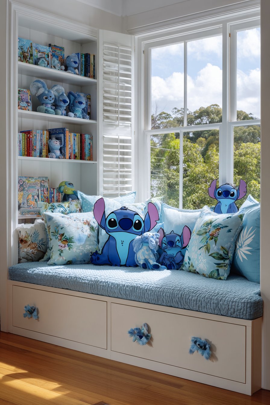 A custom window seat features blue cushion upholstery. Embroidered Stitch faces and tropical flowers personalize the fabric. Multiple coordinating throw pillows provide lumbar support. Built-in white shelving flanks the seat on both sides. Books and Stitch plush toys fill the shelves attractively.