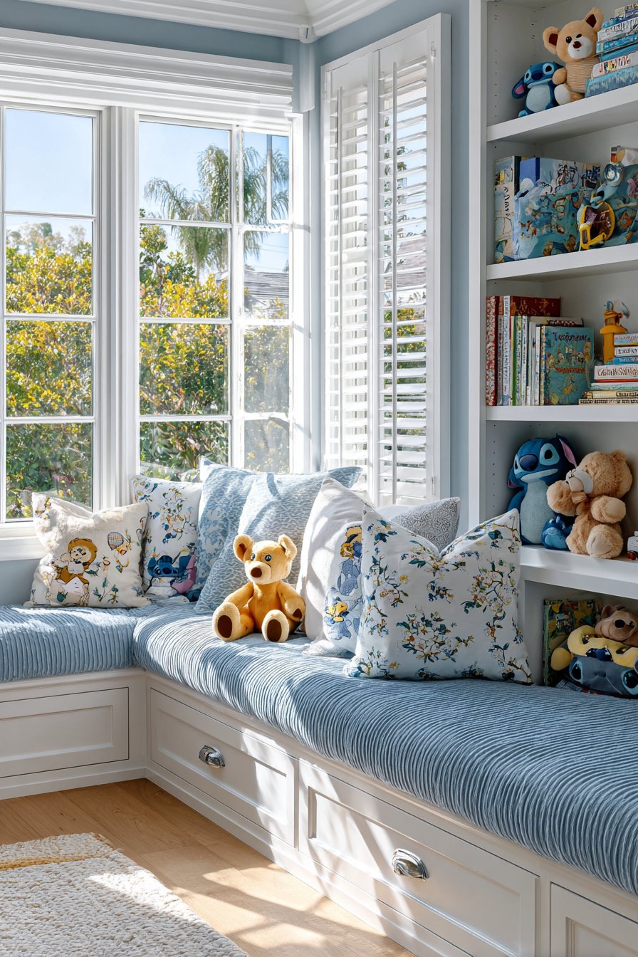 White plantation shutters frame the window beautifully. Adjustable slats control natural light precisely. Pull-out storage drawers beneath the seat include Stitch-shaped handles. Light oak hardwood flooring adds natural warmth. The window seat becomes favorite family reading spot.