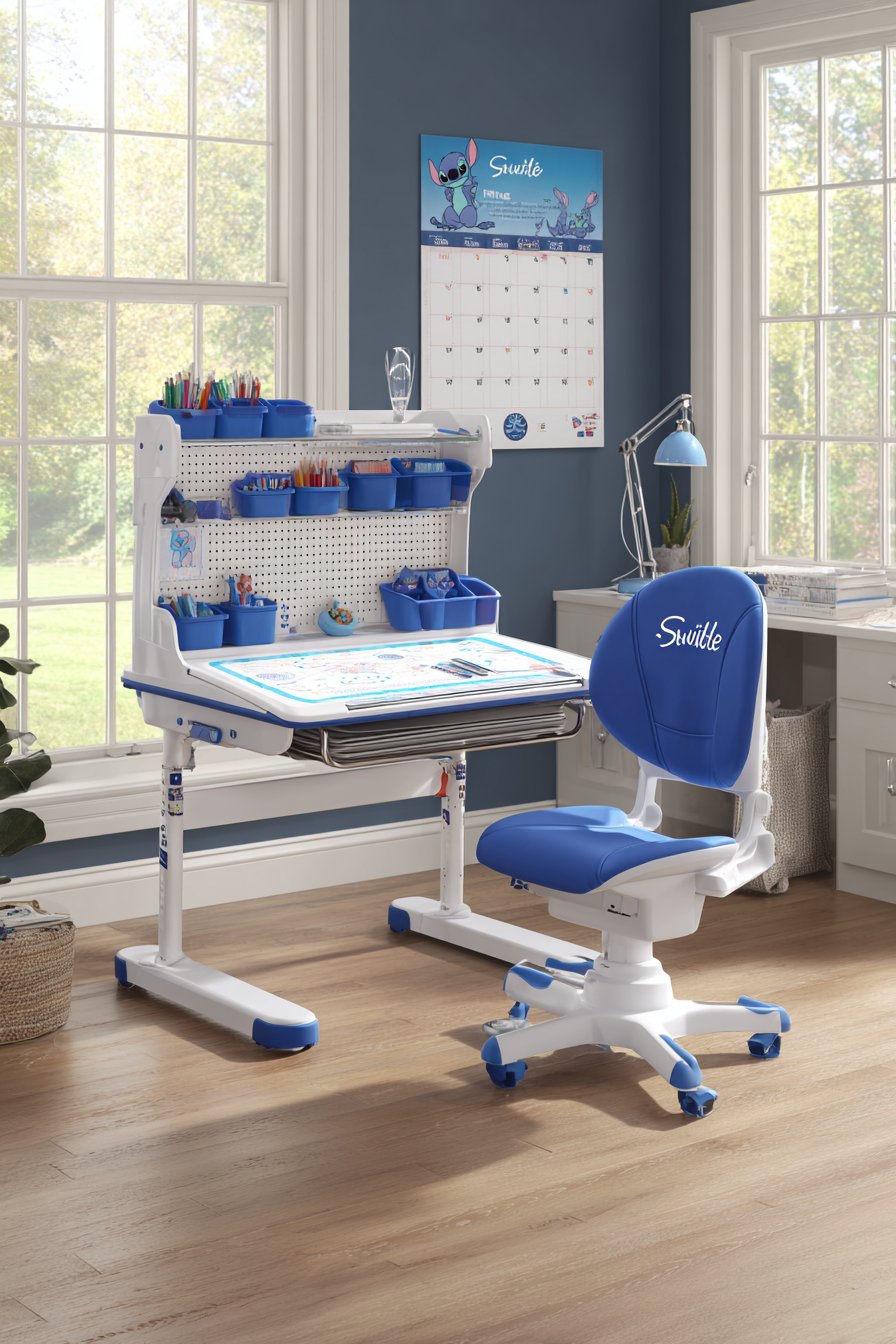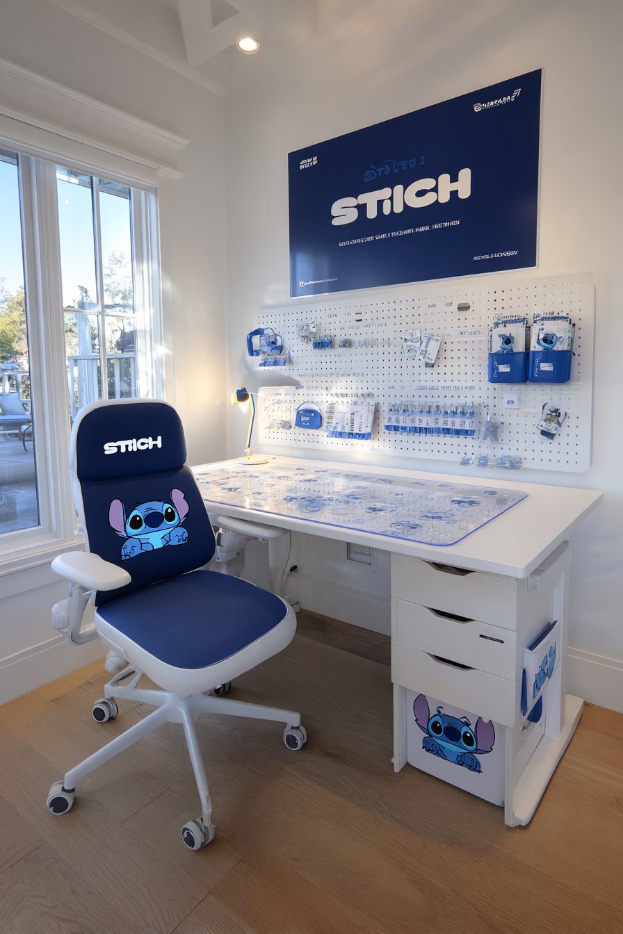 An L-shaped white desk provides extensive workspace. The configuration accommodates computers and homework materials simultaneously. A blue task chair features Stitch embroidery on the backrest. The ergonomic design supports healthy posture during study sessions.