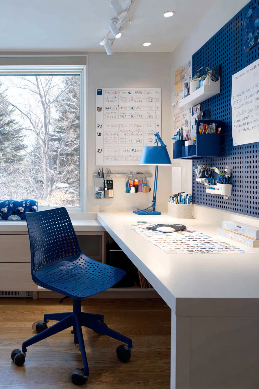 A white desk lamp with blue accents provides focused task lighting. The adjacent wall features large whiteboard calendar. This visual organization tool tracks assignments and activities. The comprehensive homework station reduces academic stress substantially.