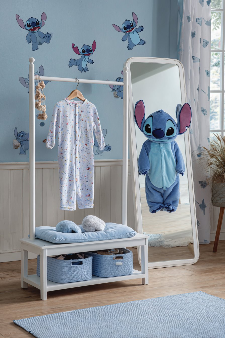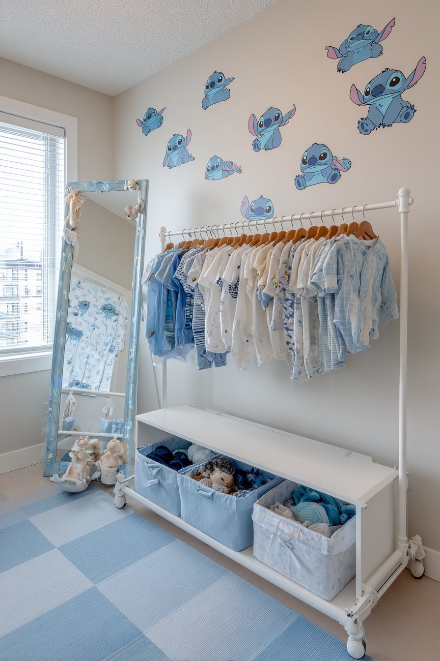 Below sits a white storage bench with blue fabric bins. Accessories and costume pieces organize by category. Removable Stitch wall decals in playful poses decorate the background wall. Soft blue carpet tiles cushion the standing and walking area.