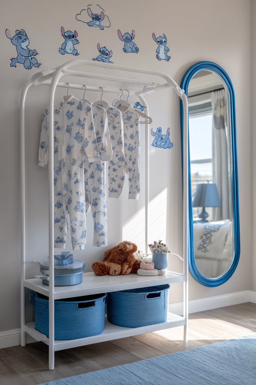 A white clothing rack displays costumes and dress-up clothes. Stitch onesie pajamas hang prominently with other character options. A blue-framed full-length mirror reflects the trying-on process. Stitch stickers decorate the mirror frame playfully.