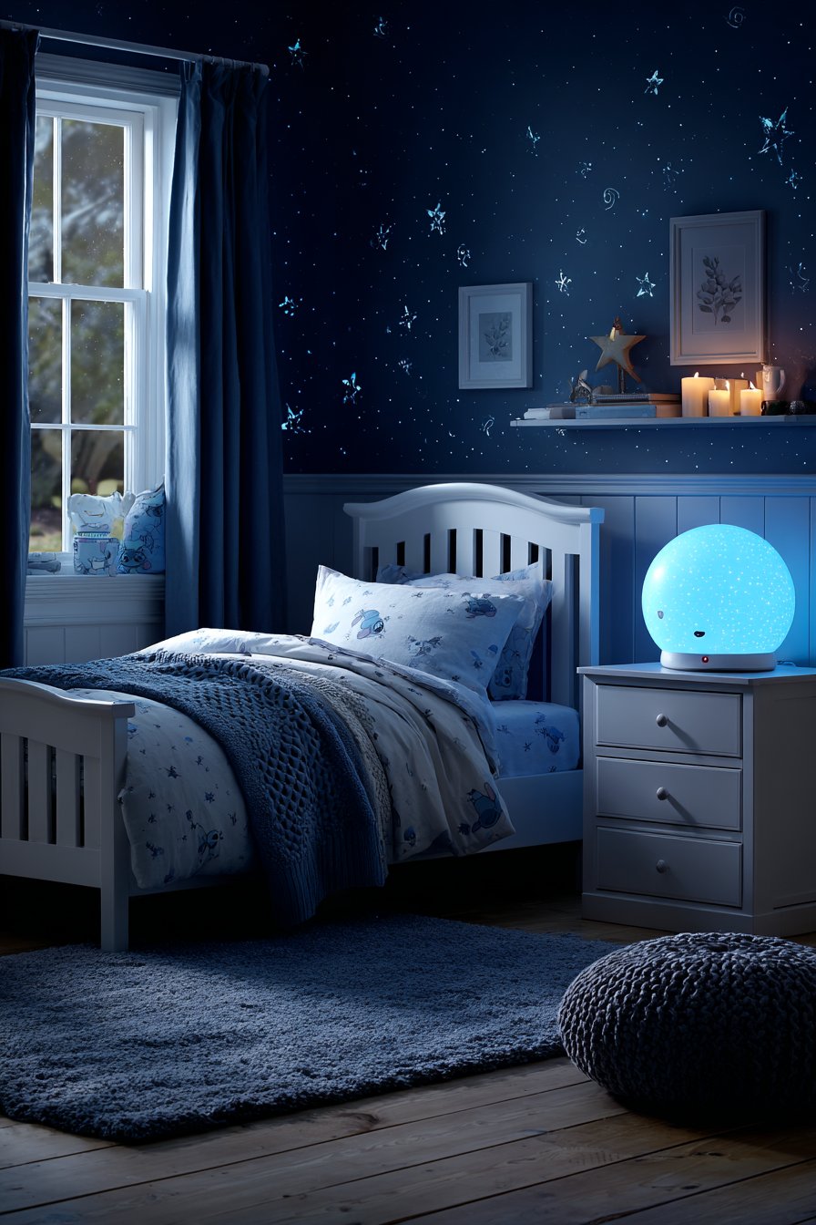 White furniture includes a dresser with blue-tinted night light. The Stitch-shaped light provides a gentle ambient glow. Blackout curtains in navy hang at windows. Subtle Stitch patterns remain visible upon close inspection. Light oak flooring features plush navy area rug.