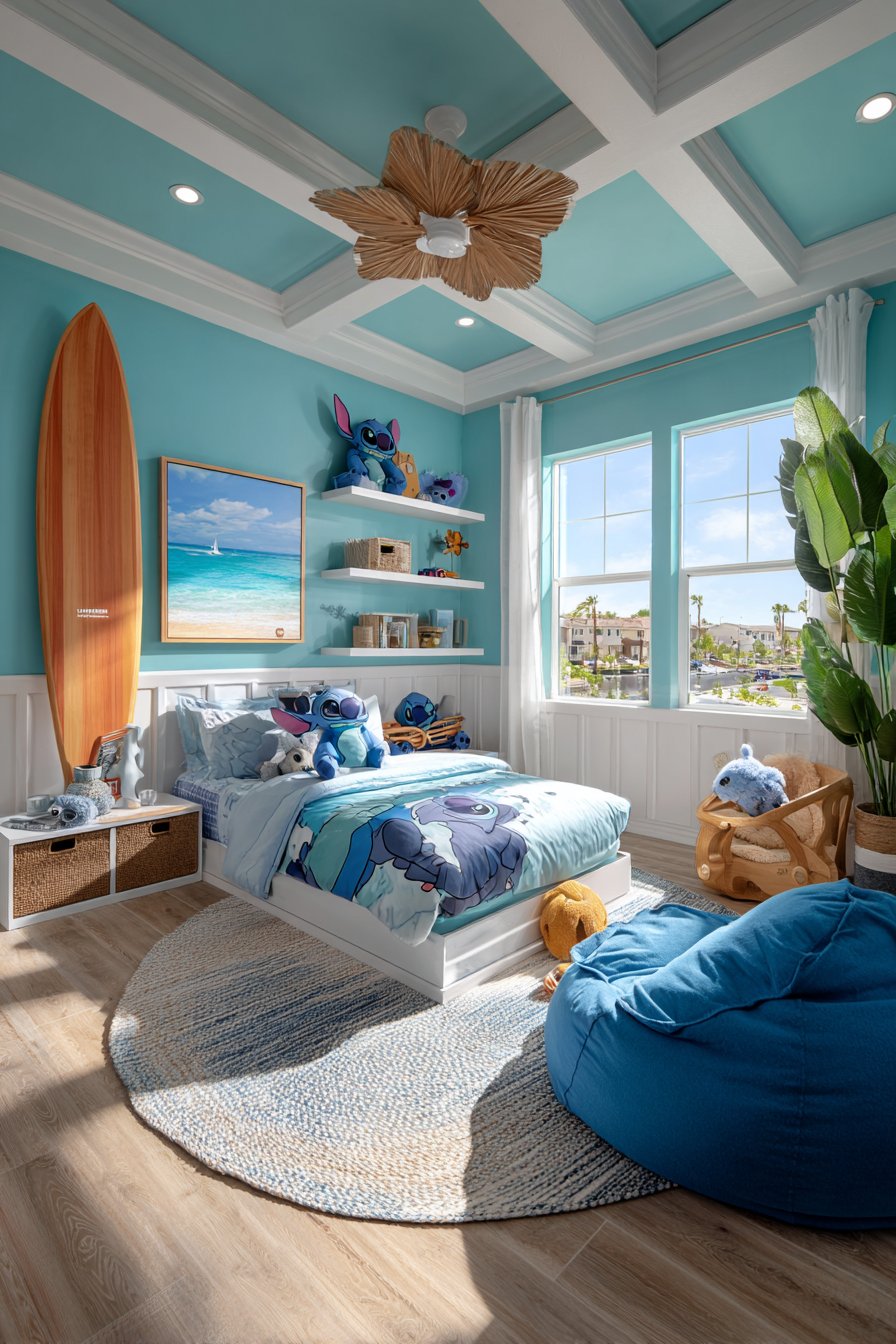 The color palette centers on various blue tones. Navy, turquoise, and sky blue create depth without overwhelming. White furniture and trim provide breathing room. This prevents the space from feeling too busy. The tropical elements tie the character theme to broader design concepts.