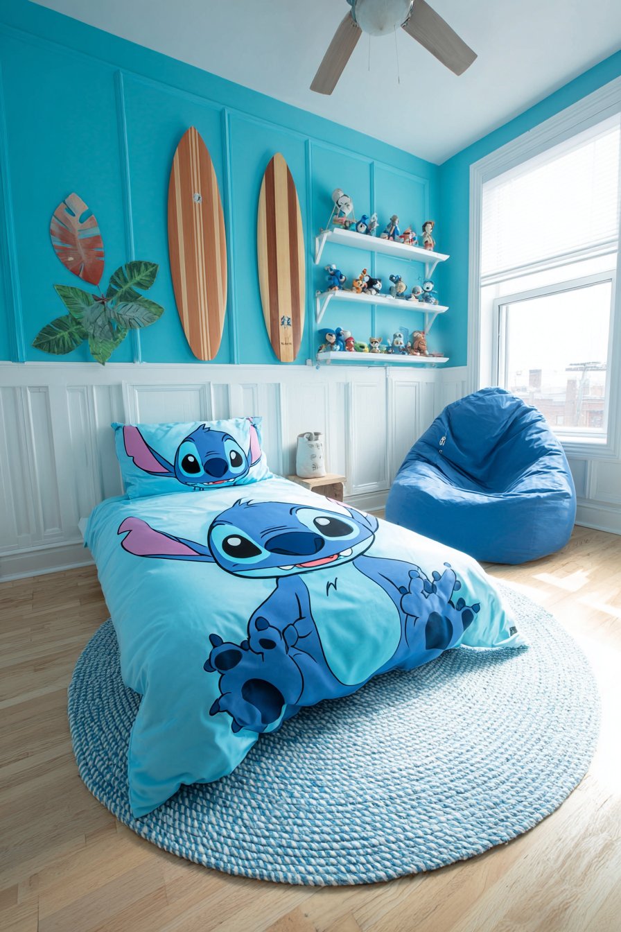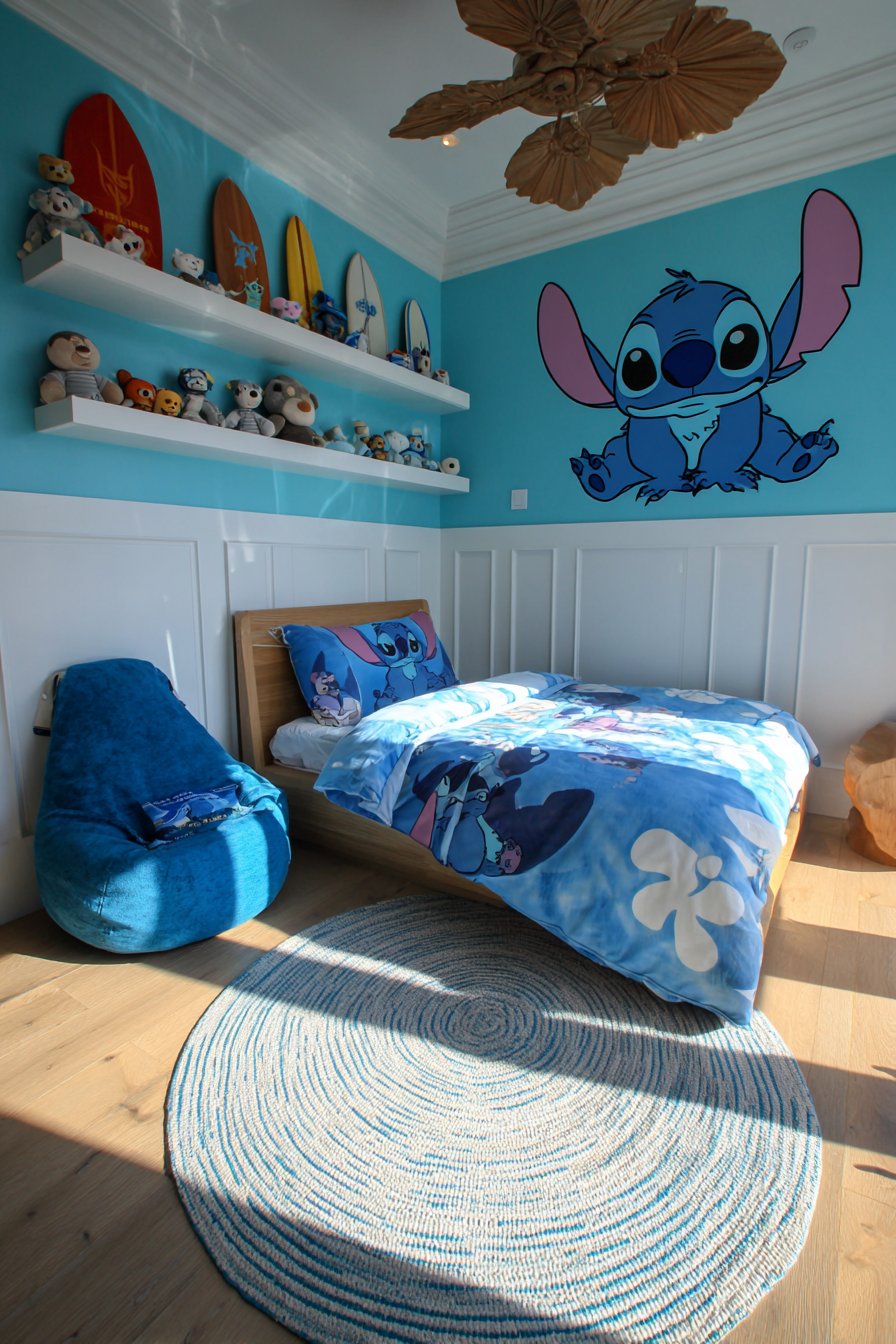 Bright turquoise walls create vibrant, energetic atmosphere. White wainscoting adds architectural detail and visual break. The twin bed features a Stitch riding surfboard graphic. This combines character love with sports interests. White shelving displays Stitch toys alongside decorative surfboards.