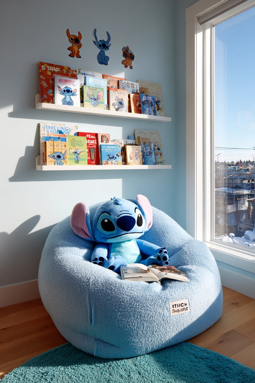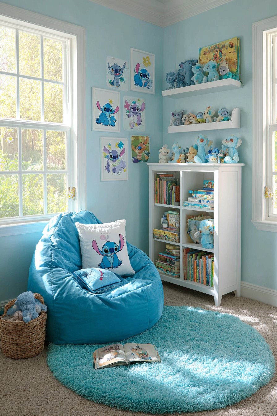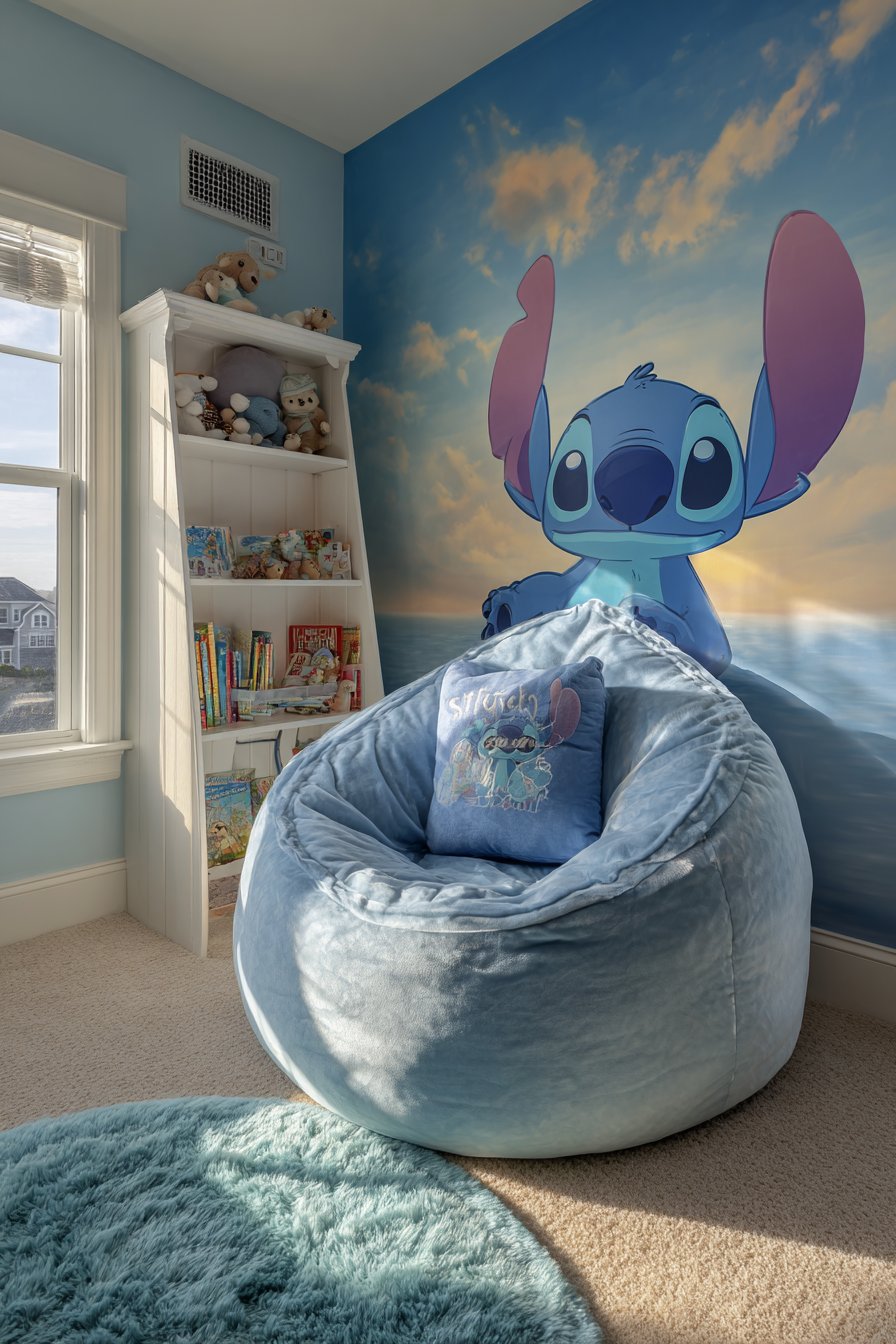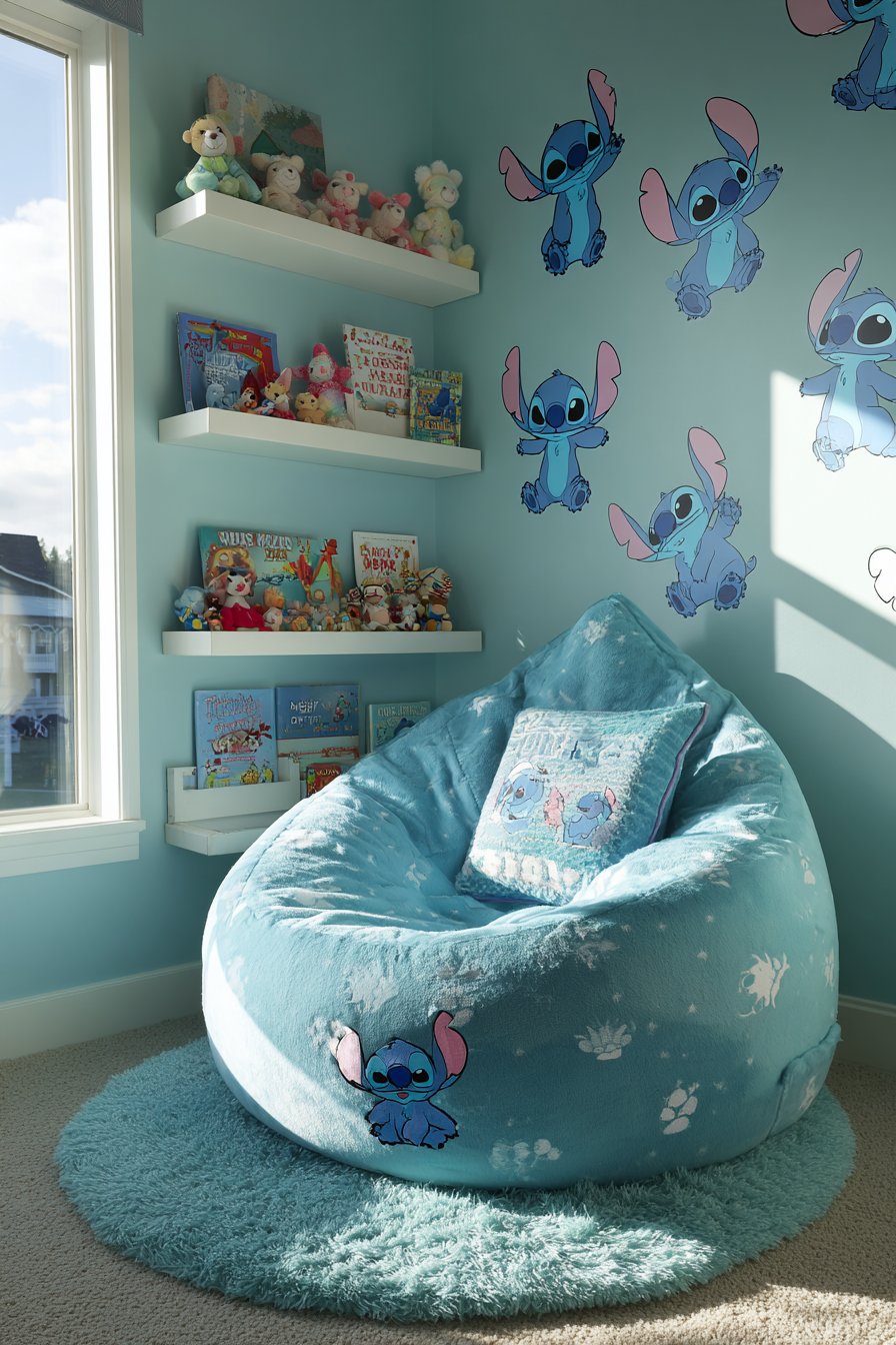A dedicated reading nook creates a special corner for quiet time. The blue bean bag chair features Stitch embroidery details. This provides comfortable seating for extended reading sessions. The chair molds to small bodies perfectly. Kids naturally gravitate toward this cozy spot.