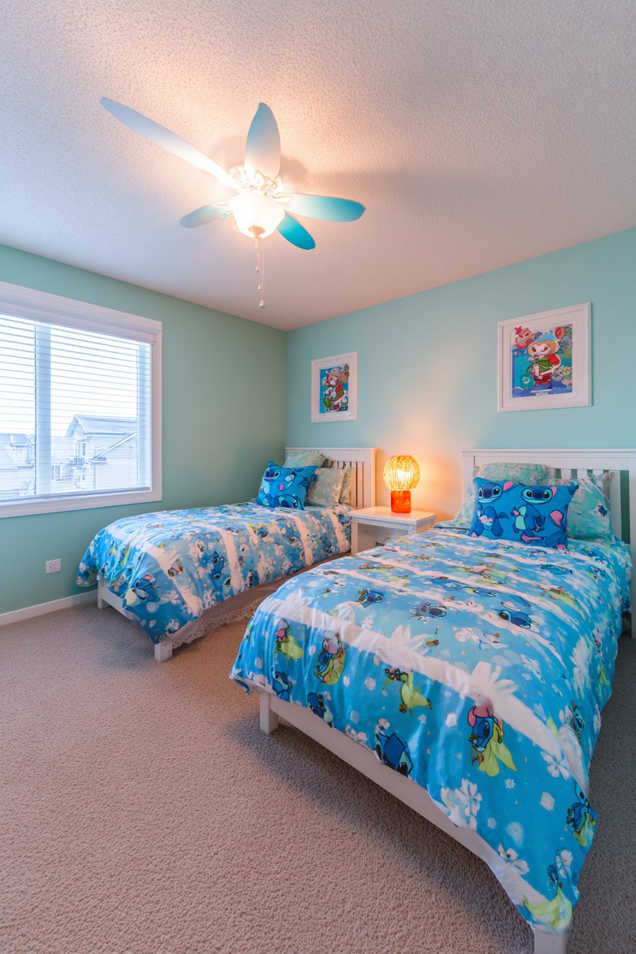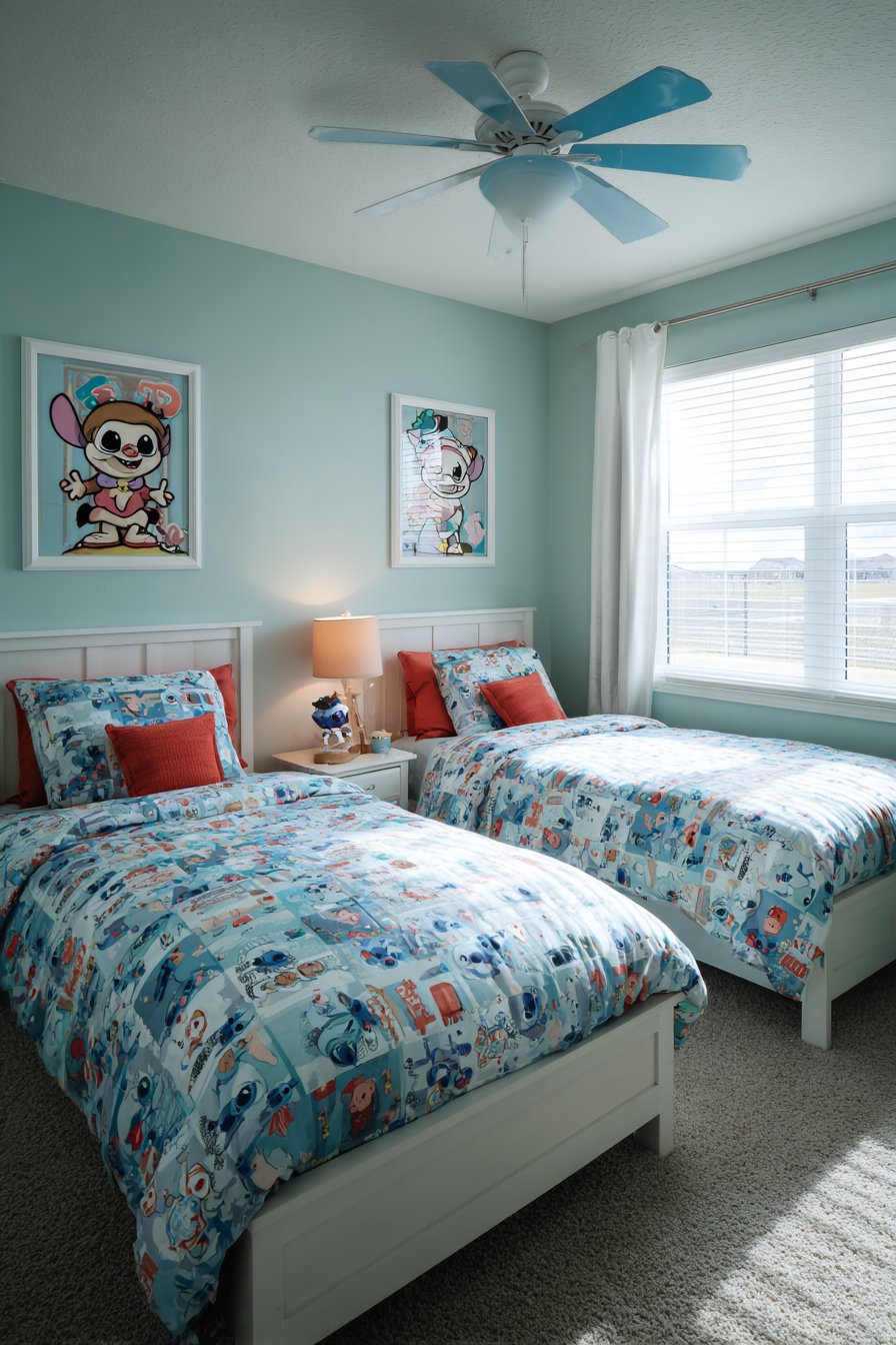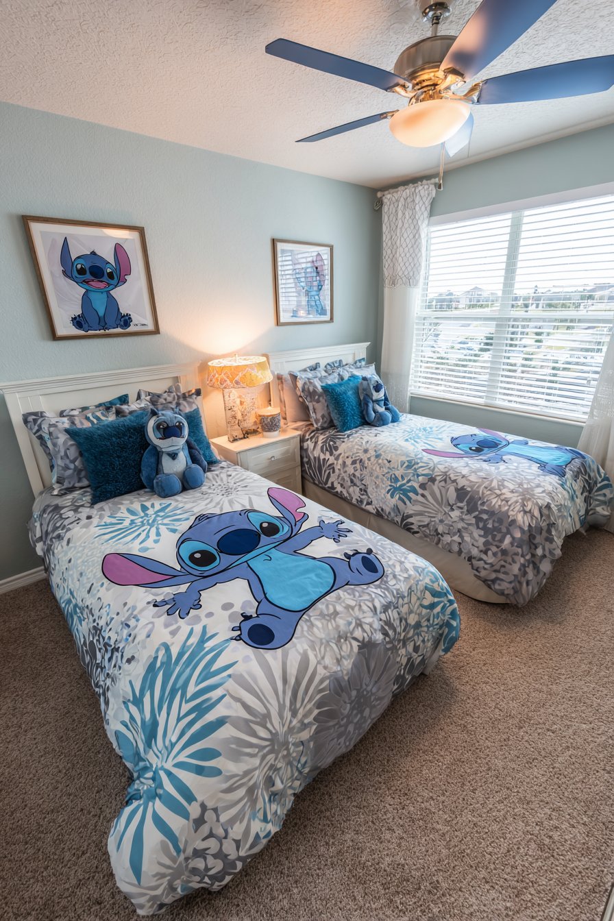 Matching twin beds create perfect shared bedroom solutions. Each bed features Stitch bedding sets with character-printed duvet covers. Vibrant blue and white patterns coordinate beautifully. The symmetrical arrangement promotes fairness between siblings. Both children enjoy equal visual prominence.