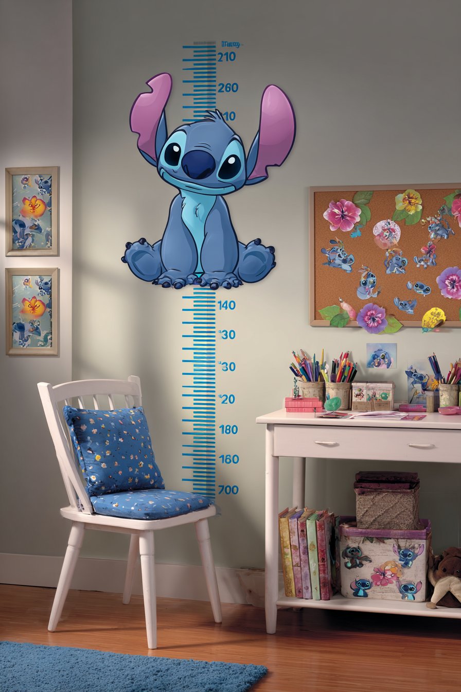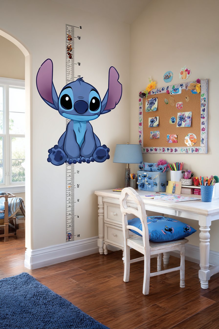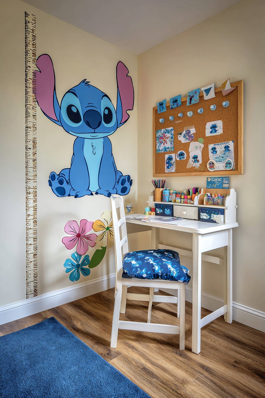 A custom Stitch growth chart decal climbs the wall vertically. The measurement tool rises from floor to six feet. Tropical flower accents enhance the design beautifully. Children love tracking their height progress regularly. This functional element doubles as engaging wall art.